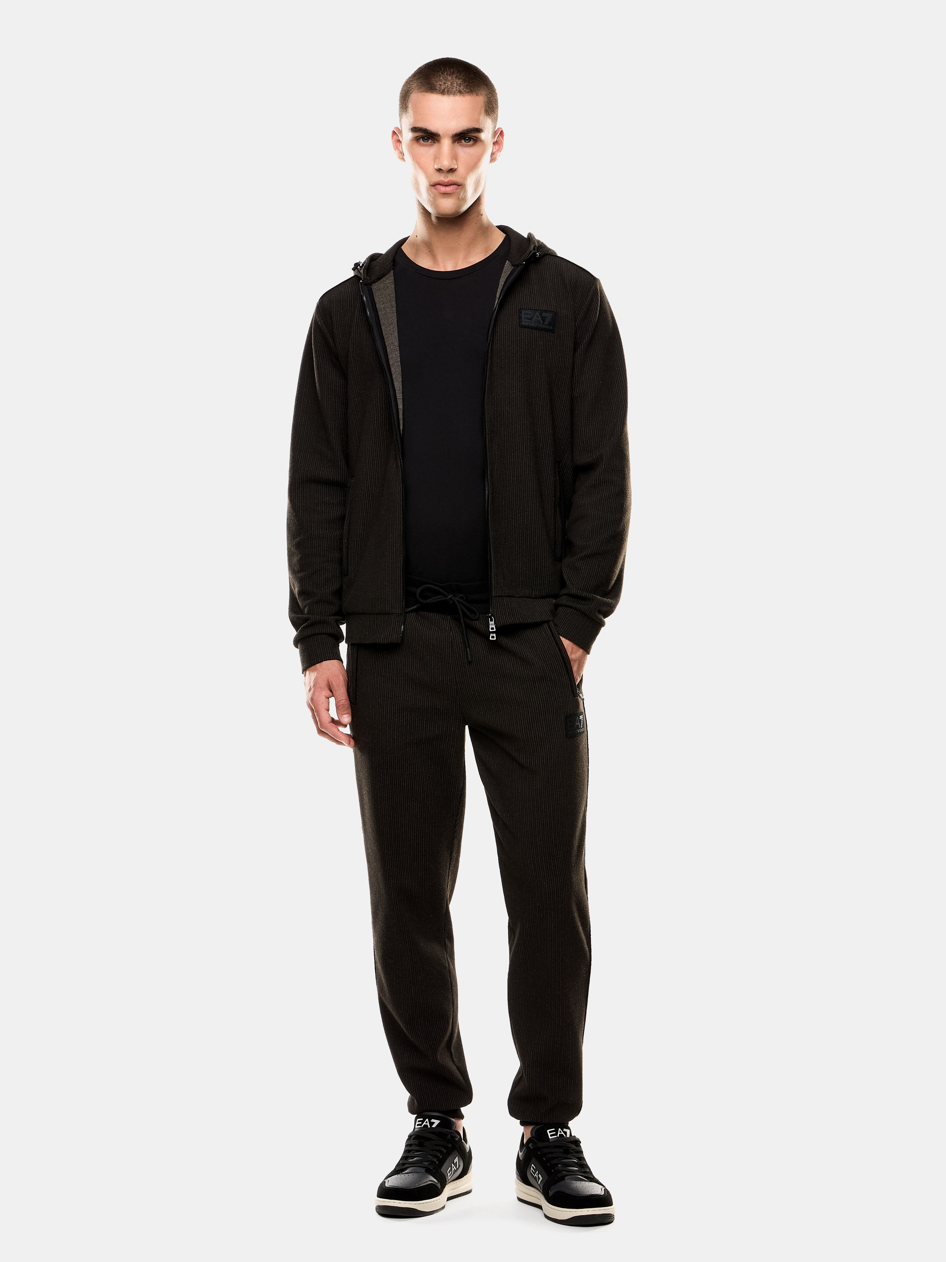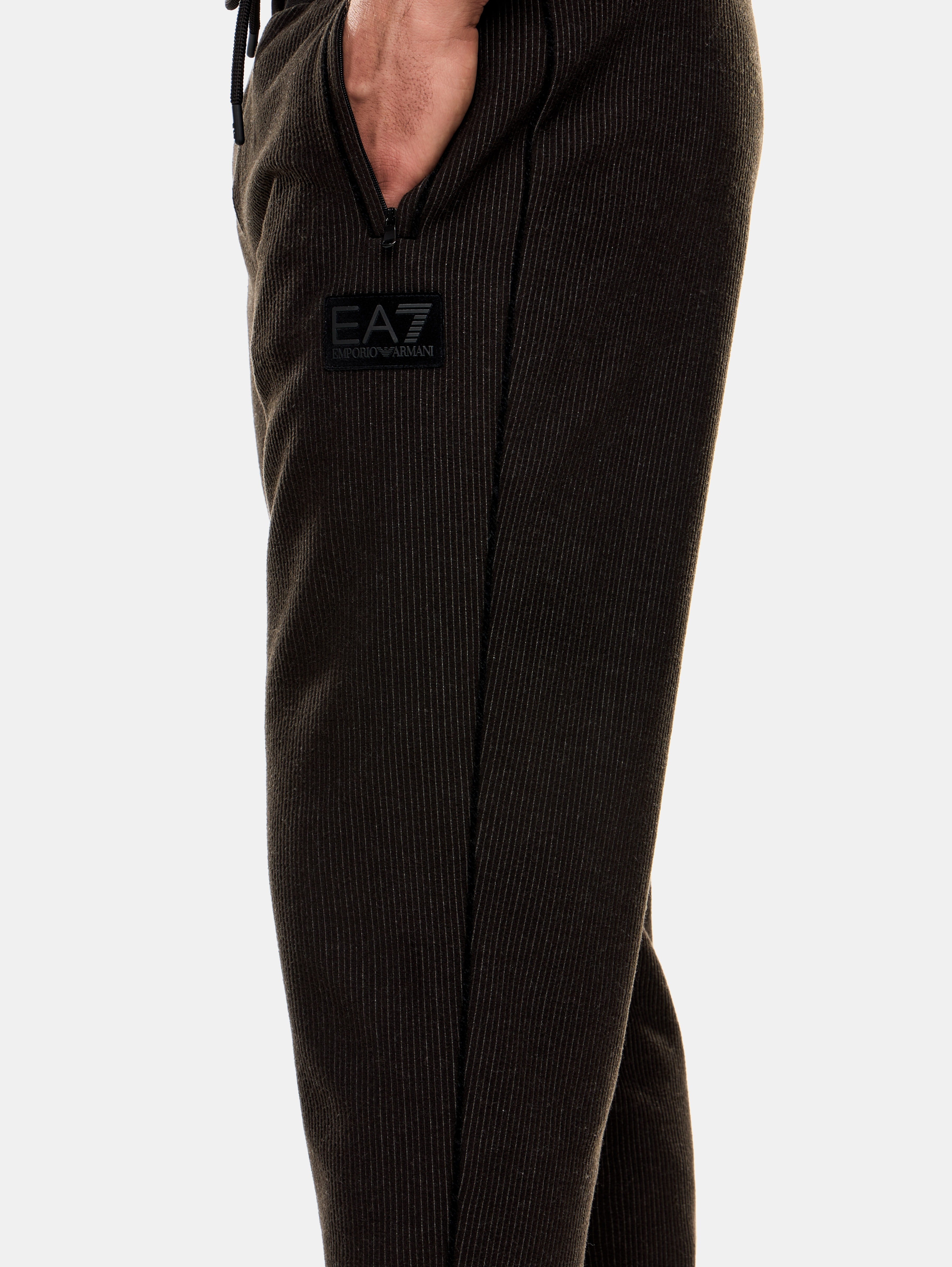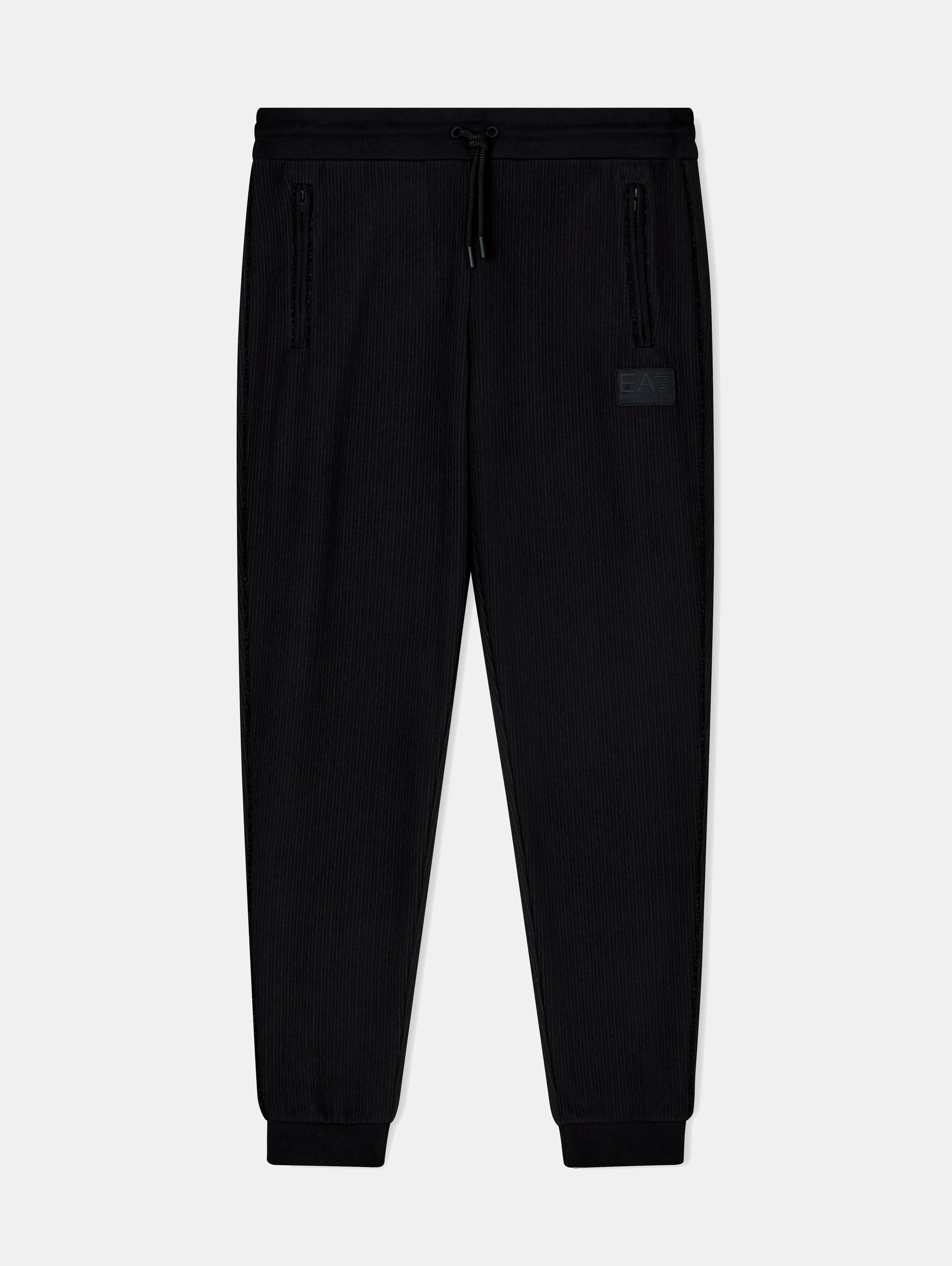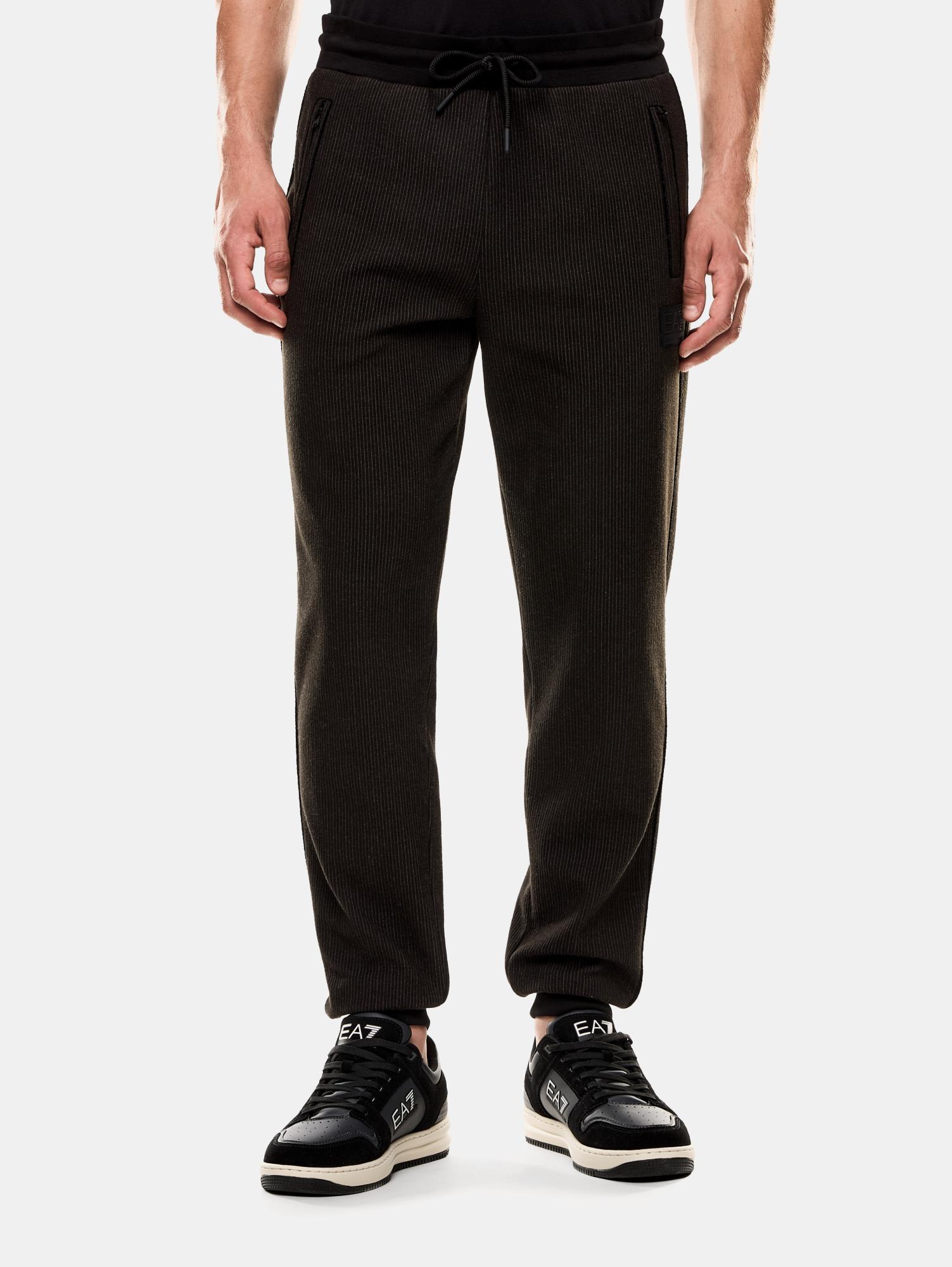 Мужские спортивные брюки EA7 Lux Identity чёрного цвета выполнены из мягкой смеси полиэстера, вискозы и эластана. Модель зауженного кроя с манжетами и боковыми карманами на молнии обеспечивает комфорт и свободу движений. Идеально сочетаются с толстовками из коллекции и подойдут как для тренировок, так и для активного отдыха.
