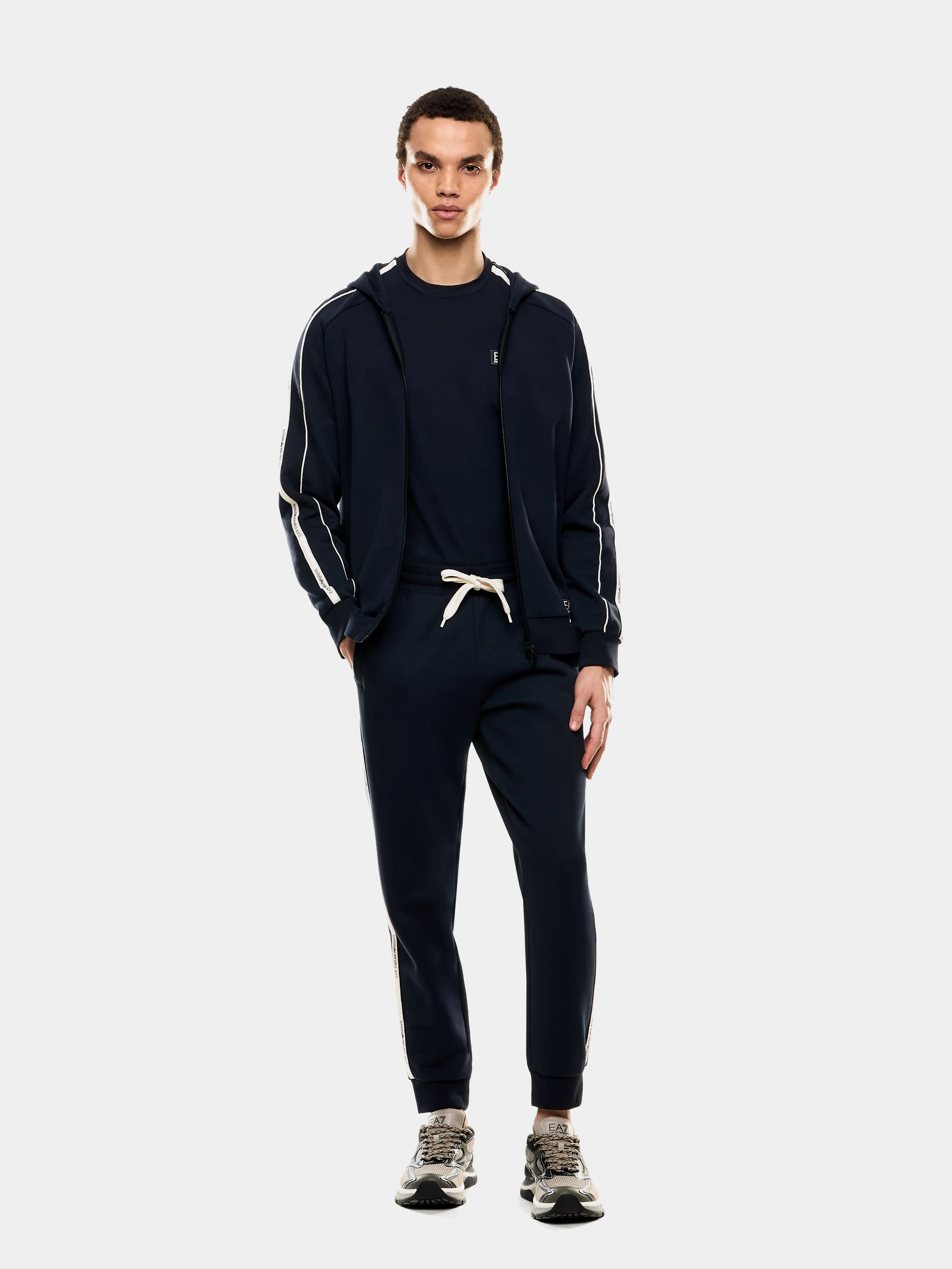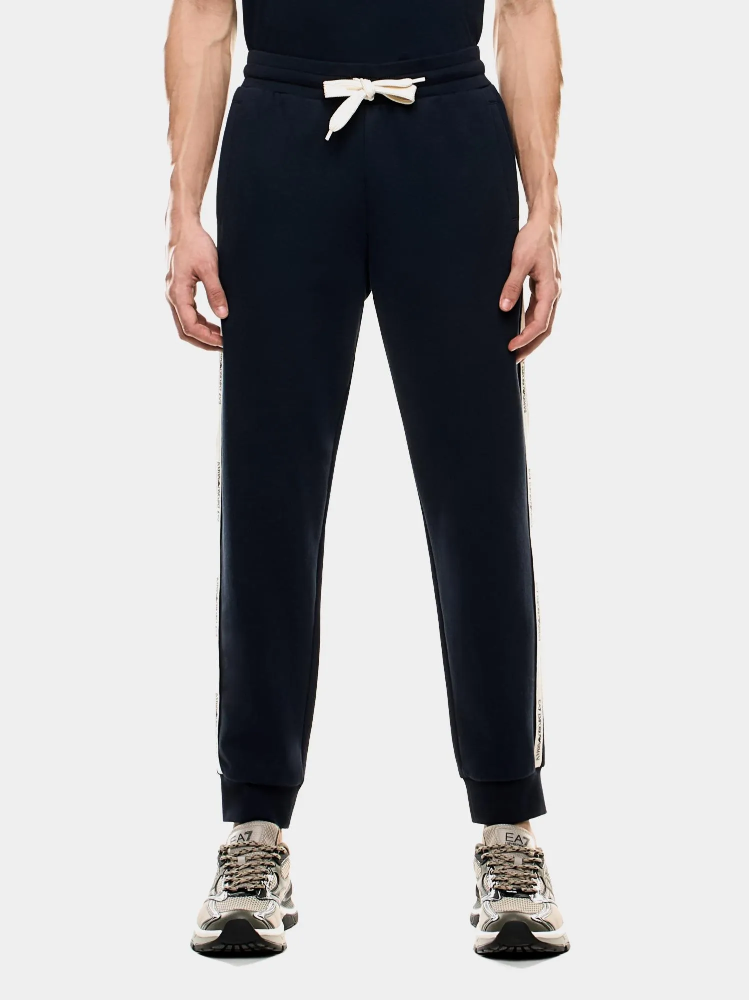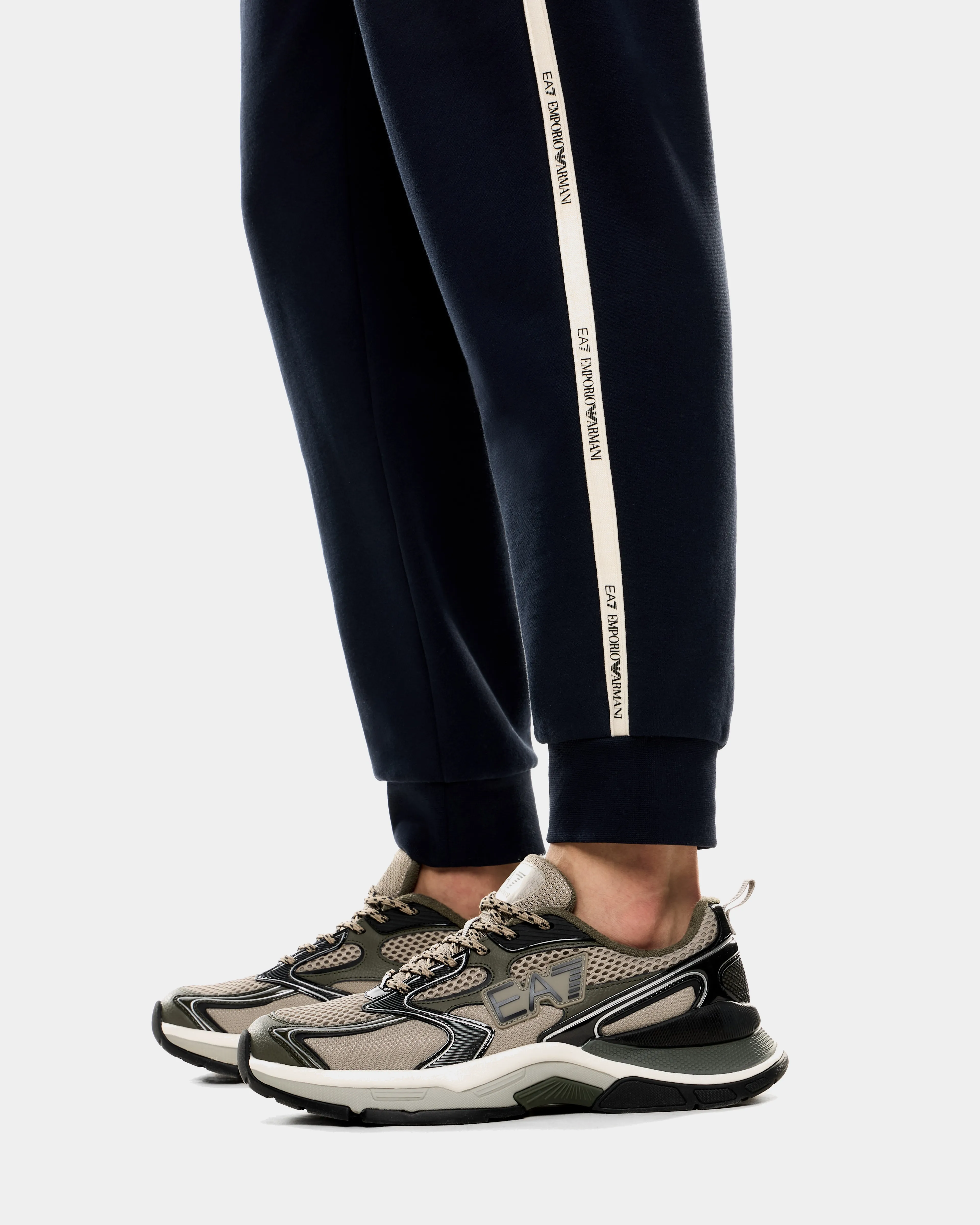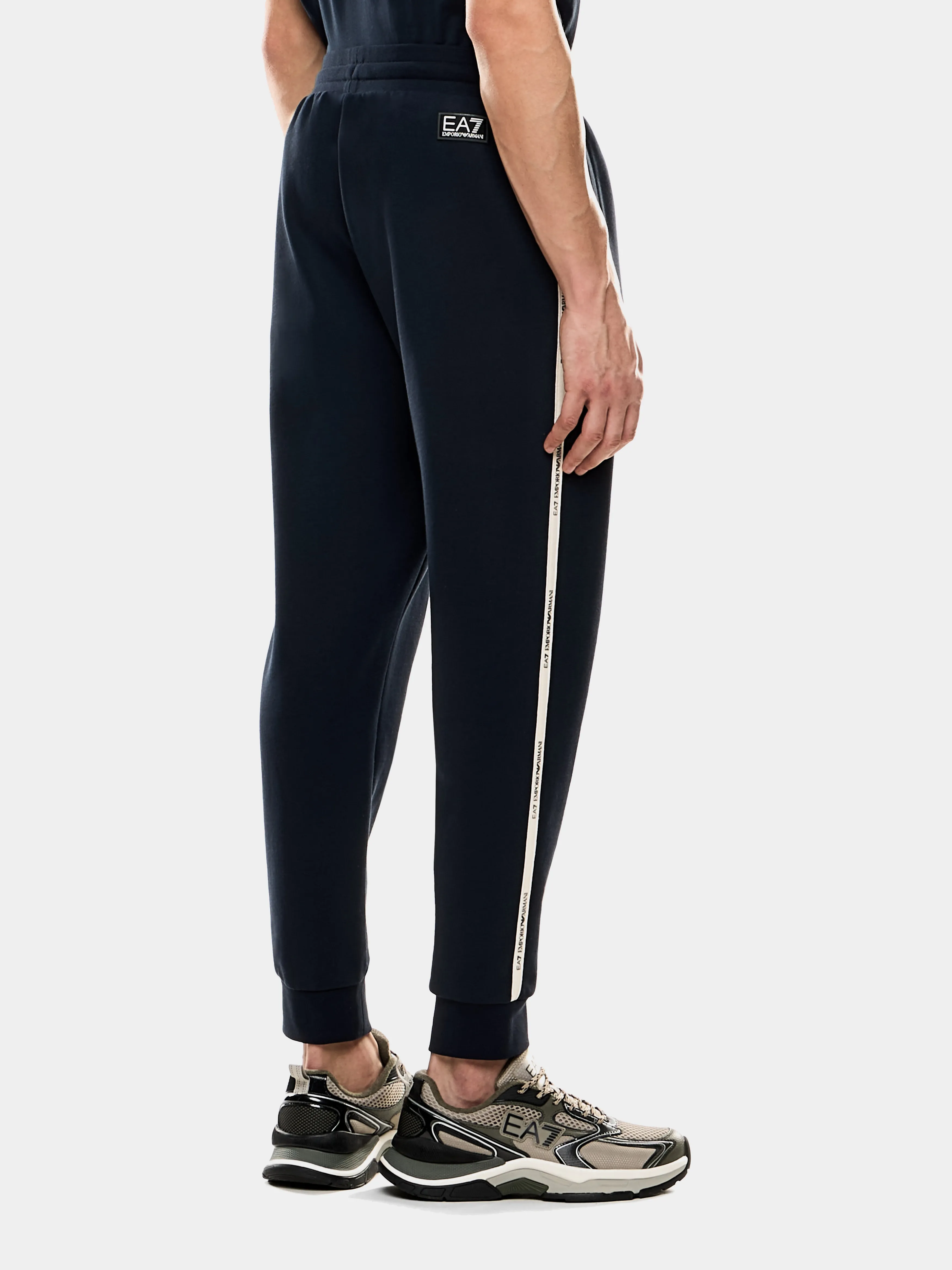Мужские джоггеры из мягкой хлопковой смеси, зауженного кроя с манжетами. Эластичный пояс со шнурком, боковые карманы и контрастный логотип EA7. Комфортная модель для динамичных повседневных образов и отдыха.