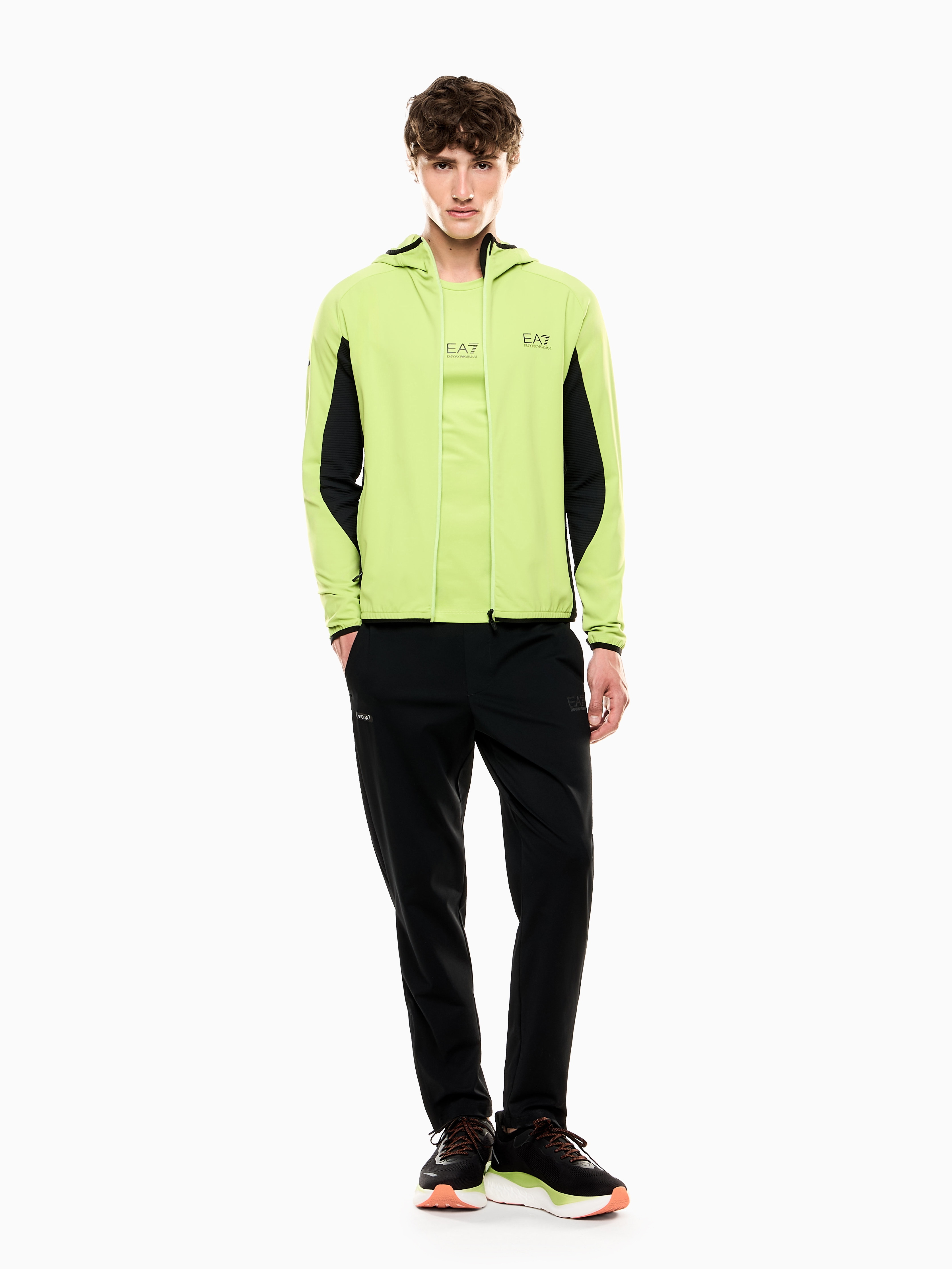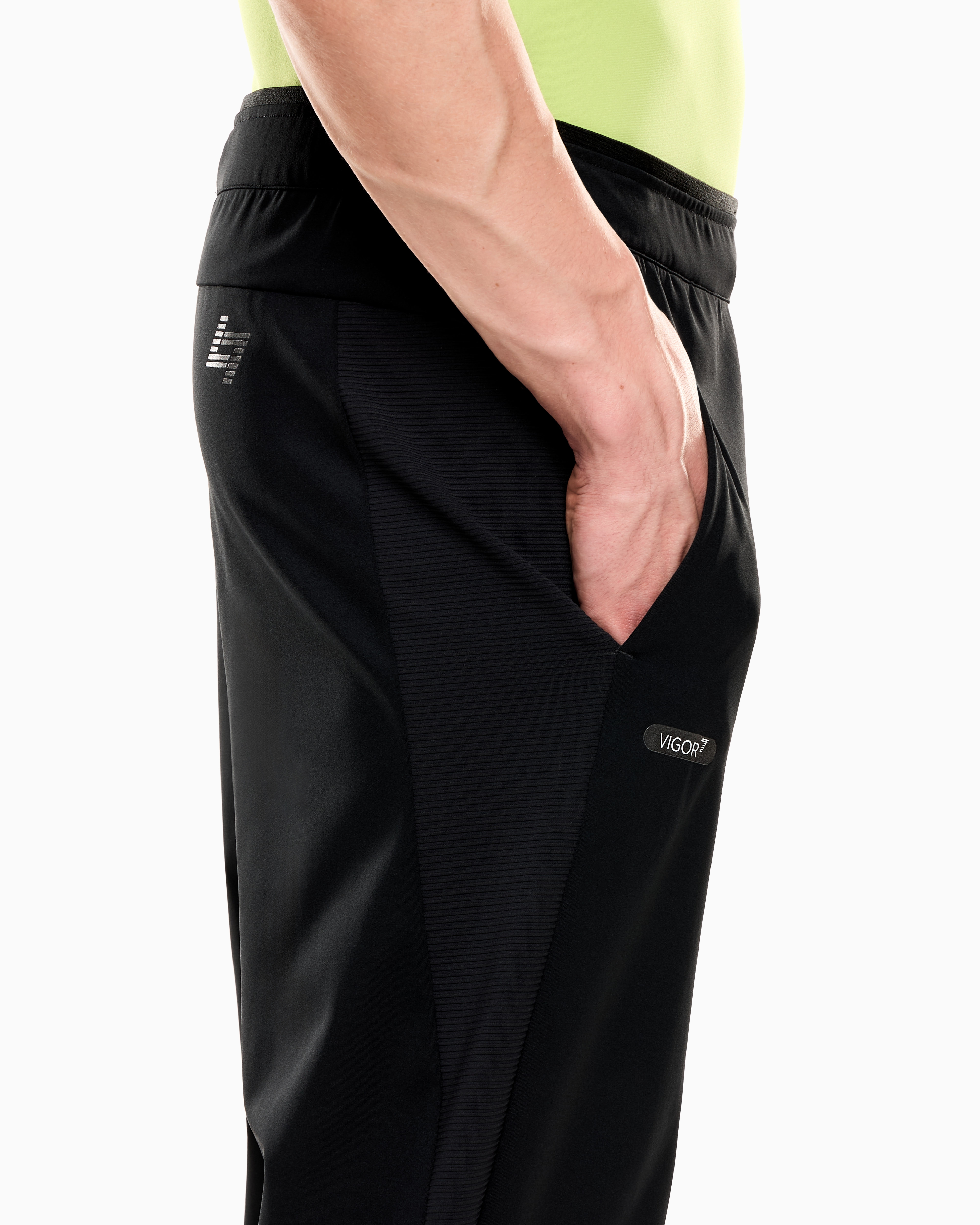 Мужские спортивные брюки super slim fit ультра прилегающего кроя выполнены из технологичной ткани VIGOR7. Инновационная технология усиливает каждое движение, снижает вибрацию мышц и способствует повышению выносливости за счёт эффективного распределения энергии. Модель разработана для интенсивных тренировок и дополнена сетчатыми вставками, светоотражающими элементами и контрастным логотипом бренда, подчёркивающим спортивный характер.