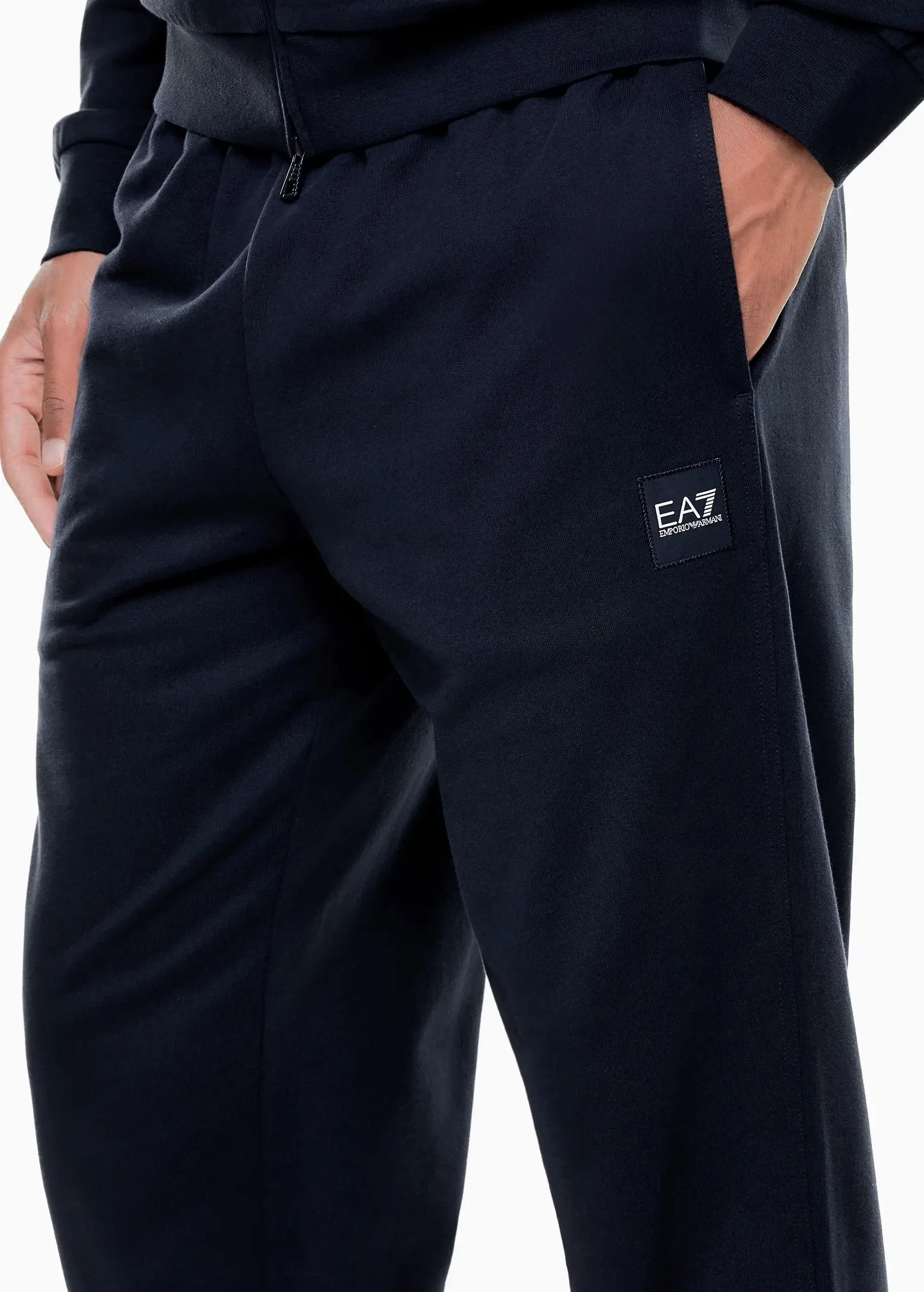 Мужской спортивный костюм EA7 темно-синего цвета из мягкого хлопка сочетает лёгкость, комфорт и свободу движений — идеальный выбор на каждый день, для тренировок и активного отдыха. Толстовка на молнии и брюки с манжетами создают удобный и универсальный комплект, а лаконичный дизайн с вышитым логотипом подчёркивает фирменный стиль бренда.