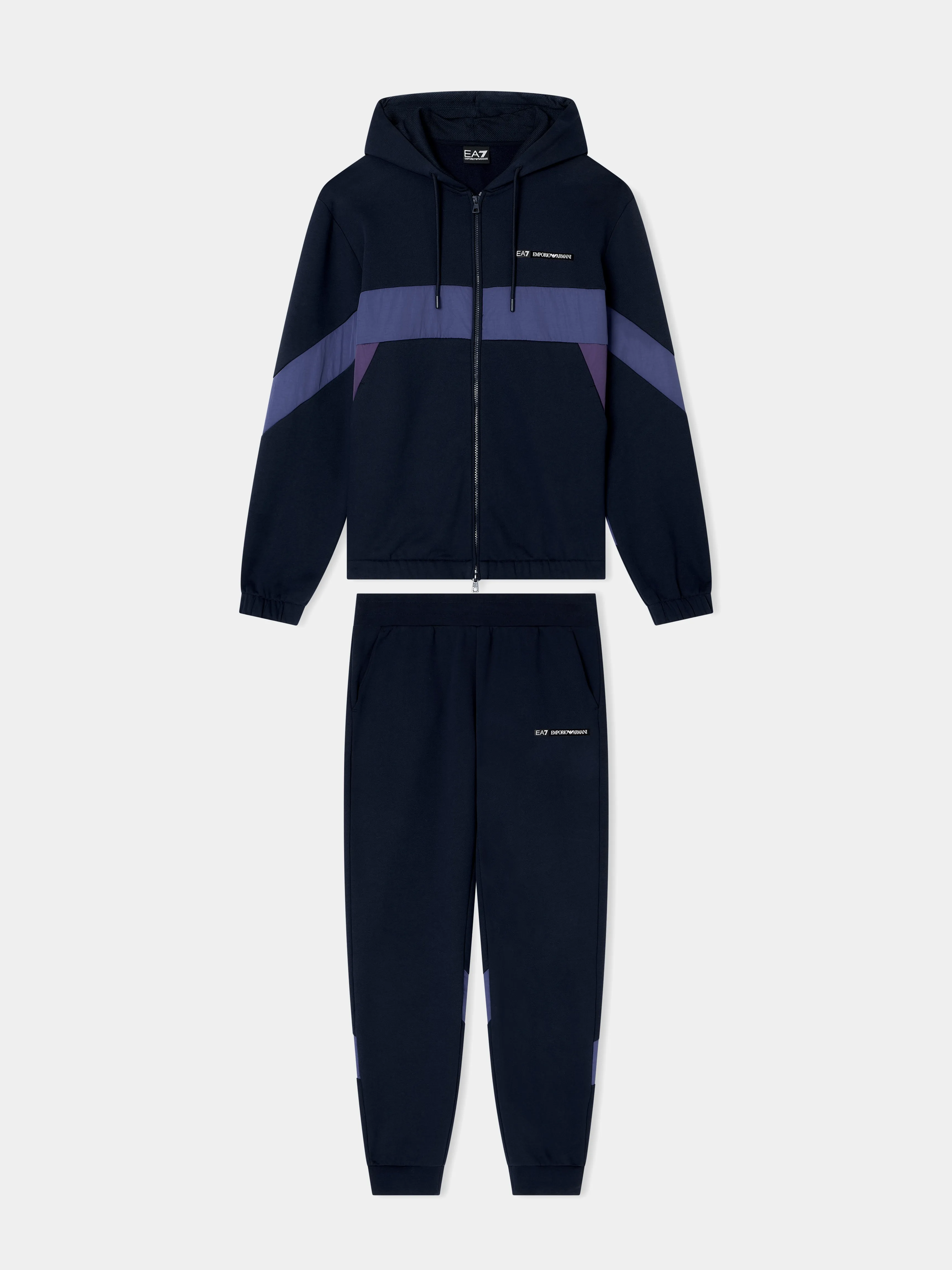 Мужской спортивный костюм EA7 Athletic Colour Block темно-синего цвета из мягкой эластичной хлопковой смеси сочетает комфорт и динамичный дизайн. Толстовка на молнии с капюшоном и брюки-джоггеры с боковыми карманами оформлены контрастными вставками и фирменными нашивками EA7, создающими выразительный и энергичный образ.