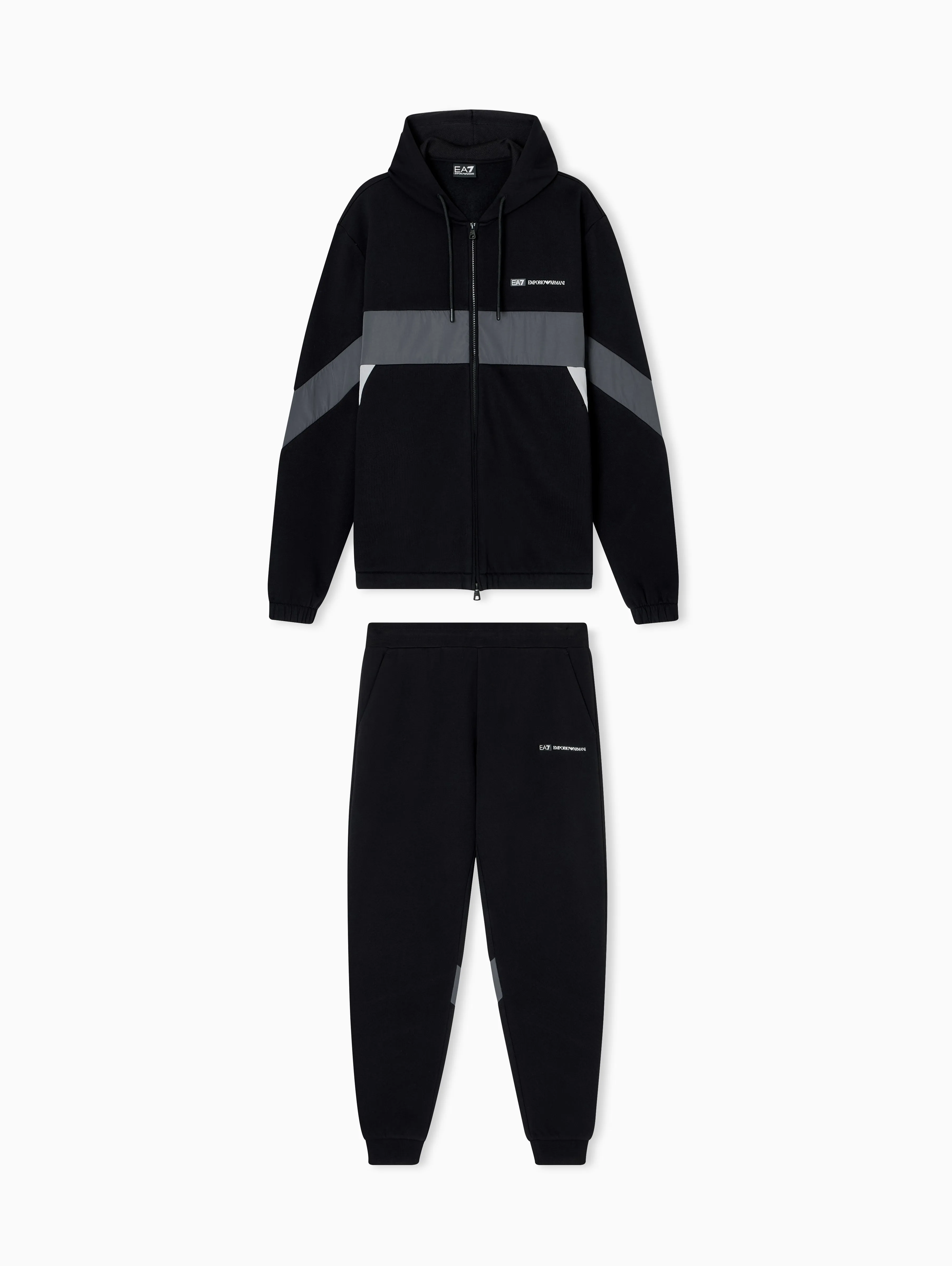 Мужской спортивный костюм EA7 Athletic Colour Block из мягкого эластичного смесового хлопка сочетает комфорт и динамичный дизайн. Толстовка на молнии с капюшоном и брюки-джоггеры с боковыми карманами оформлены контрастными вставками и фирменными нашивками EA7, создающими выразительный и энергичный образ.