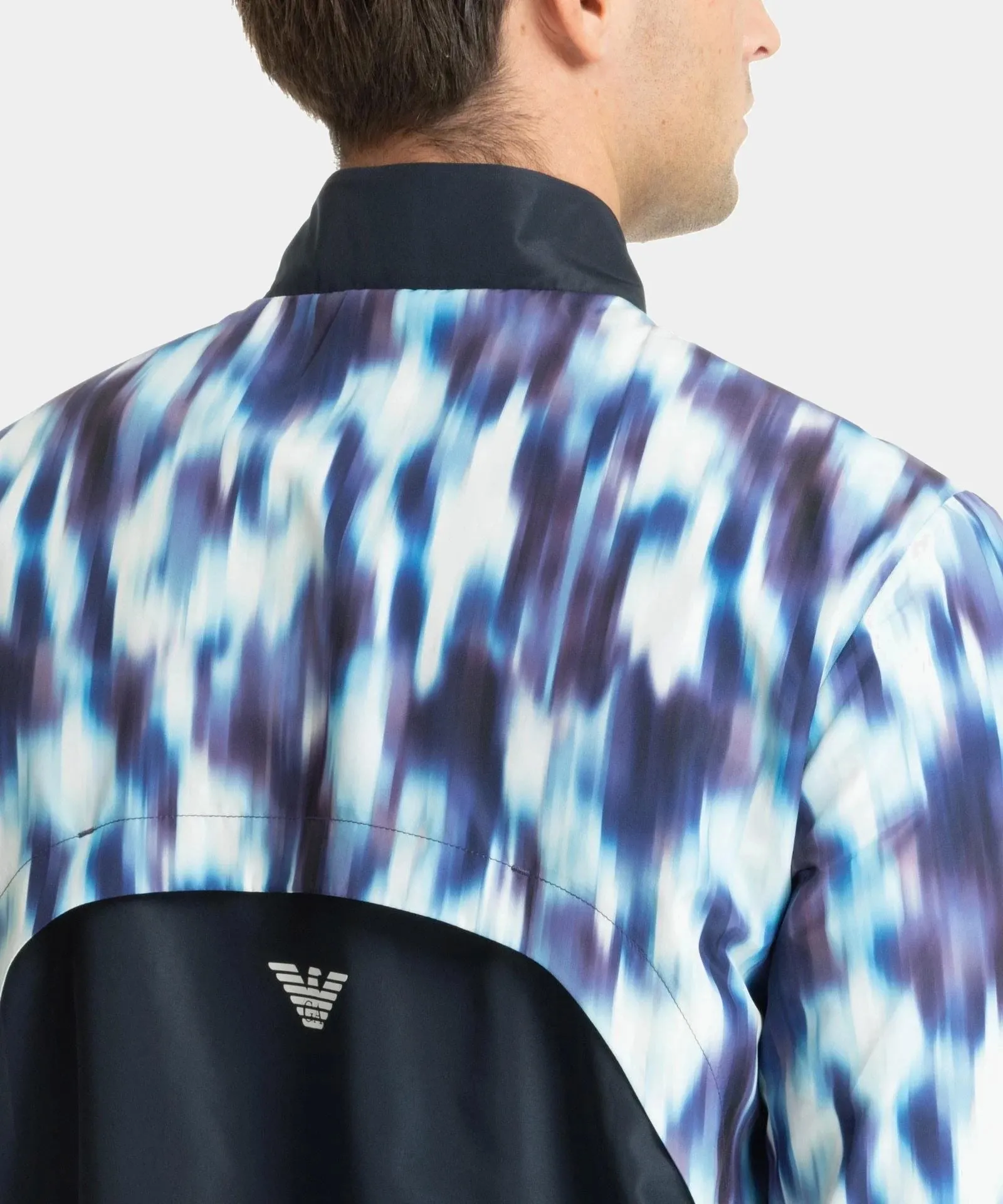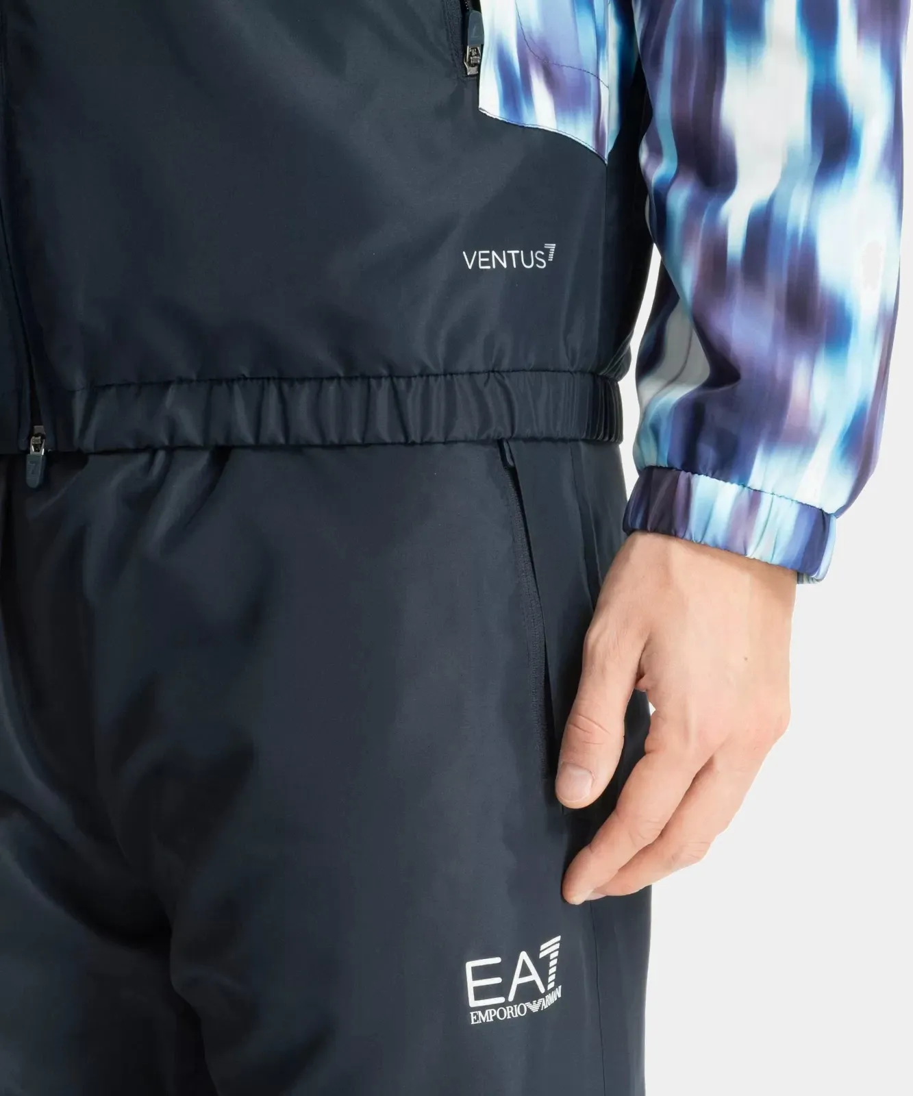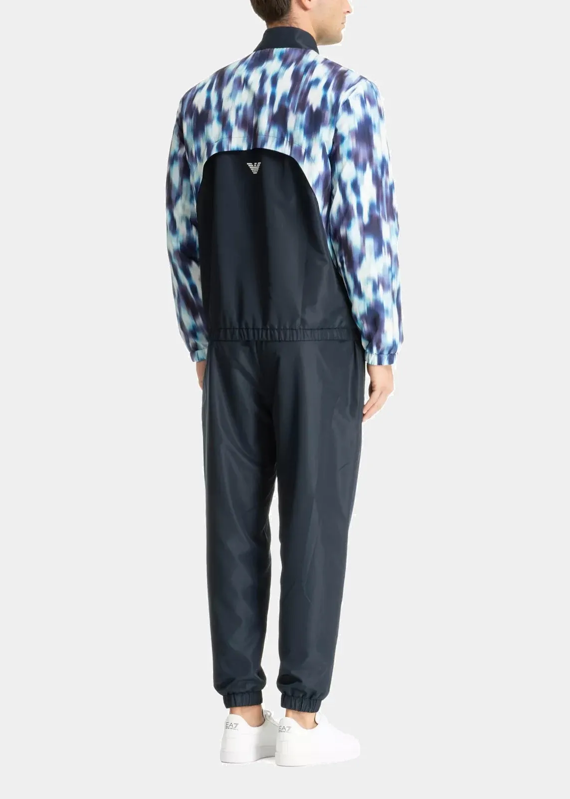 Костюм состоит из олимпийки с молнией и боковыми карманами на застёжке, а также джоггеров с эластичной талией, принтом коллекции и двумя карманами на молнии. Контрастные логотипы EA7 завершают образ, добавляя спортивный акцент.