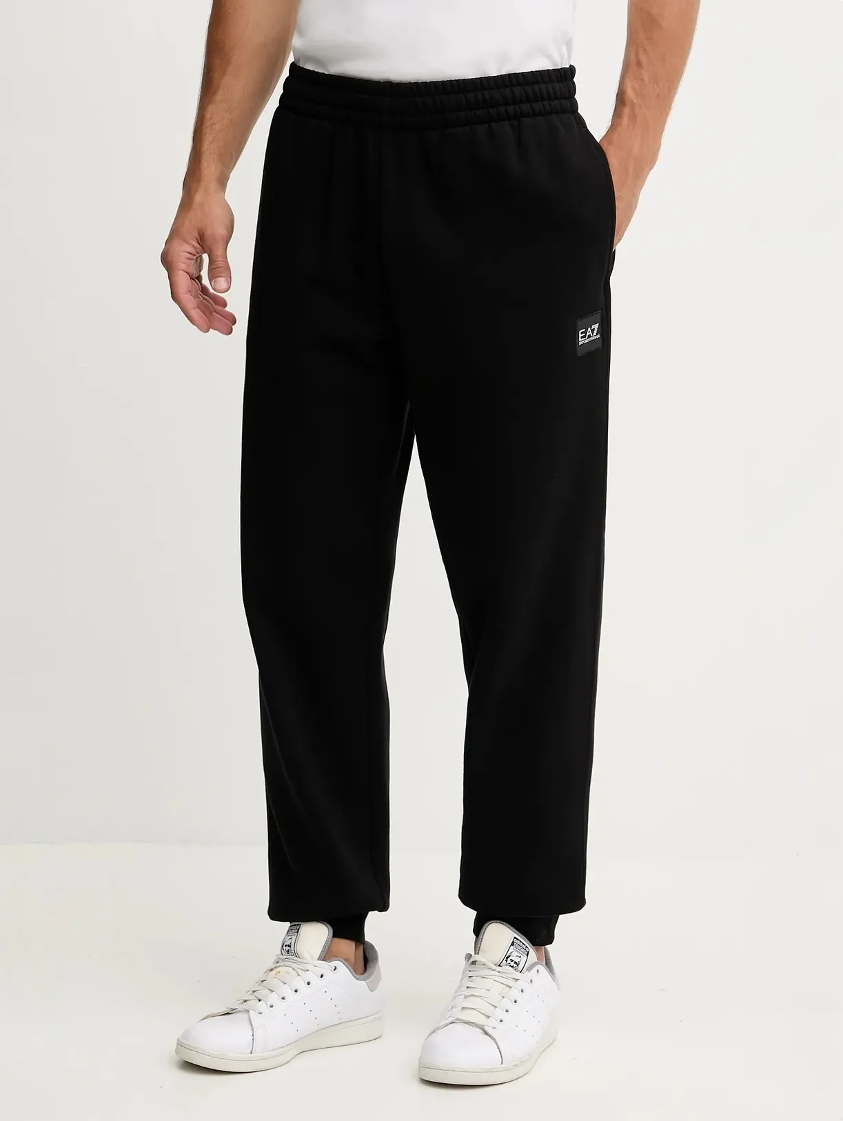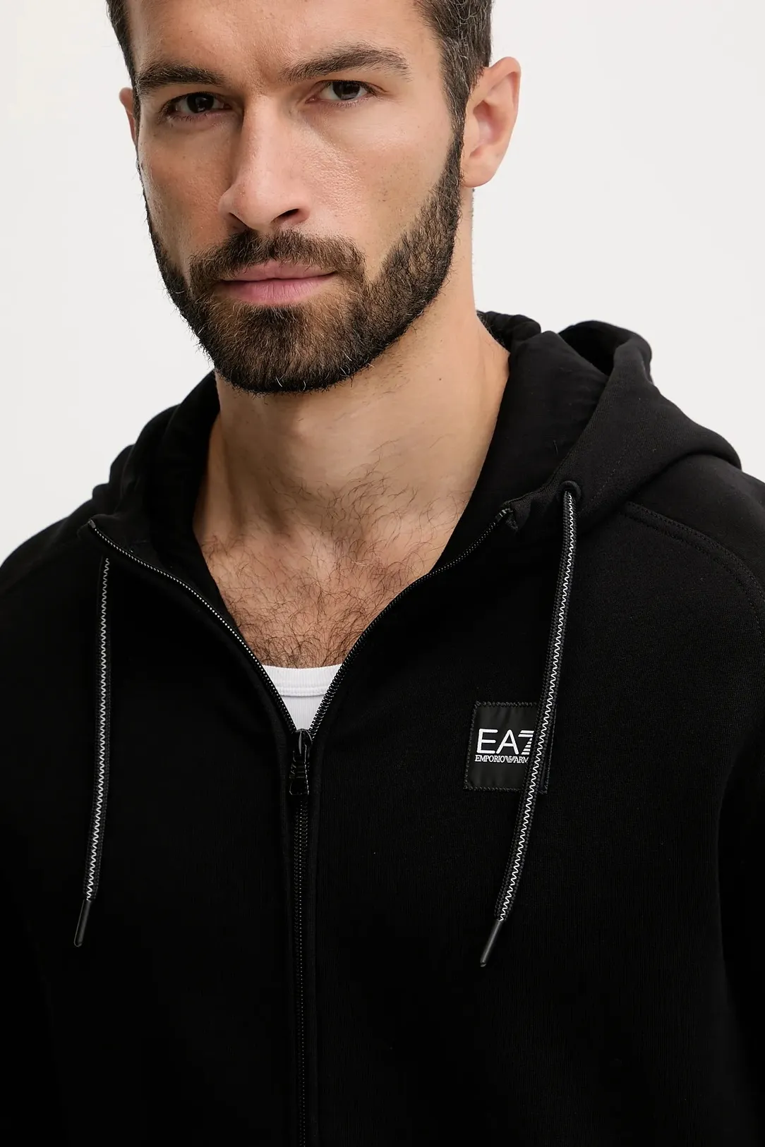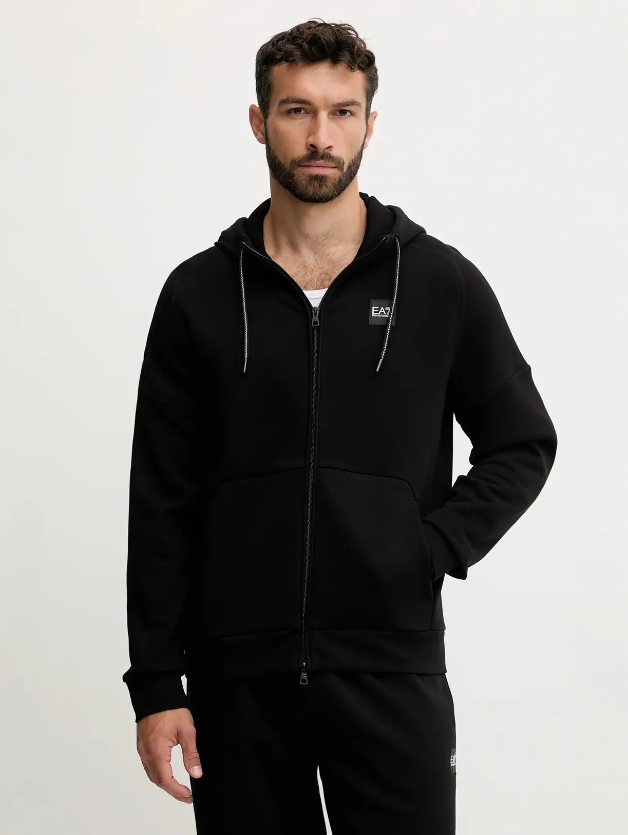 Мужской спортивный костюм EA7 чёрного цвета из хлопка и полиэстера сочетает лёгкость, комфорт и свободу движений — отличный выбор на каждый день, тренировки и активный отдых. Толстовка с капюшоном на молнии и рукавами-реглан в комплекте с брюками на манжетах формируют универсальный образ, а лаконичный дизайн с вышитым логотипом подчёркивает фирменный стиль бренда.
