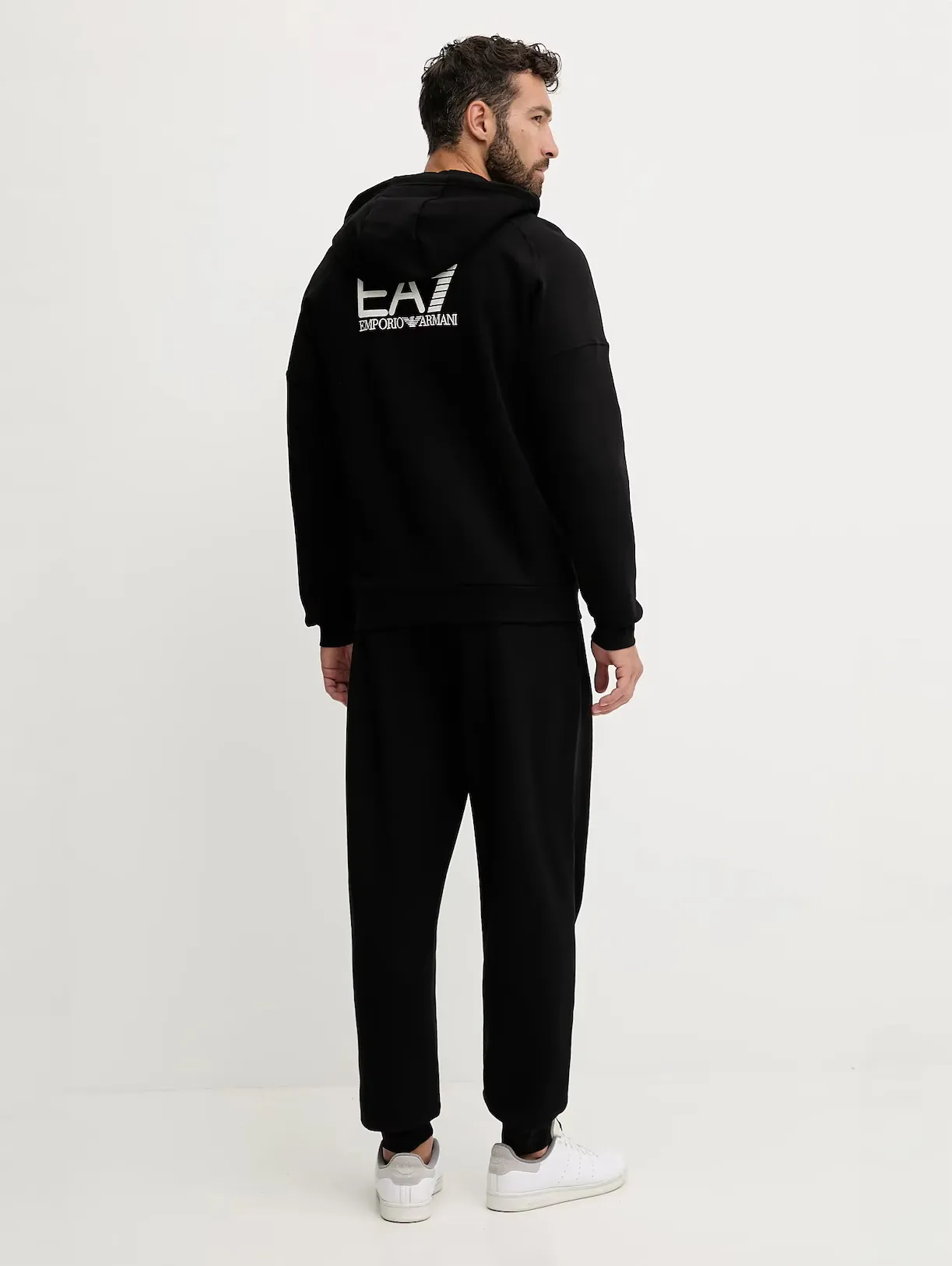 Мужской спортивный костюм EA7 чёрного цвета из хлопка и полиэстера сочетает лёгкость, комфорт и свободу движений — отличный выбор на каждый день, тренировки и активный отдых. Толстовка с капюшоном на молнии и рукавами-реглан в комплекте с брюками на манжетах формируют универсальный образ, а лаконичный дизайн с вышитым логотипом подчёркивает фирменный стиль бренда.