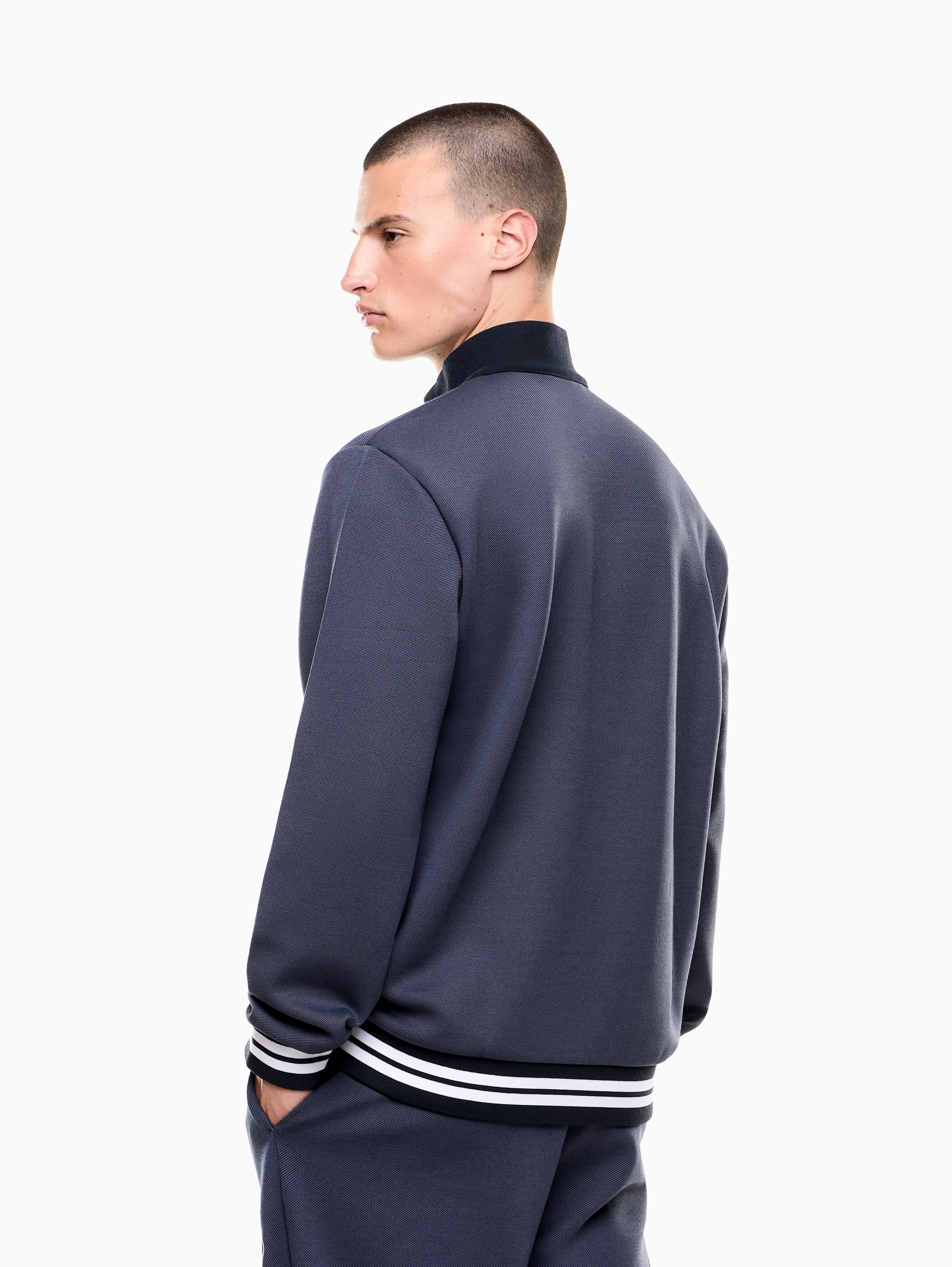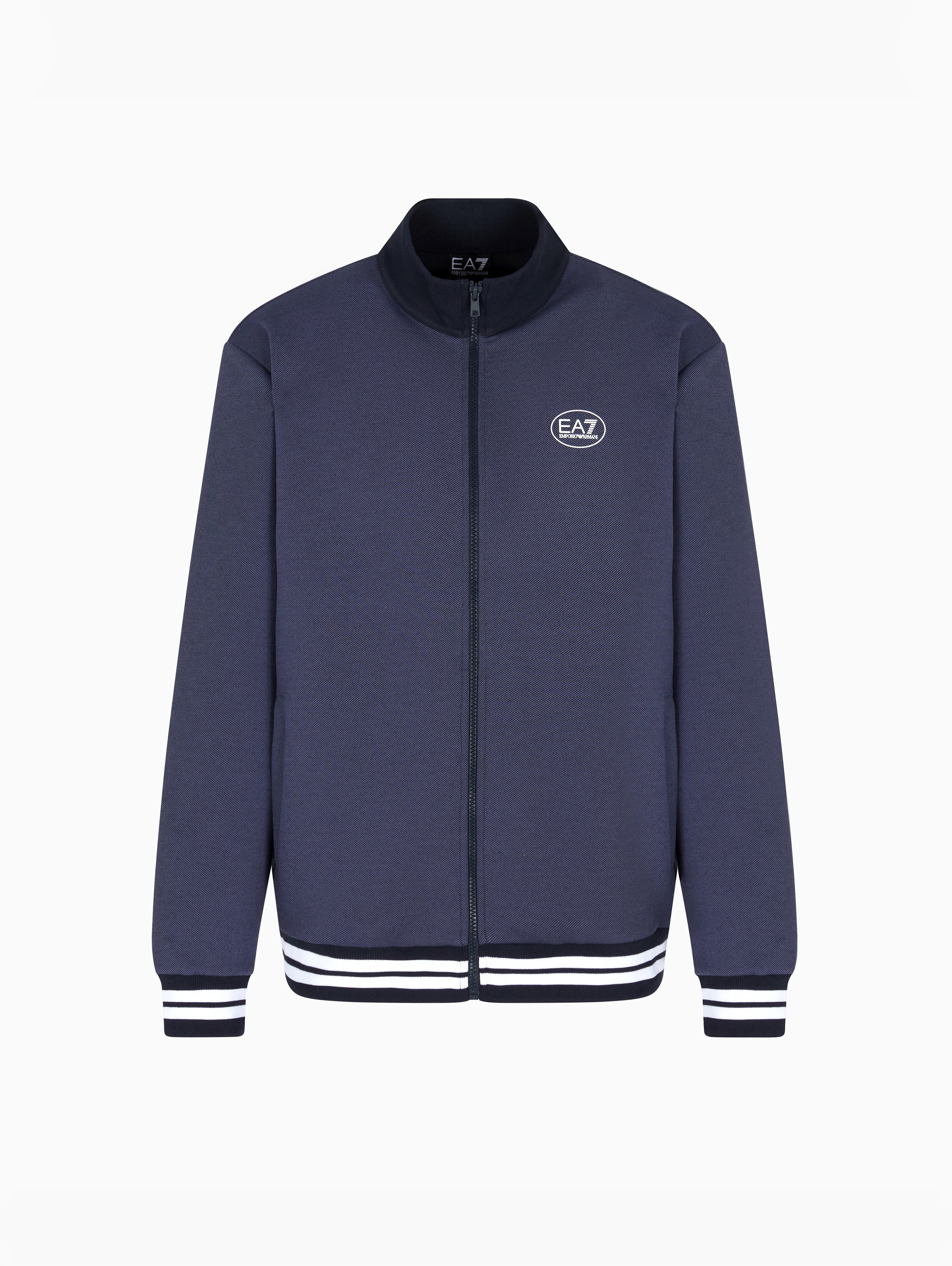 Мужская спортивная толстовка EA7 Emporio Armani тёмно-синего цвета без капюшона — функциональная и стильная модель прямого кроя, которая гармонично сочетается с брюками из коллекции TENNIS CLUB. Идеальна для тренировок, тенниса и активного отдыха. Выполнена из смеси полиэстера, вискозы и эластана, застёгивается на молнию и дополнена удобными боковыми карманами.
