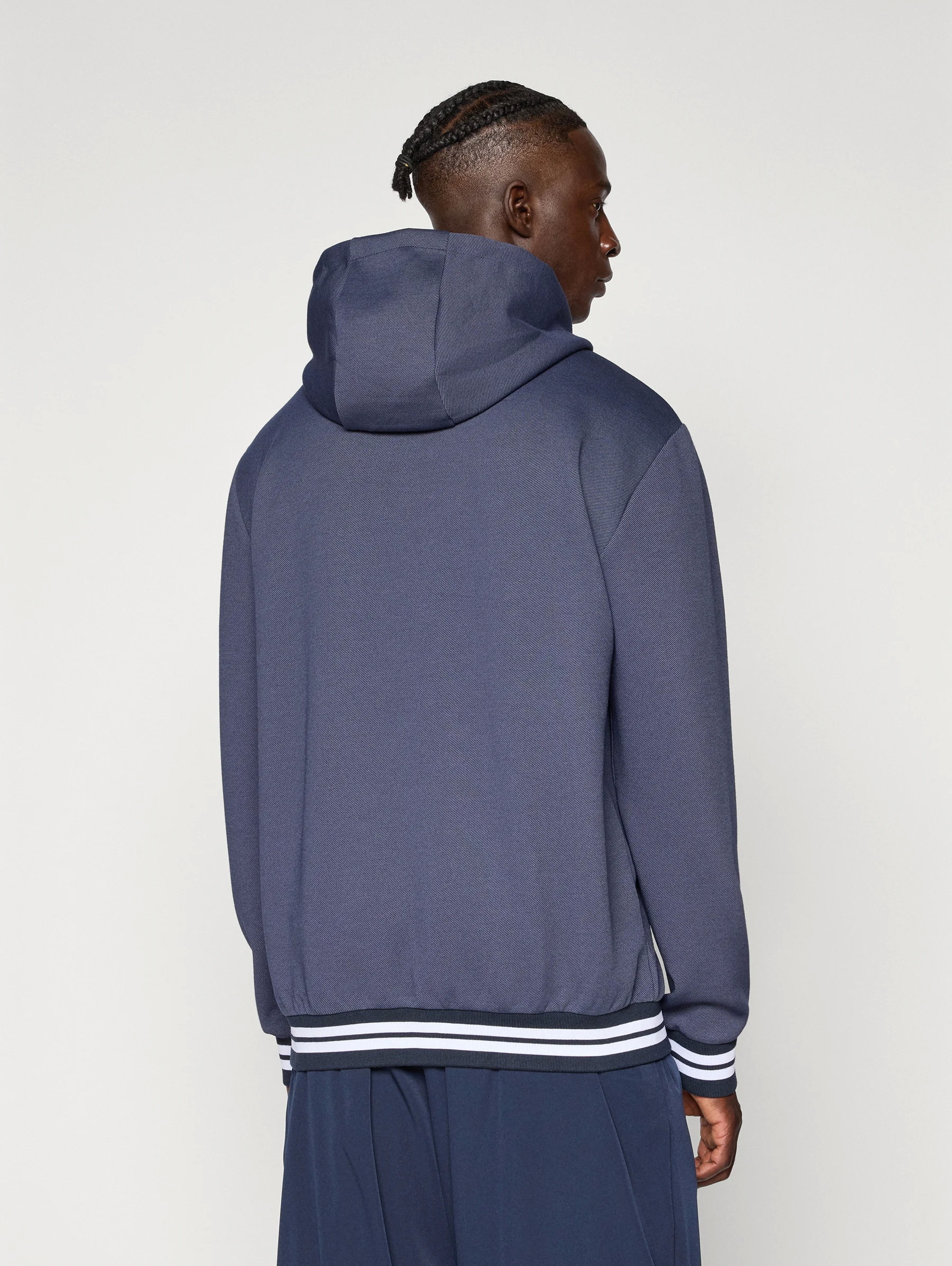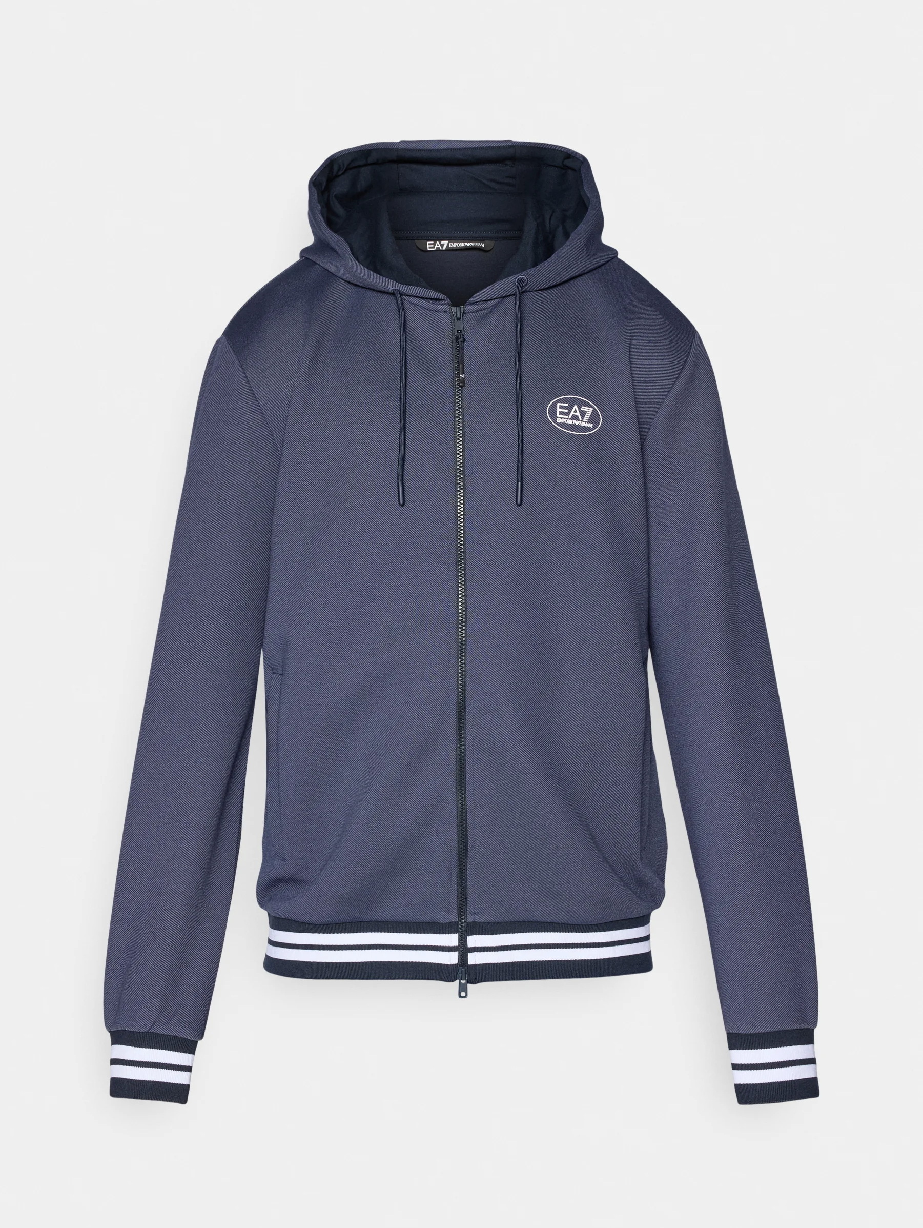Мужская спортивная толстовка с капюшоном EA7 Emporio Armani тёмно-синего цвета — функциональная и стильная модель прямого кроя, которая гармонично сочетается с брюками из коллекции TENNIS CLUB. Идеальна для тренировок, тенниса и активного отдыха. Выполнена из смеси полиэстера, вискозы и эластана, застёгивается на молнию и дополнена удобными боковыми карманами.