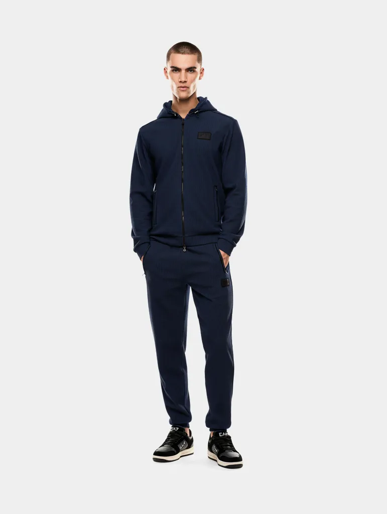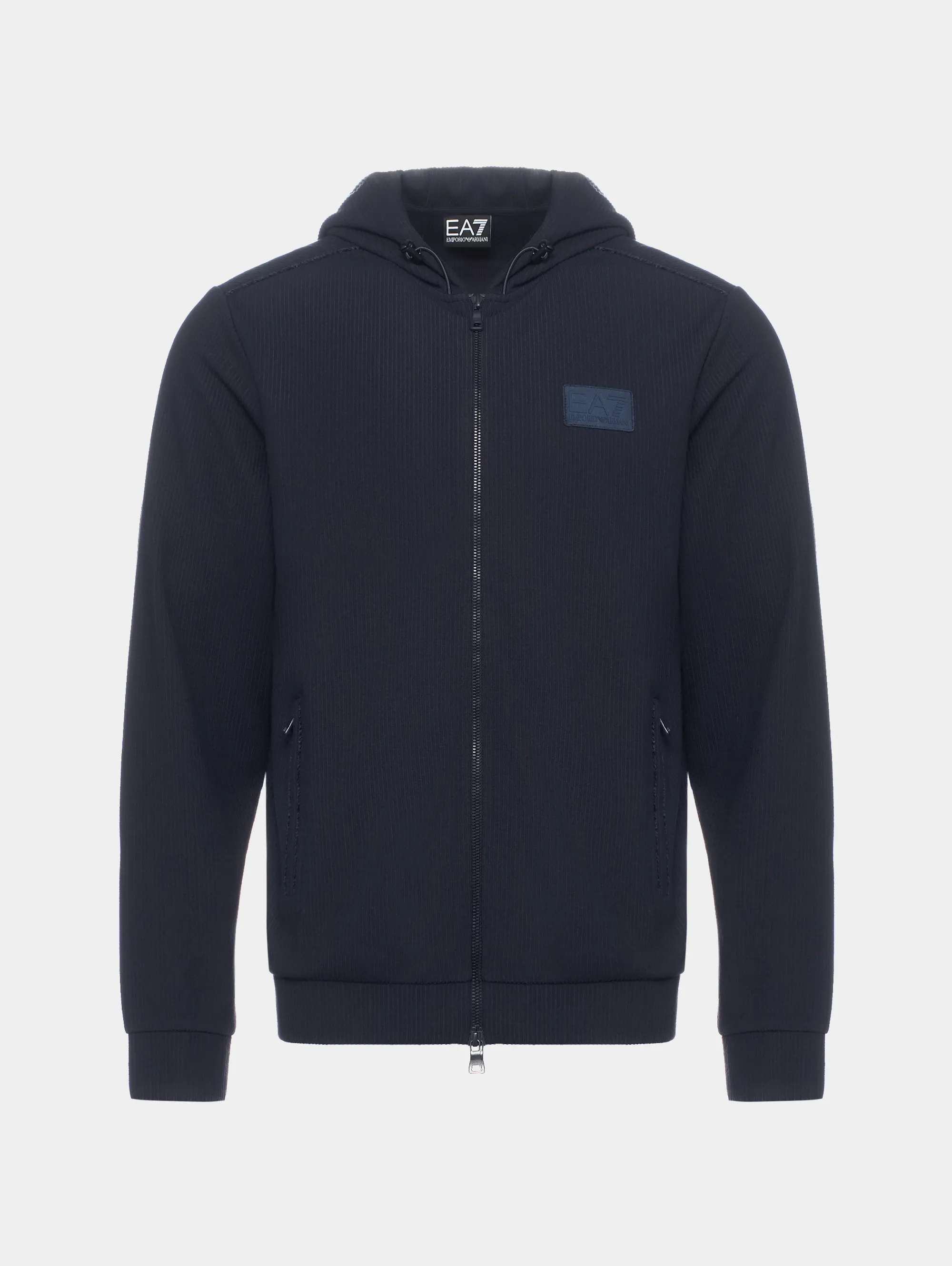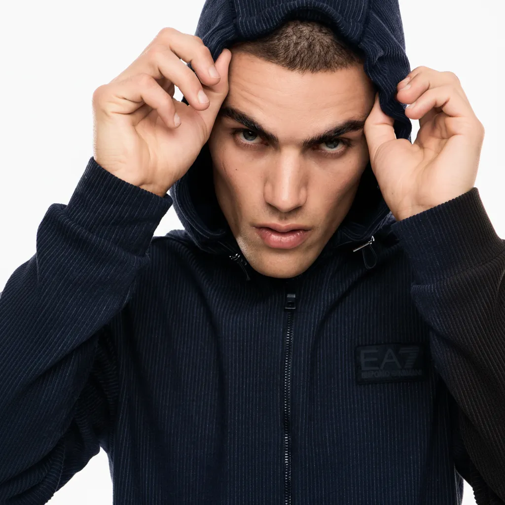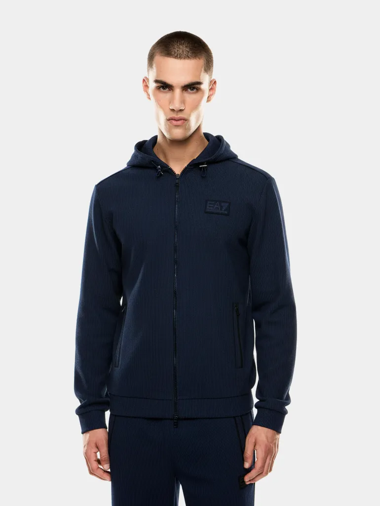 Мужская спортивная толстовка с капюшоном EA7 Emporio Armani тёмно-синего цвета — стильная и функциональная модель, которая идеально сочетается с брюками из коллекции LUX IDENTITY. Выполнена из микроребристого материала на основе полиэстера, вискозы и эластана, застёгивается на молнию и оснащена удобными боковыми карманами. Подойдёт как для тренировок, так и для активного отдыха, добавляя комфорта и свободы движения.