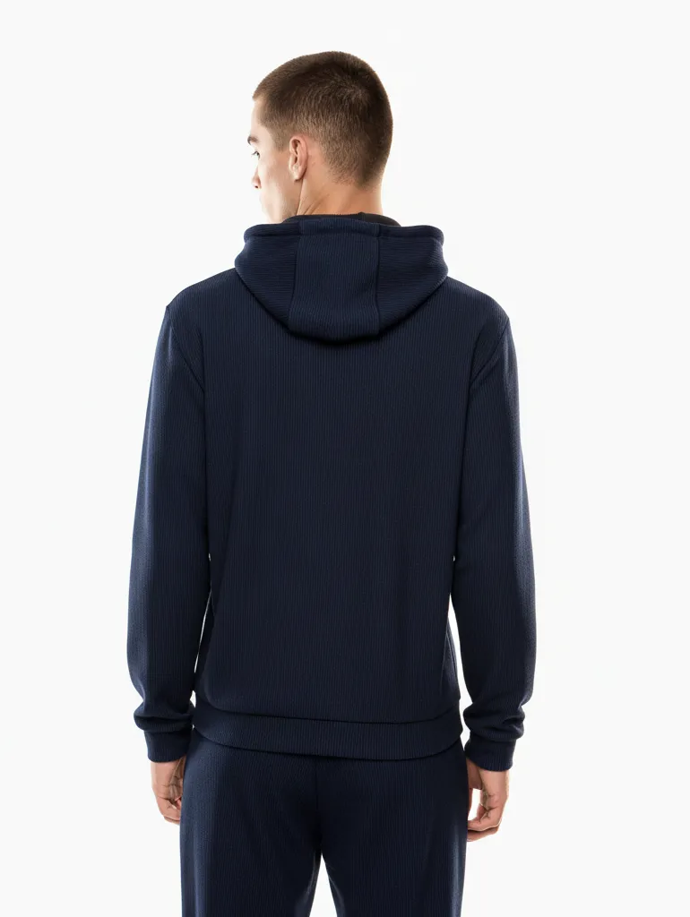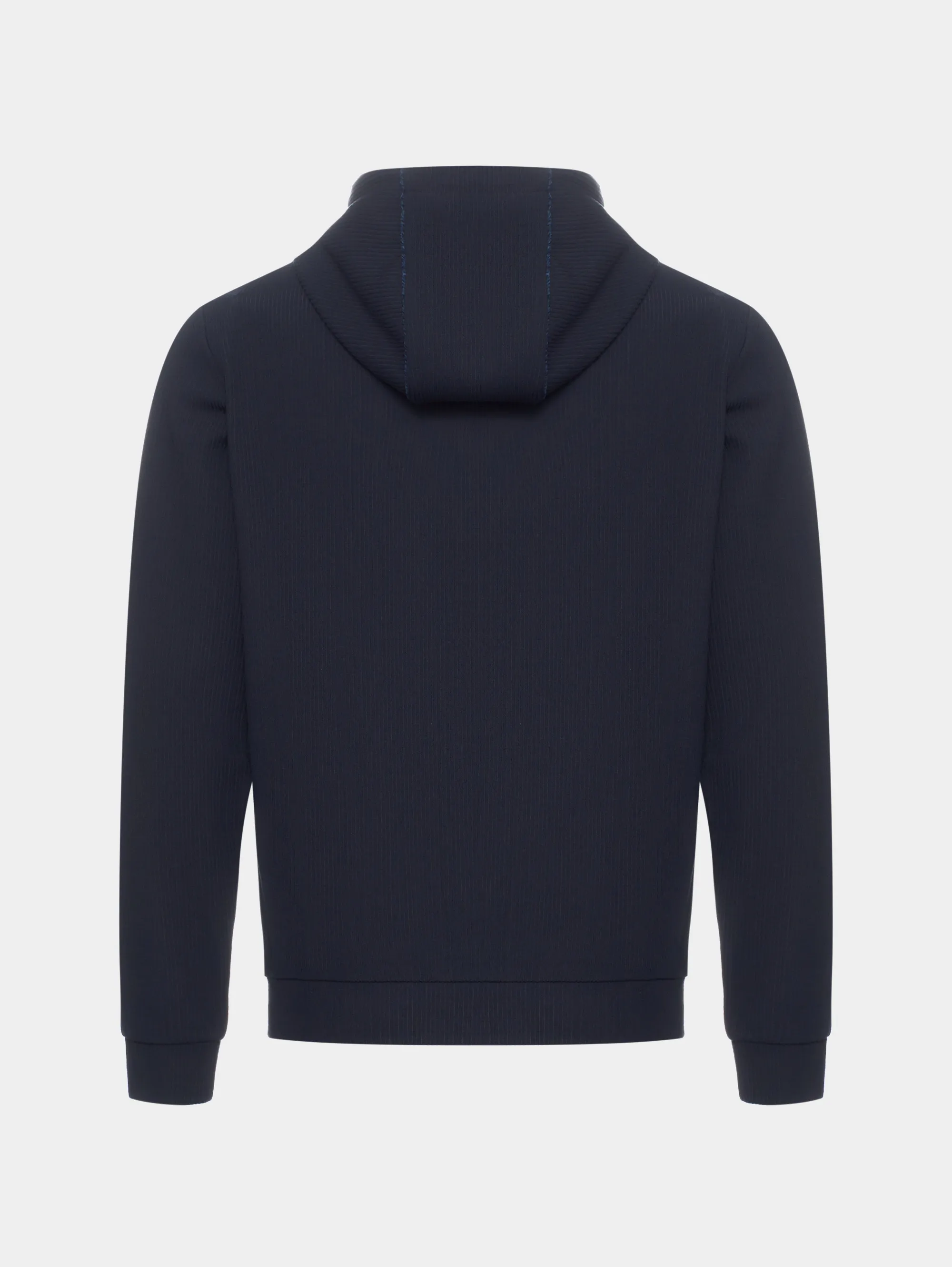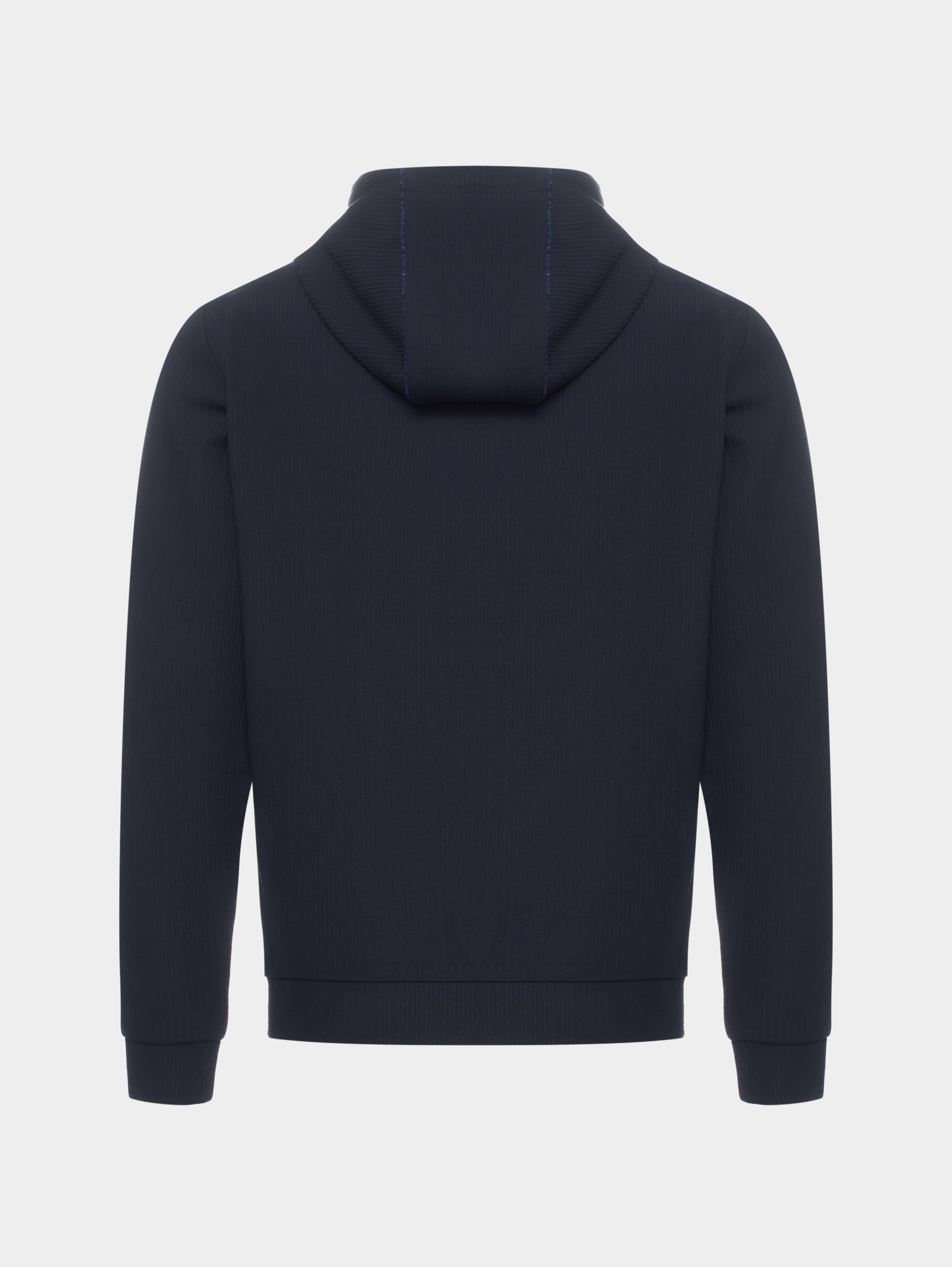 Мужская спортивная толстовка с капюшоном EA7 Emporio Armani тёмно-синего цвета — стильная и функциональная модель, которая идеально сочетается с брюками из коллекции LUX IDENTITY. Выполнена из микроребристого материала на основе полиэстера, вискозы и эластана, застёгивается на молнию и оснащена удобными боковыми карманами. Подойдёт как для тренировок, так и для активного отдыха, добавляя комфорта и свободы движения.