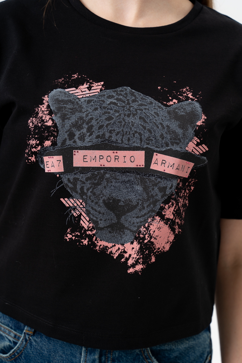 Женская укороченная футболка EA7 черного цвета с эксклюзивным фирменным принтом — стильная базовая модель для повседневных и спортивных образов. Круглый вырез и короткие рукава подчеркивают лаконичный силуэт в духе бренда.