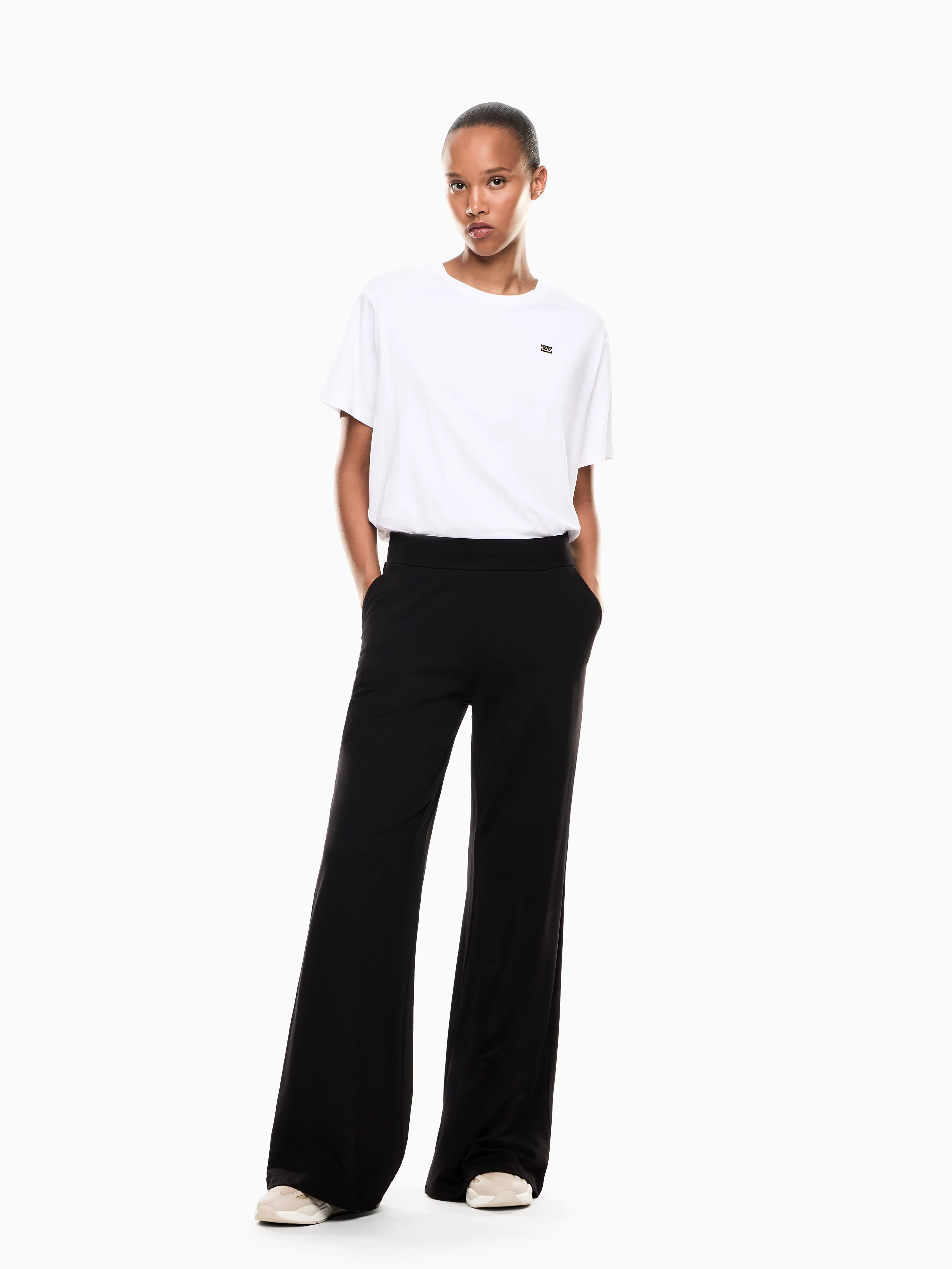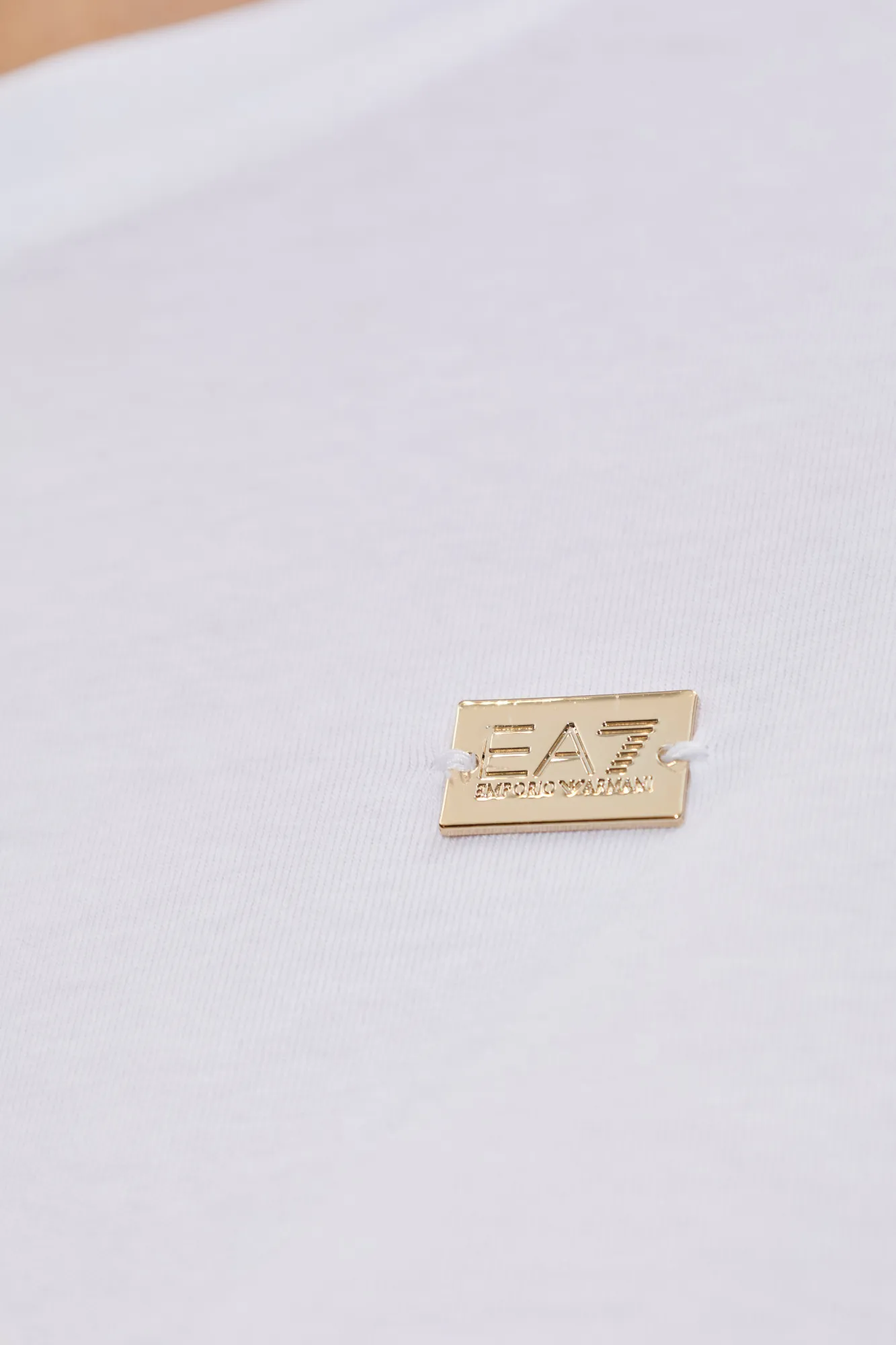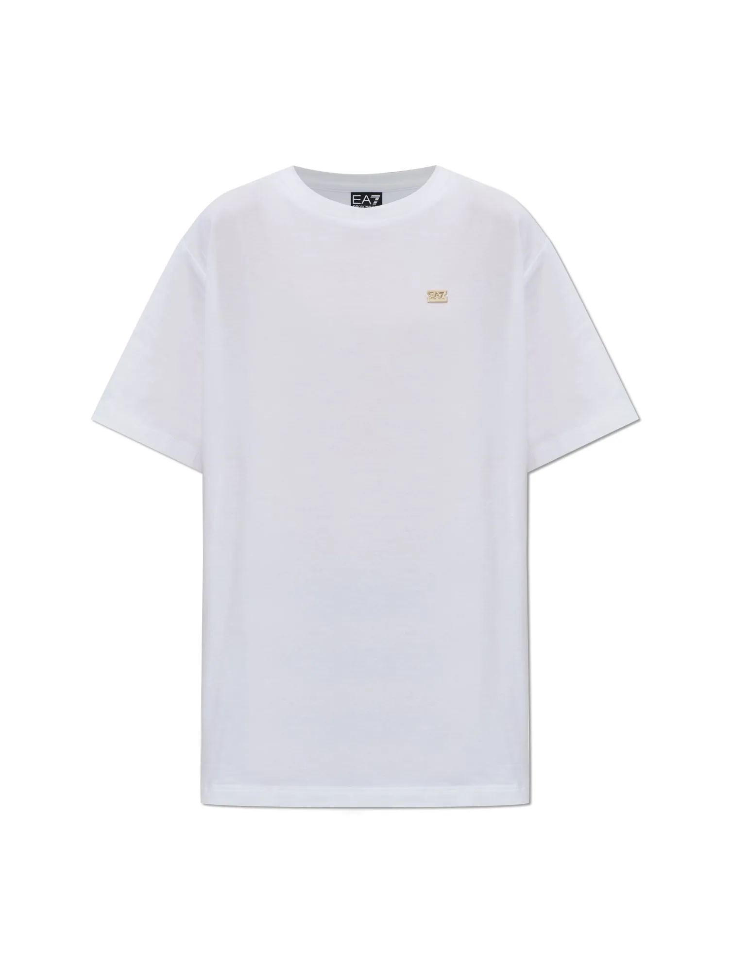 Женская футболка свободного кроя выполнена из эластичного хлопка. Небольшой металлический логотип бренда на груди добавляет аккуратный фирменный акцент. Модель с круглым трикотажным воротником. Универсальная, подходит как для тренировок, так и для повседневных образов.
