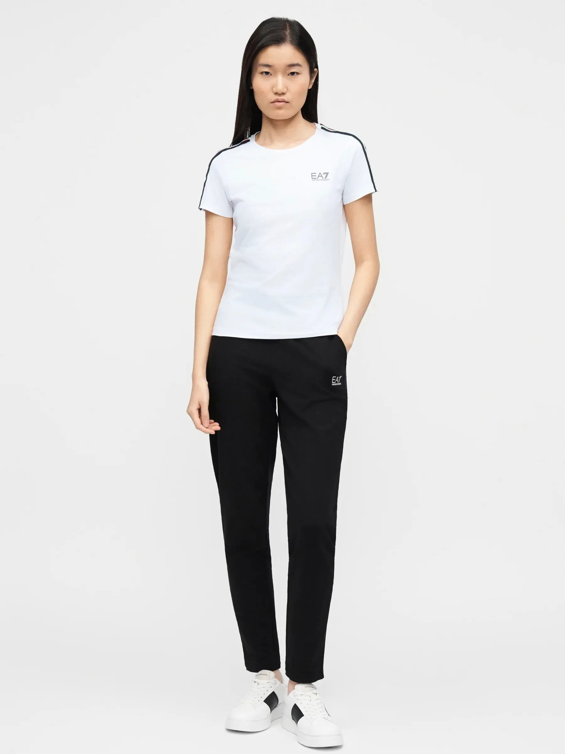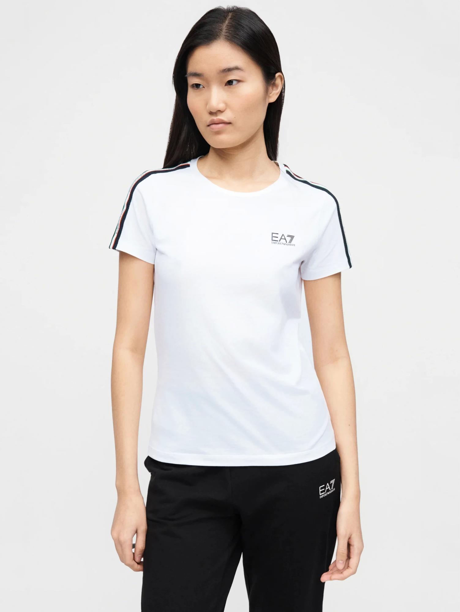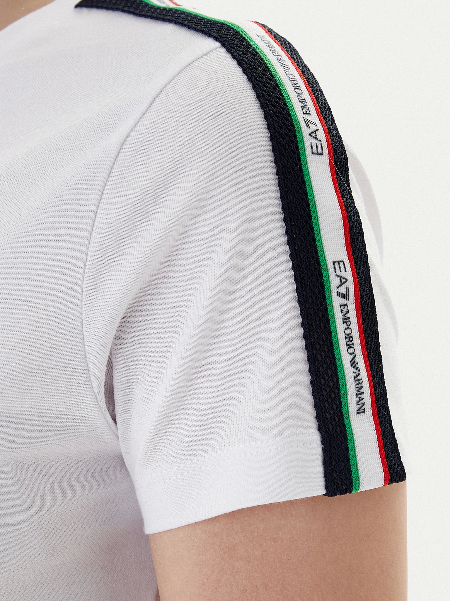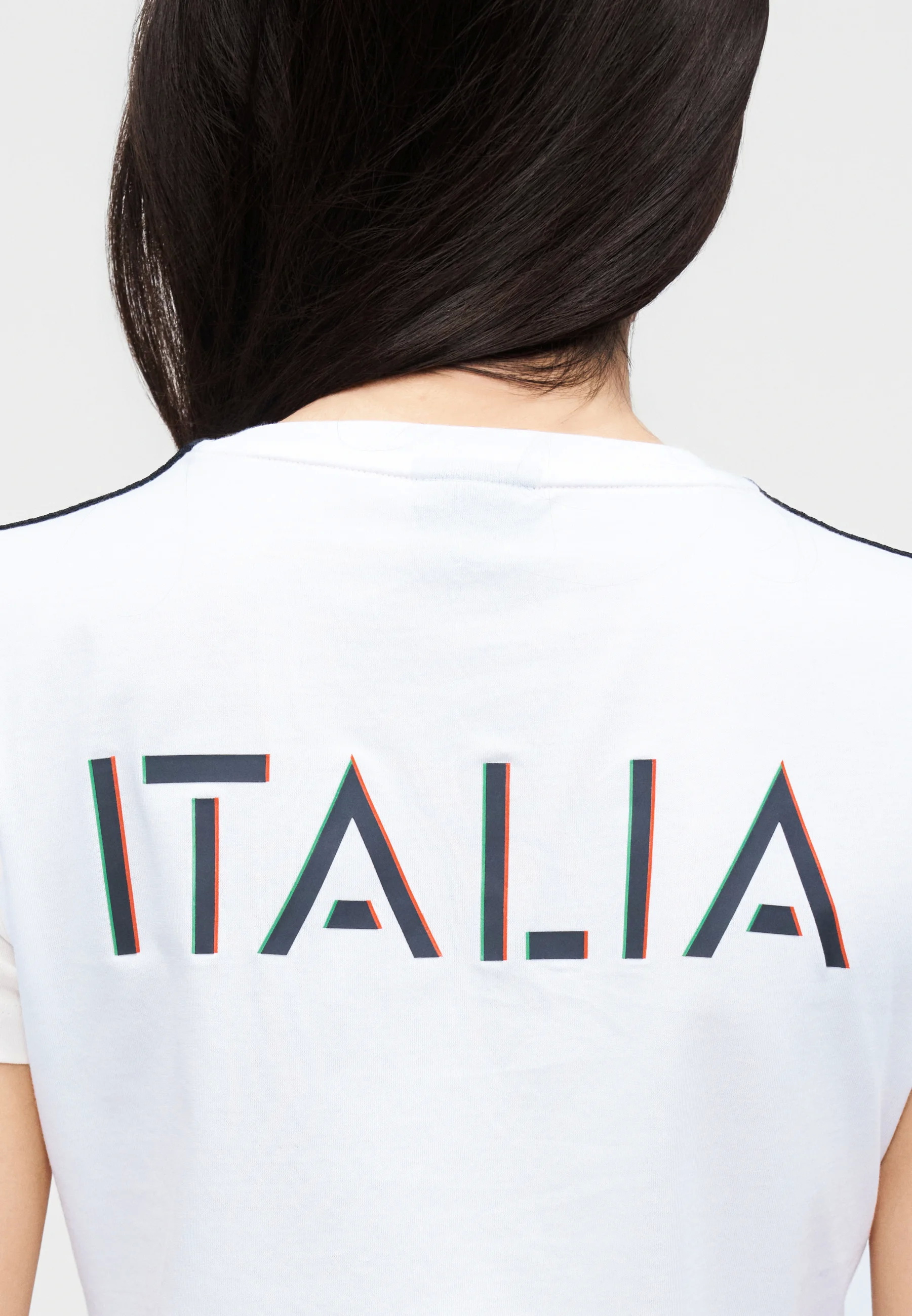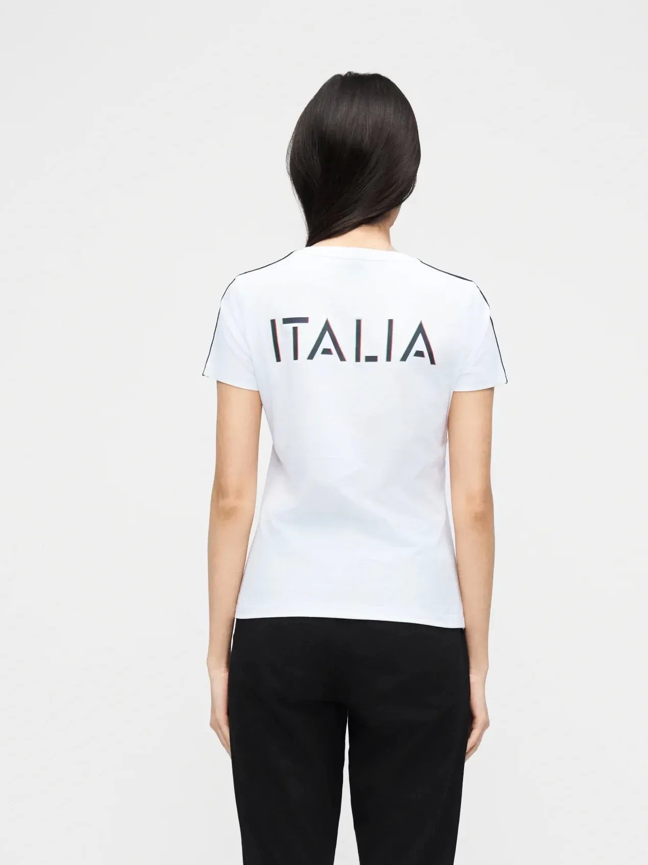 Женская футболка облегающего кроя выполнена из натурального хлопка. Рукава украшены фирменными лампасами, а спинка оформлена принтом с надписью Italia. Модель с круглым воротником, универсальная — подходит как для тренировок, так и для активного отдыха.