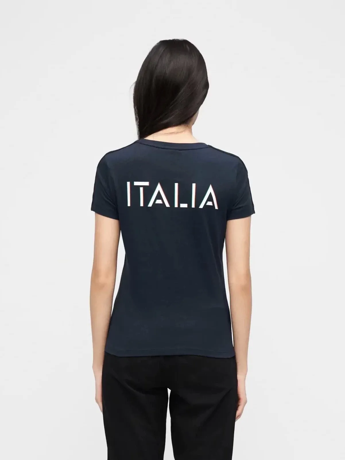 Женская футболка облегающего кроя выполнена из натурального хлопка. Рукава украшены фирменными лампасами, а спинка оформлена принтом с надписью Italia. Модель с круглым воротником, универсальная — подходит как для тренировок, так и для активного отдыха.