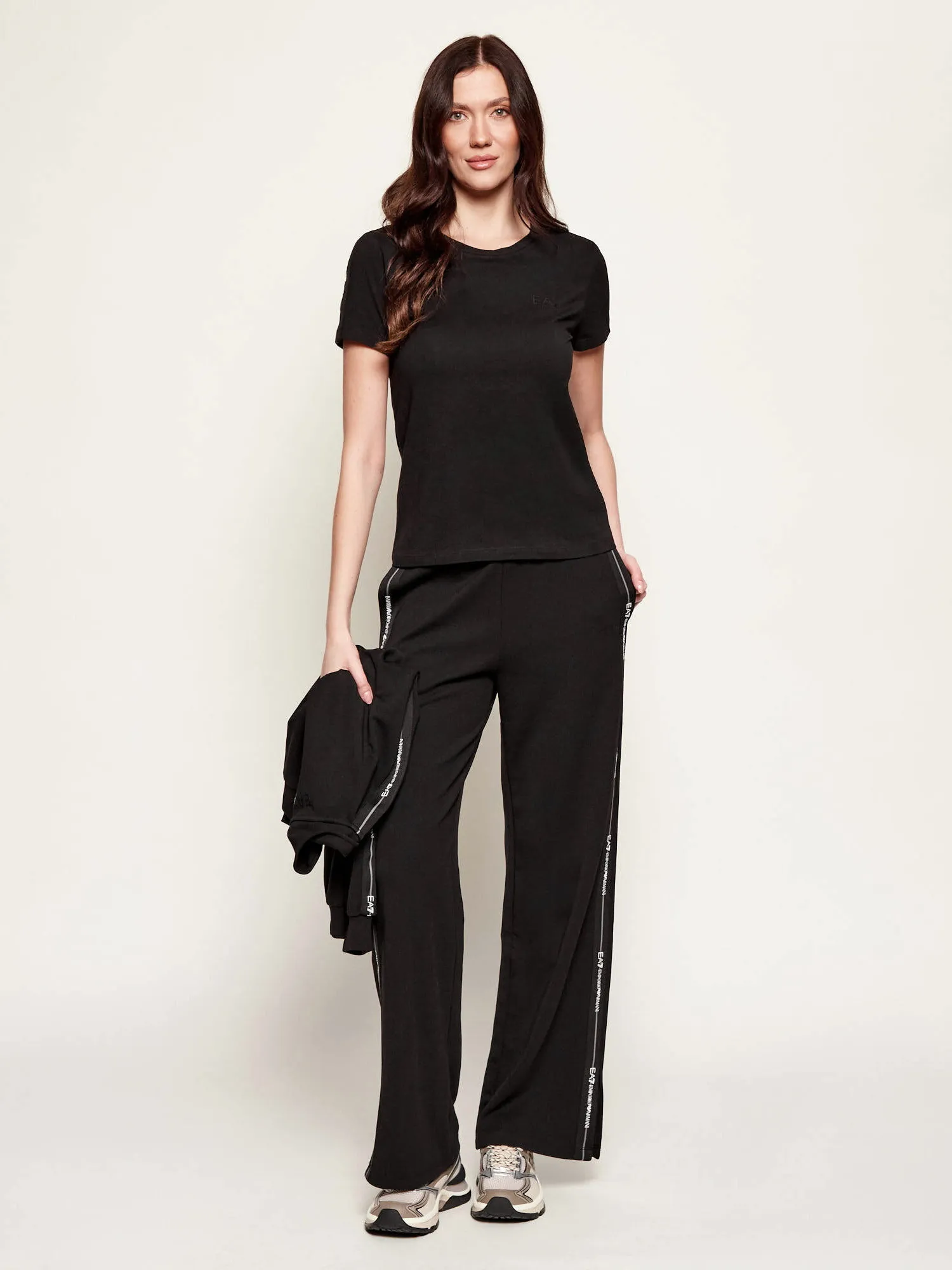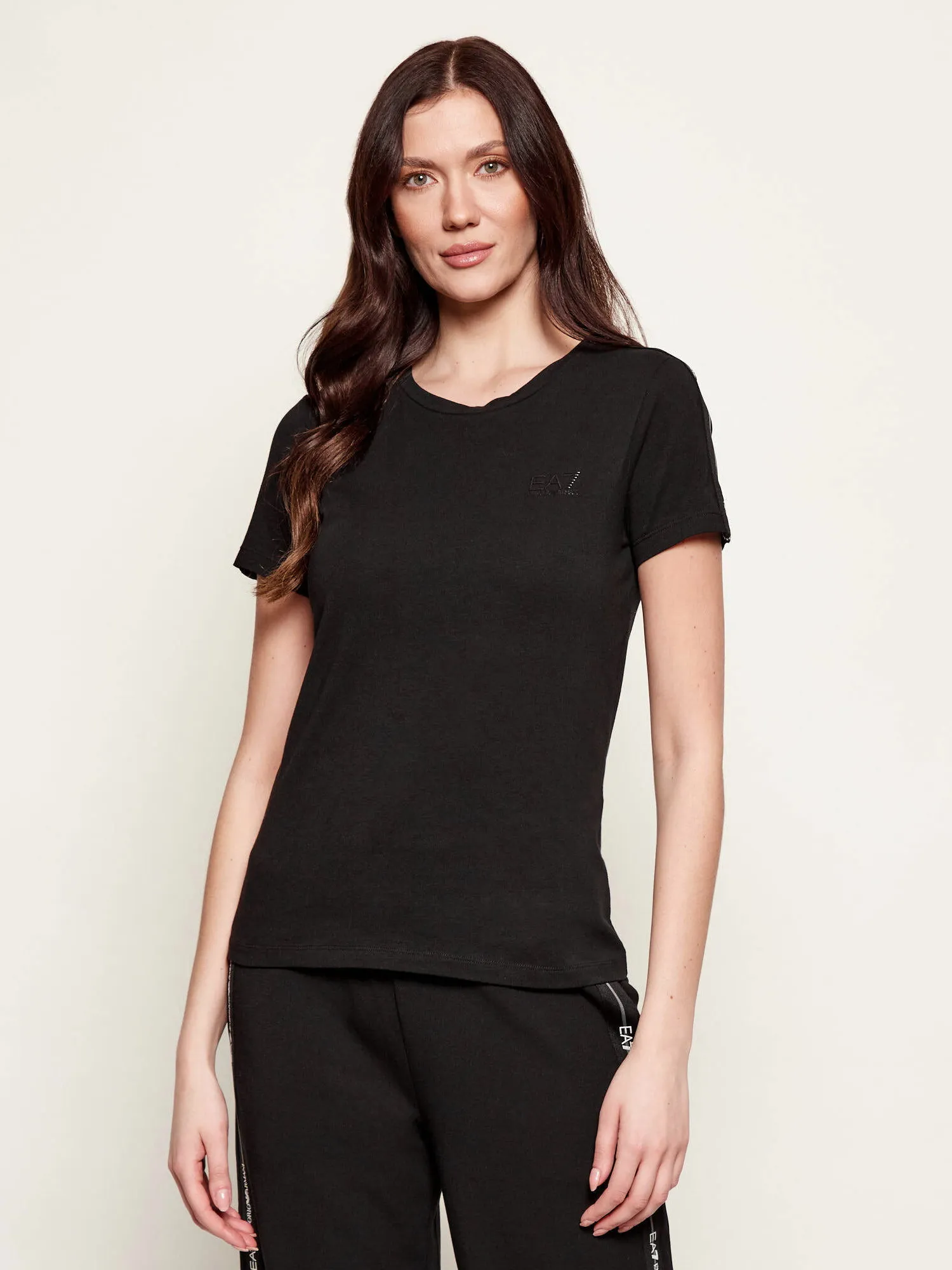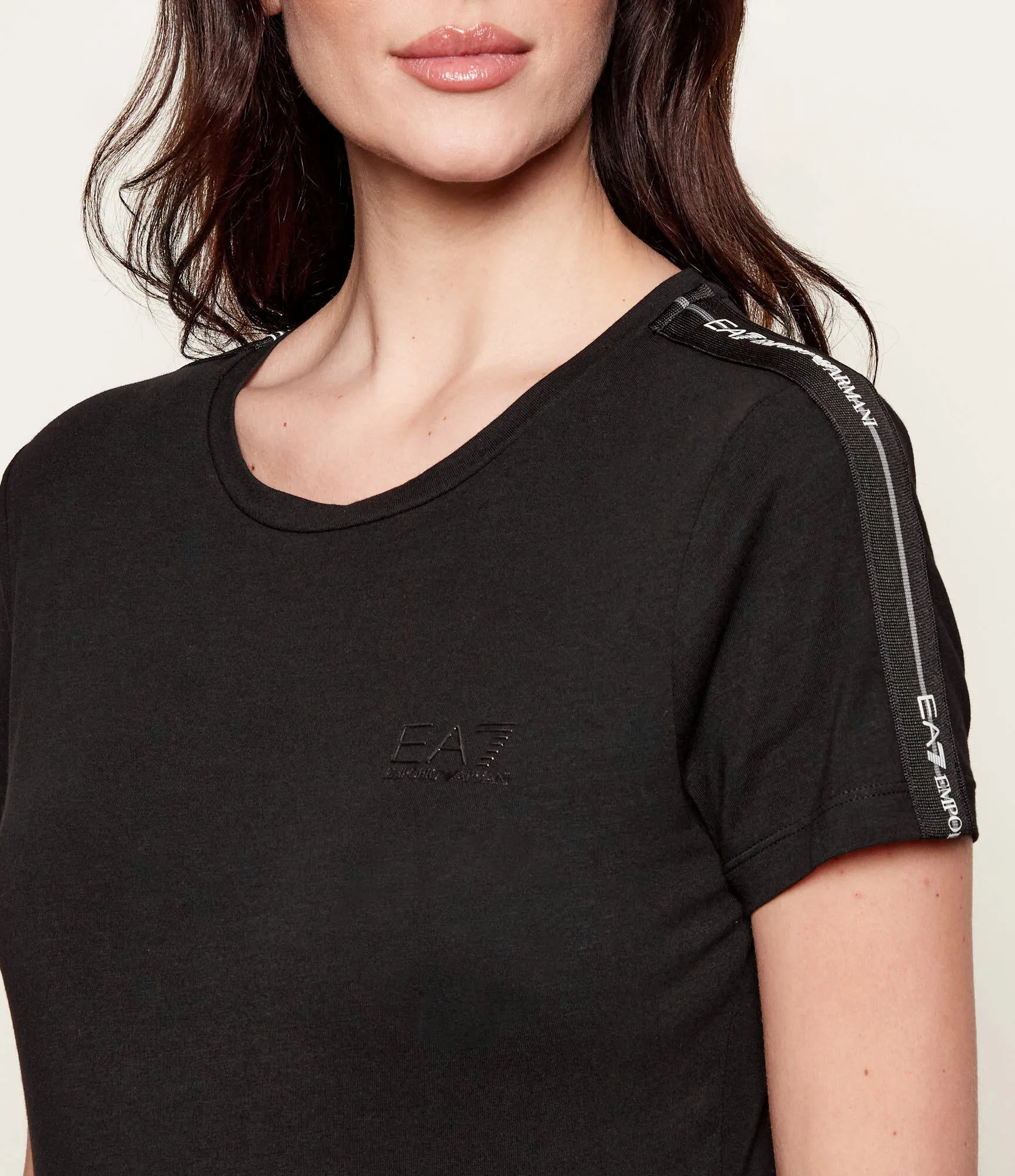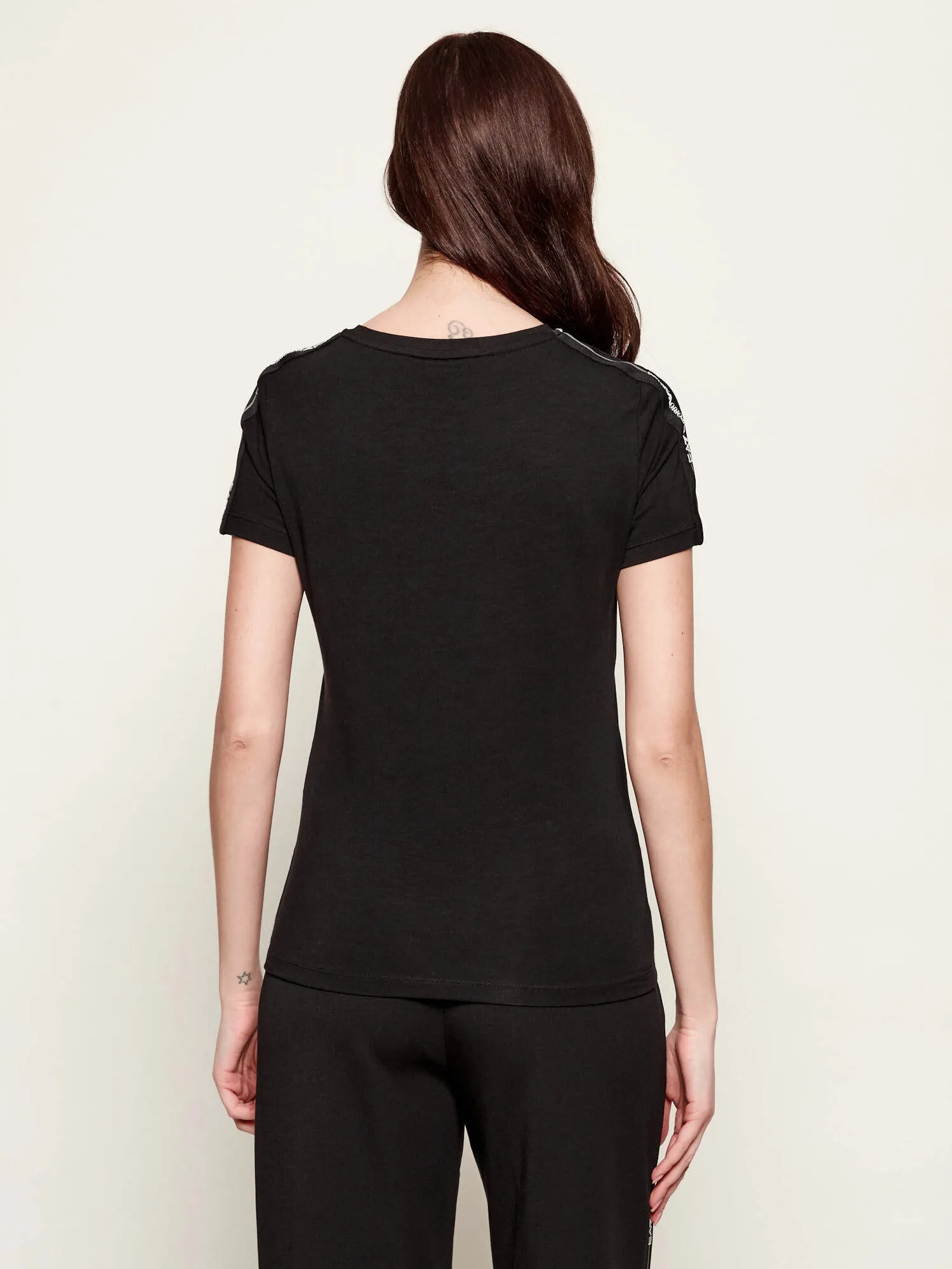 Женская футболка облегающего кроя с короткими рукавами и круглым вырезом выполнена из эластичного хлопка. Модель украшена контрастной тесьмой на рукавах. Универсальная, подходит как для тренировок, так и для повседневных образов.