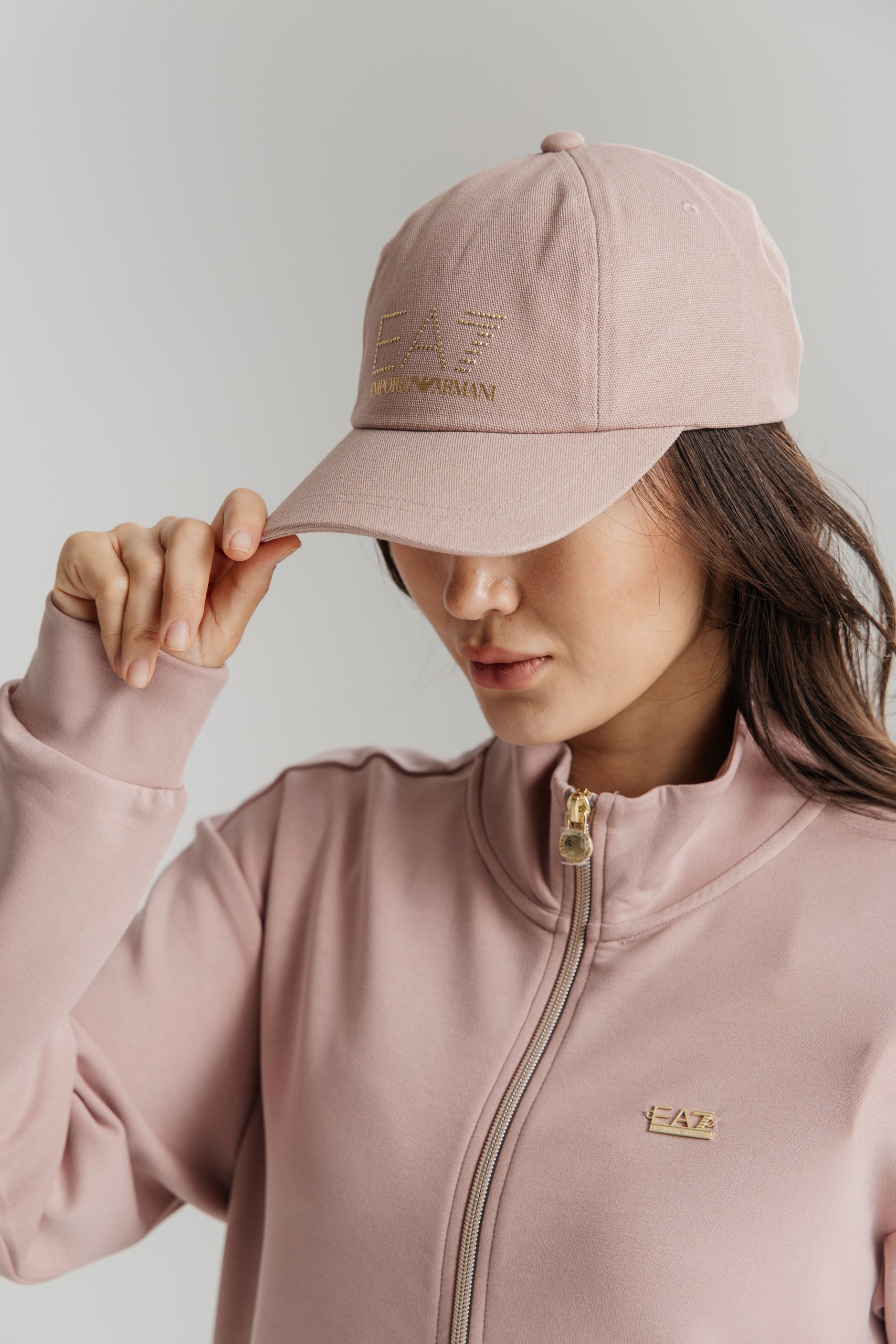Женская кепка розового цвета с золотистым логотипом EA7, регулируемым объемом, защищает от яркого солнца. Дышащий хлопок, из которого изготовлена кепка, и вентиляционные отверстия поддерживают комфортную температуру головы.