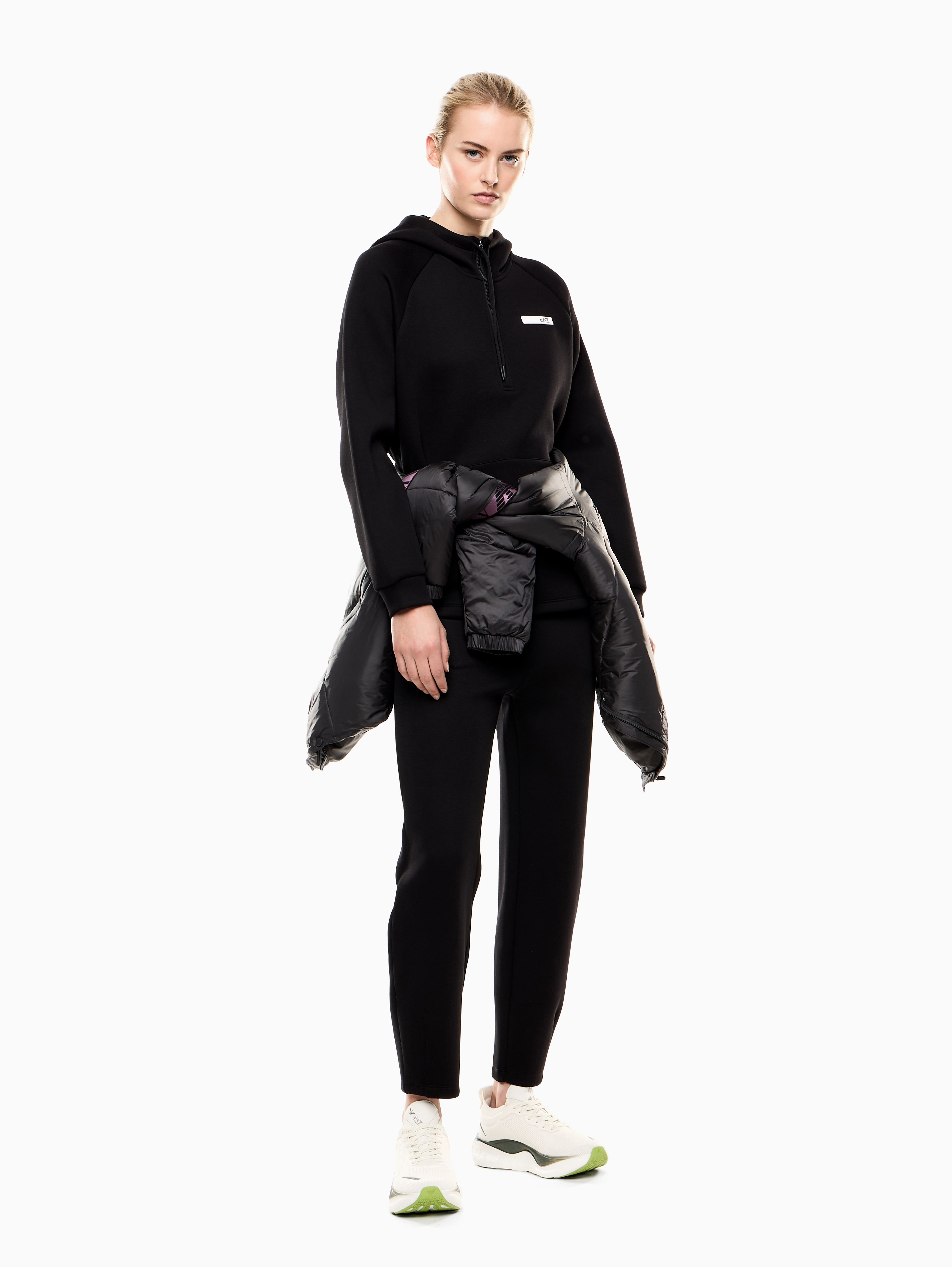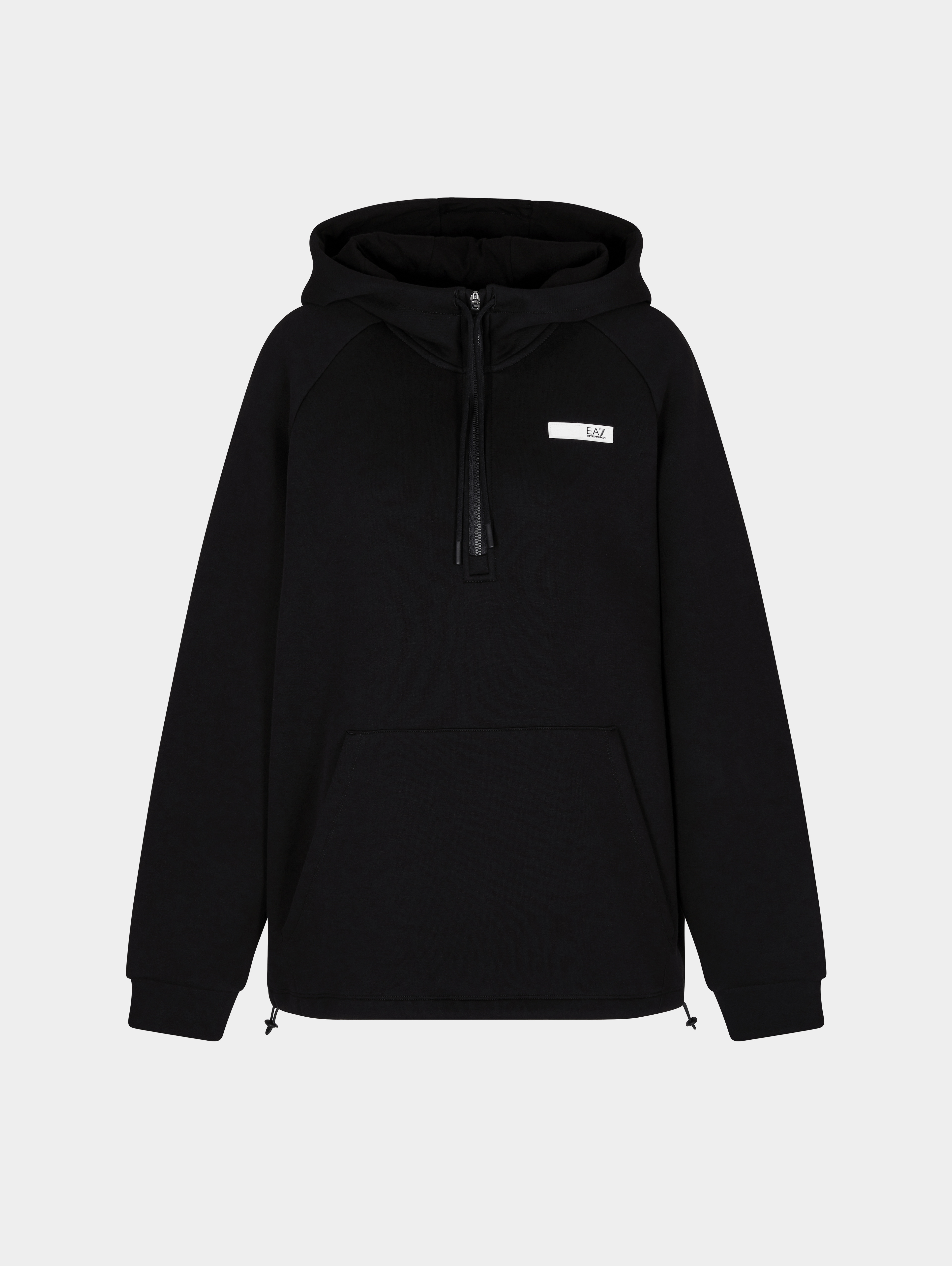 Женская толстовка EA7 с капюшоном и застёжкой на молнии до середины груди выполнена из инновационного материала Natural VENTUS7 — сочетания натуральных и синтетических волокон, которые регулируют температуру тела и отводят влагу. Модель дополнена карманом-кенгуру, логотипом на спине и эластичным шнурком на подоле.
