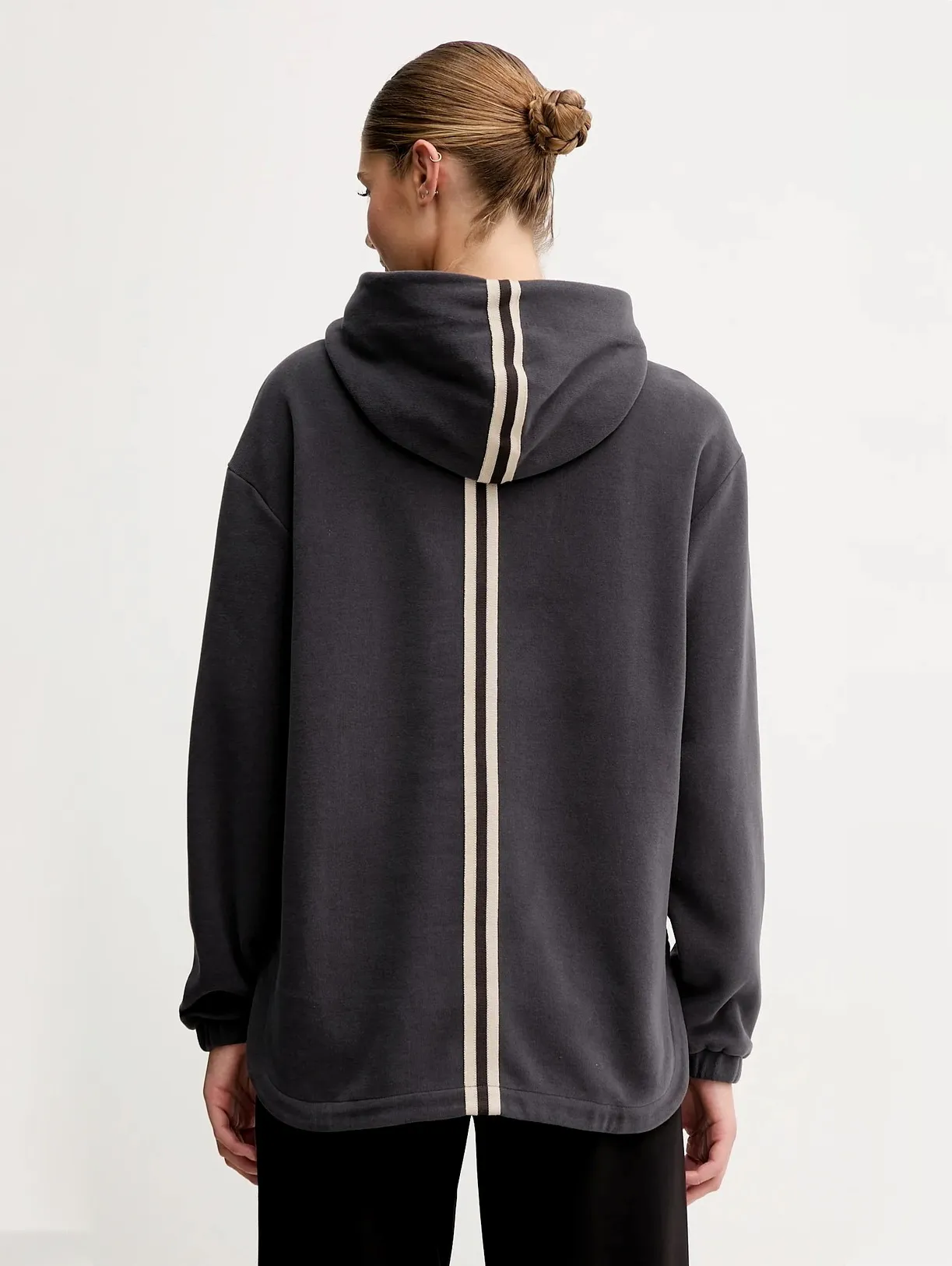 Женское худи с капюшоном и застёжкой-молнией до середины груди выполнено из смесового хлопка с расклешенным кроем. Модель с боковыми разрезами и двухцветной лентой на спине, закруглённым асимметричным подолом с удлинённой спинкой. Линия Sporty Forever сочетает стиль и комфорт, идеально подходит для тренировок и повседневной носки.