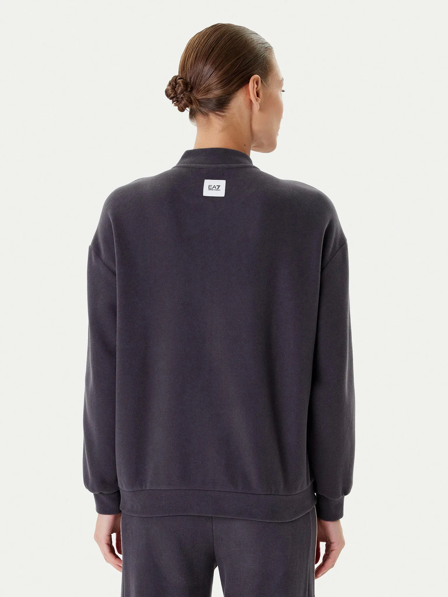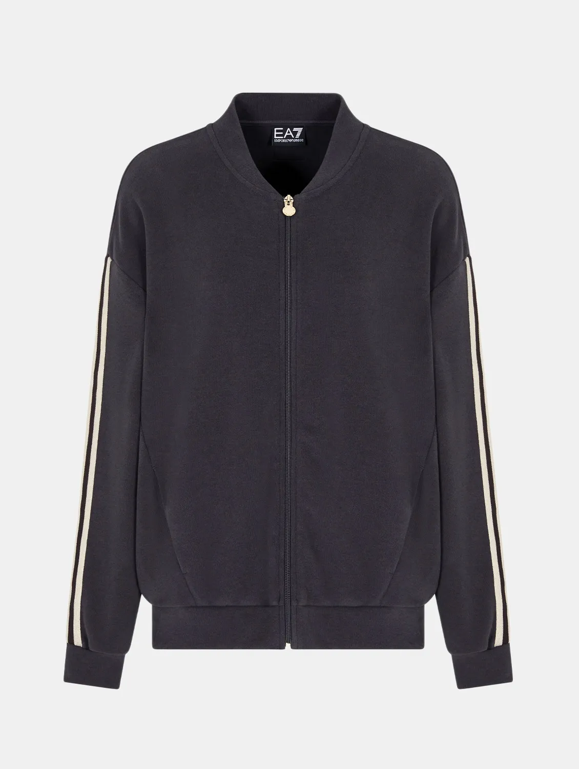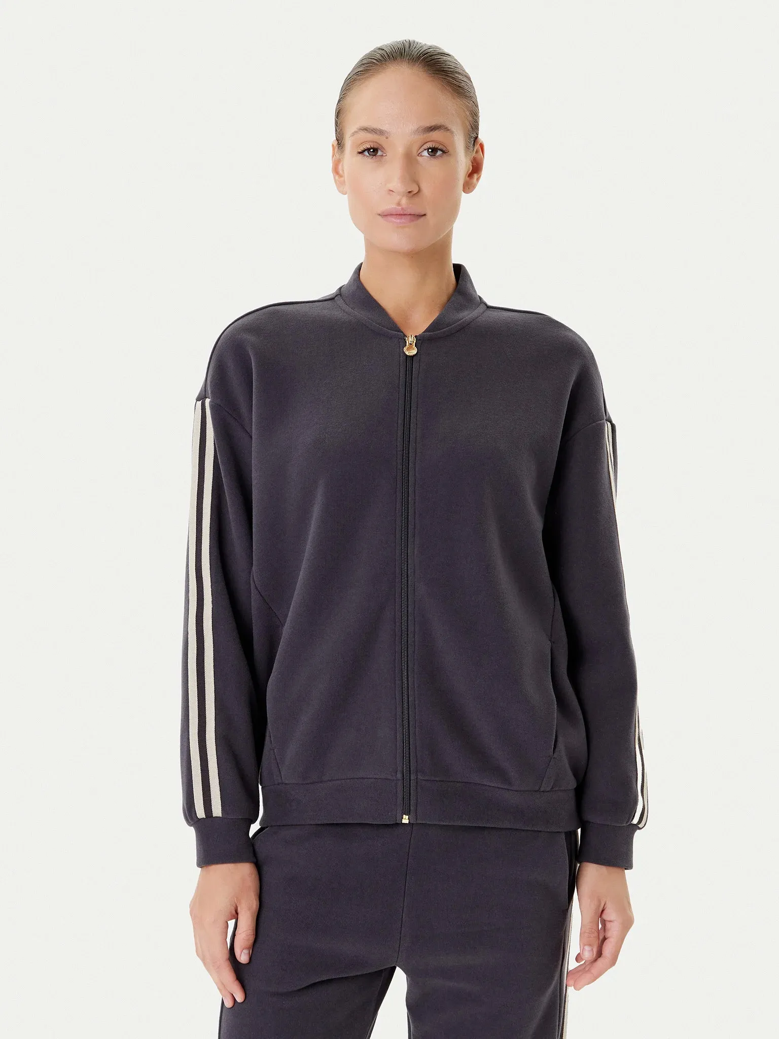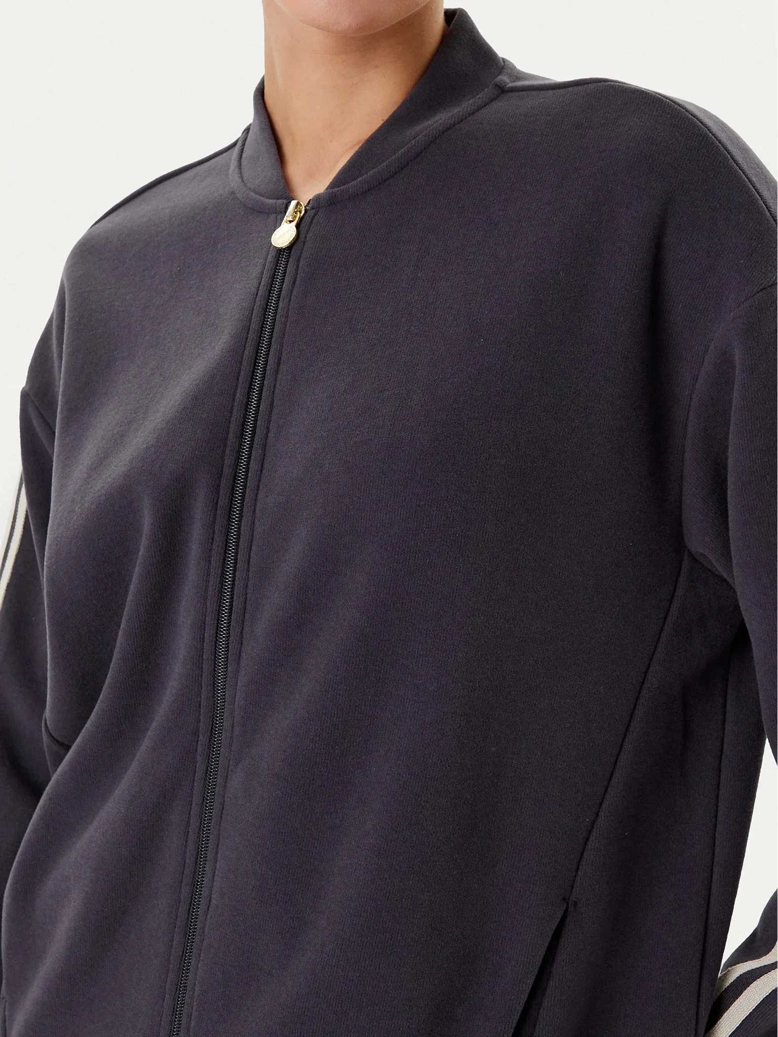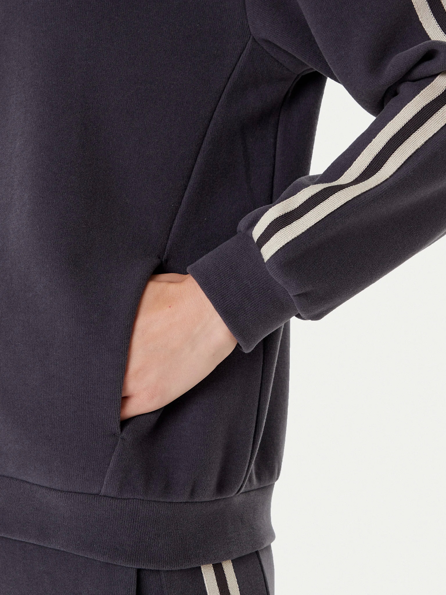 Женская спортивная толстовка с воротником в стиле бомбера. Прямой крой со спущенной линией плеч создаёт расслабленный силуэт, а контрастные лампасы на рукавах добавляют динамики. Идеально сочетается со спортивными брюками из коллекции.