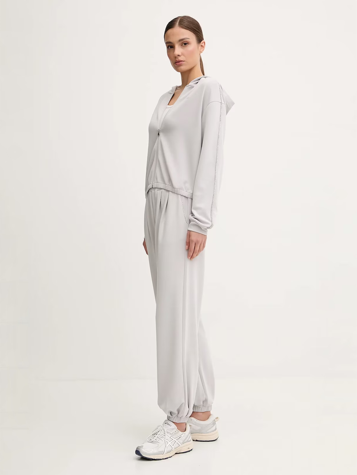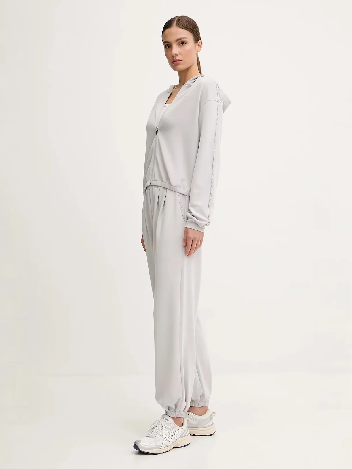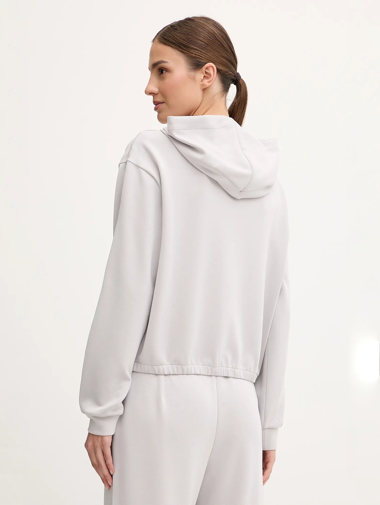 Женская укороченная толстовка на молнии с капюшоном из эластичного смесового модала подходит как для тренировок, так и для отдыха. Модель входит в коллекцию Precious, где лаконичный крой сочетается с декоративной отделкой со стразами на плечах, добавляющей образу эффектный блеск.