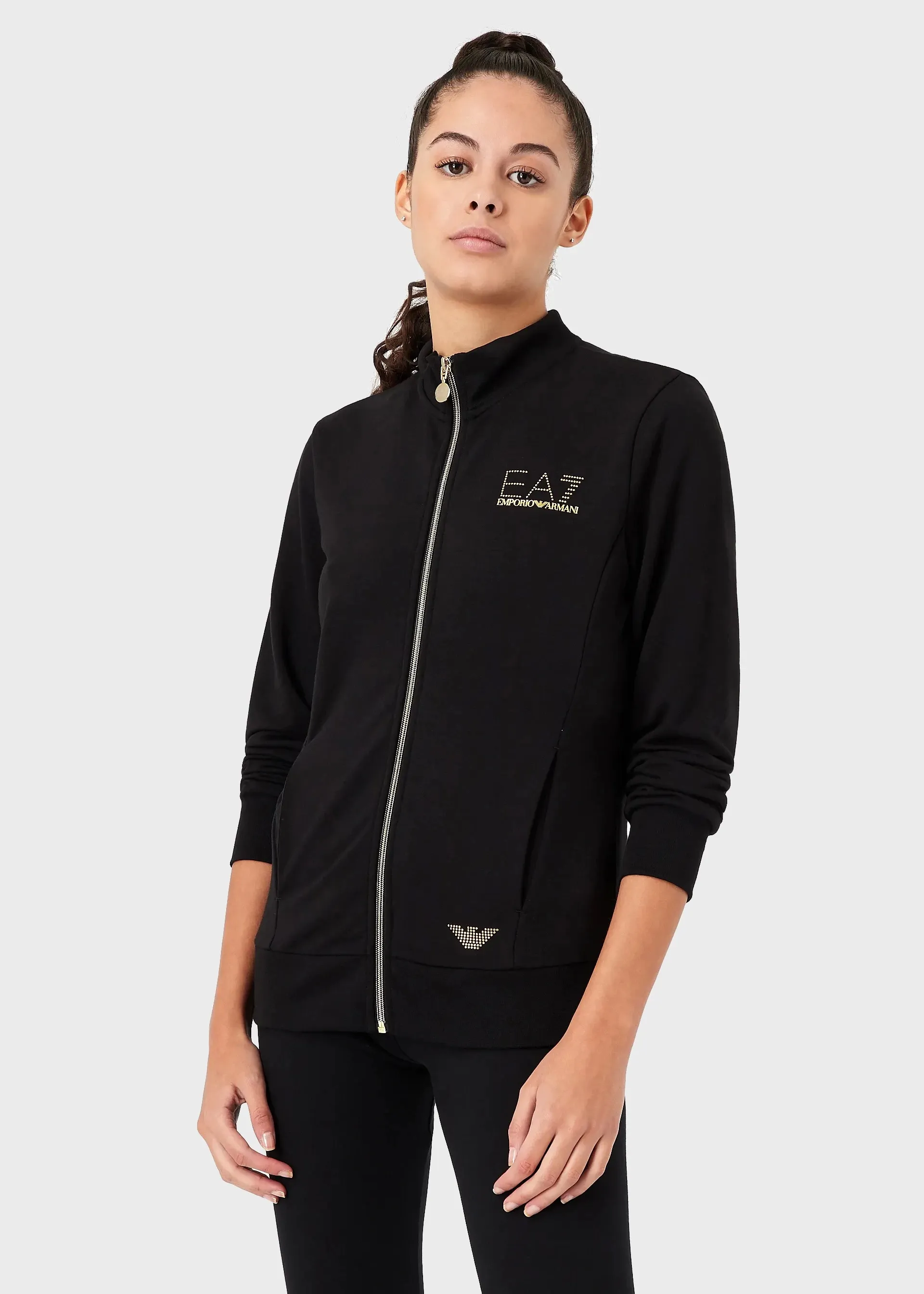 Женская спортивная толстовка из коллекции ЕА7 на тонком флисе, застегивается на молнию. Спортивный верх оснащен боковыми карманами, эластичными манжетами и подолом.