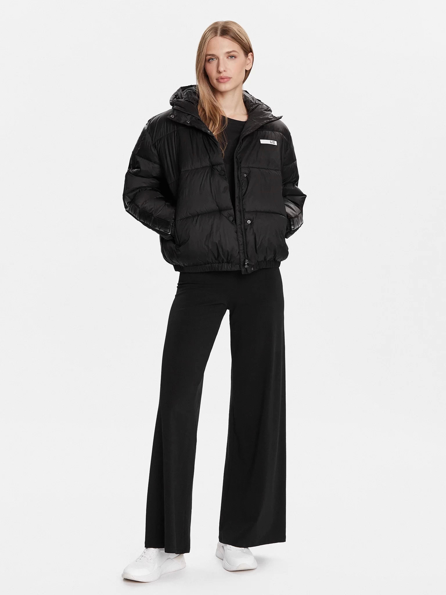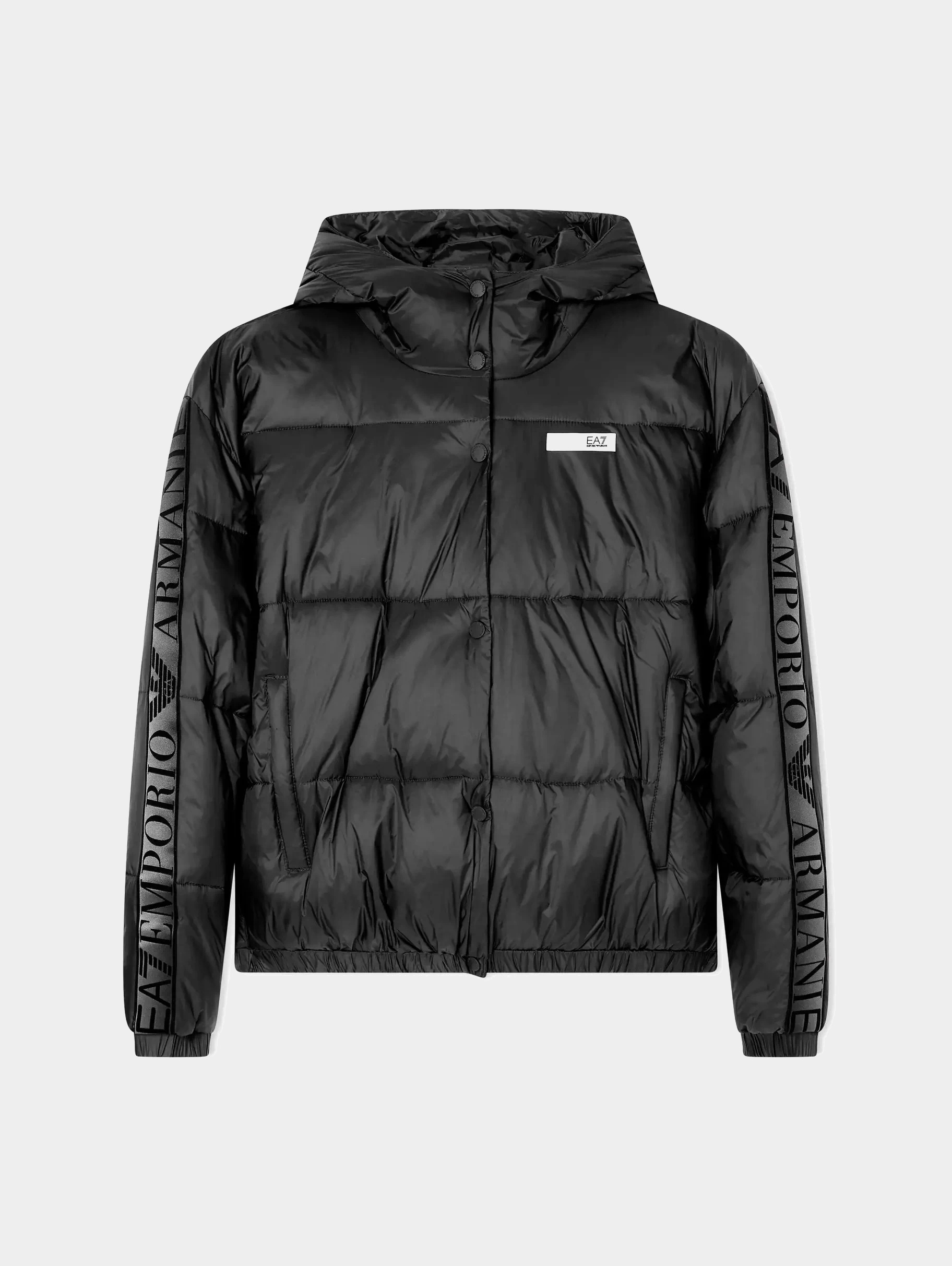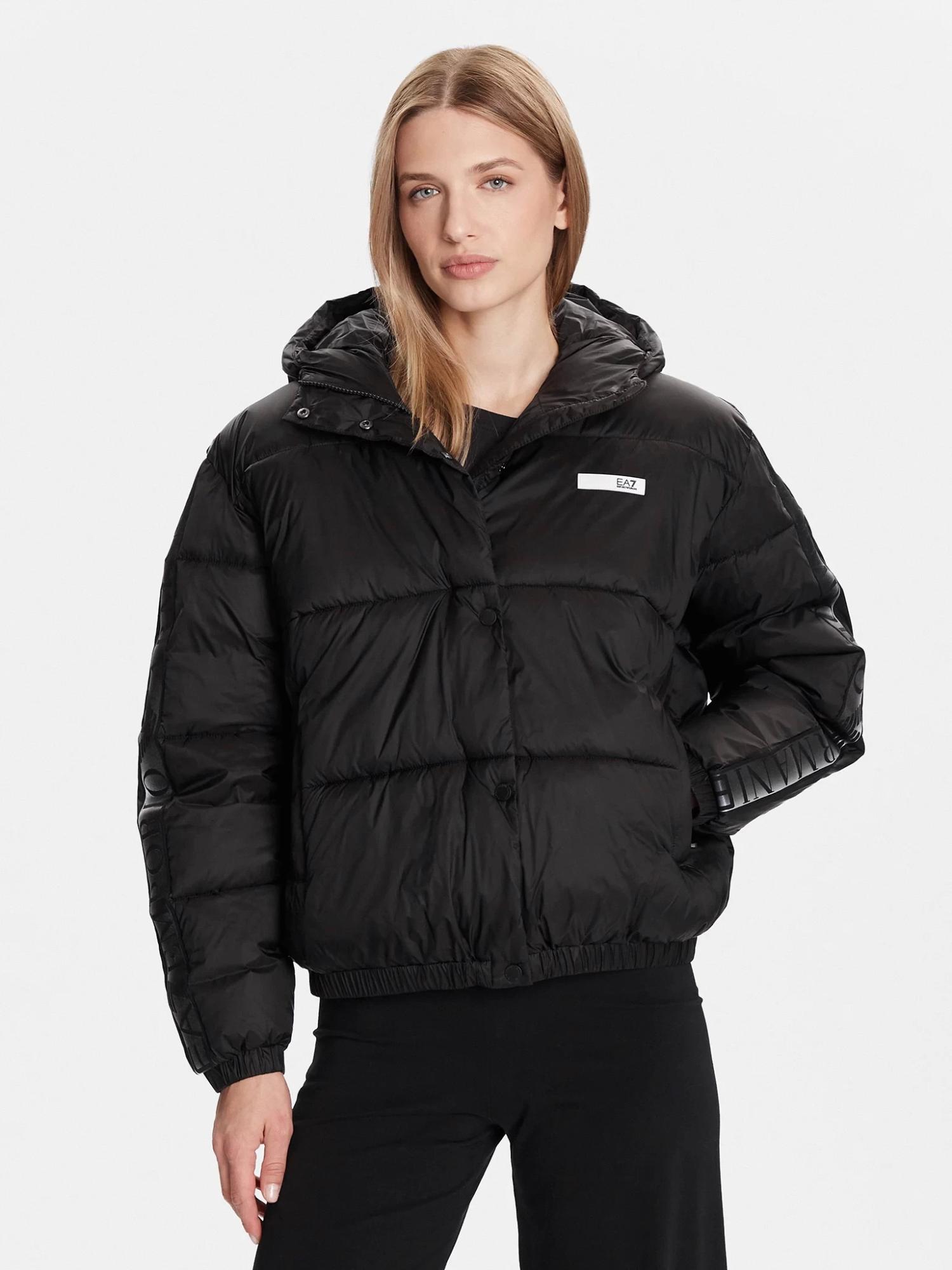 Женская утеплённая стёганая куртка черного цвета EA7 укороченного кроя сочетает стиль и комфорт в зимний сезон. Модель с капюшоном застёгивается на молнию и ветрозащитную планку с кнопками. Рукава украшены фирменным логотипом бренда, подчёркивающим спортивную эстетику EA7.