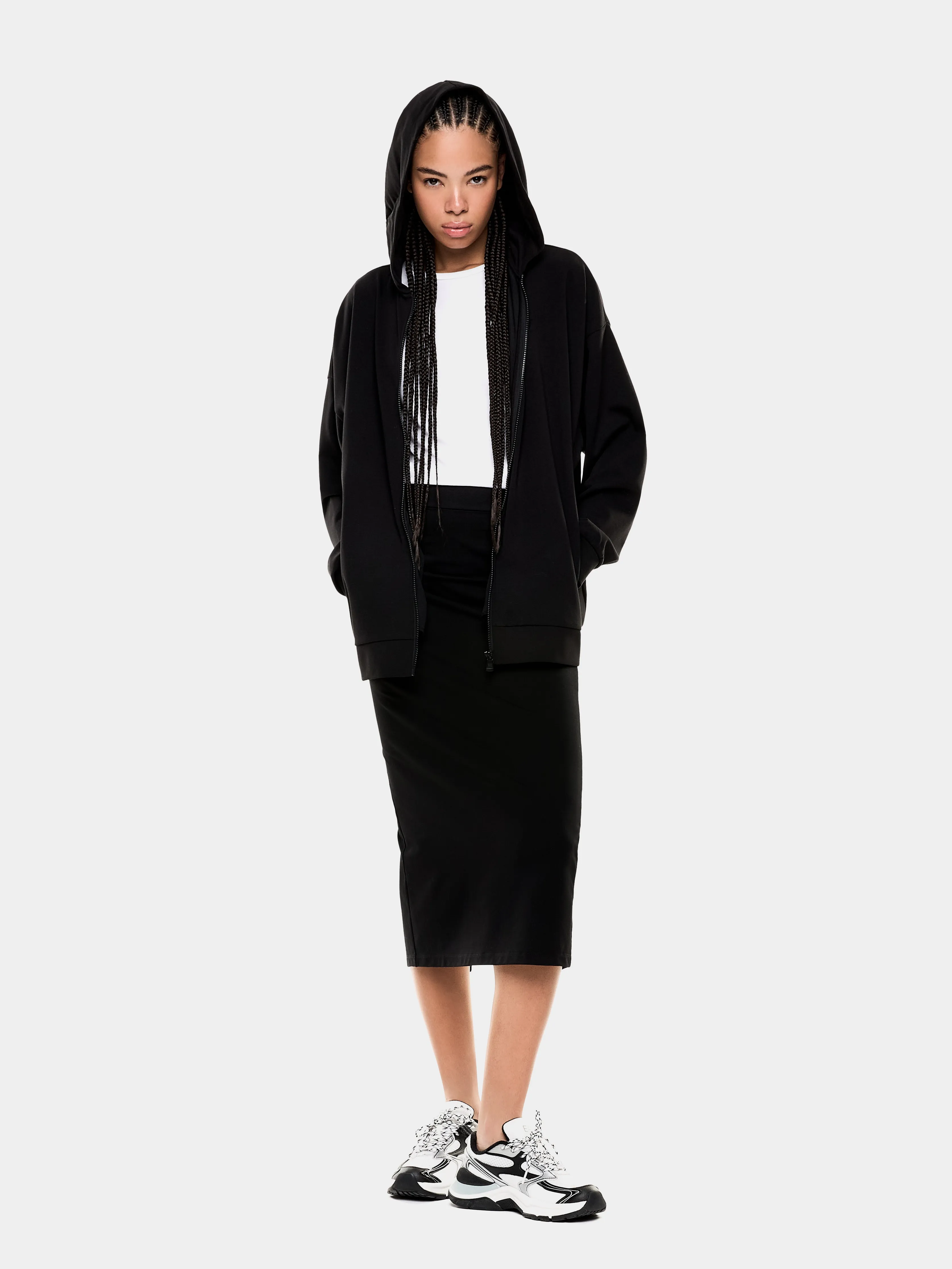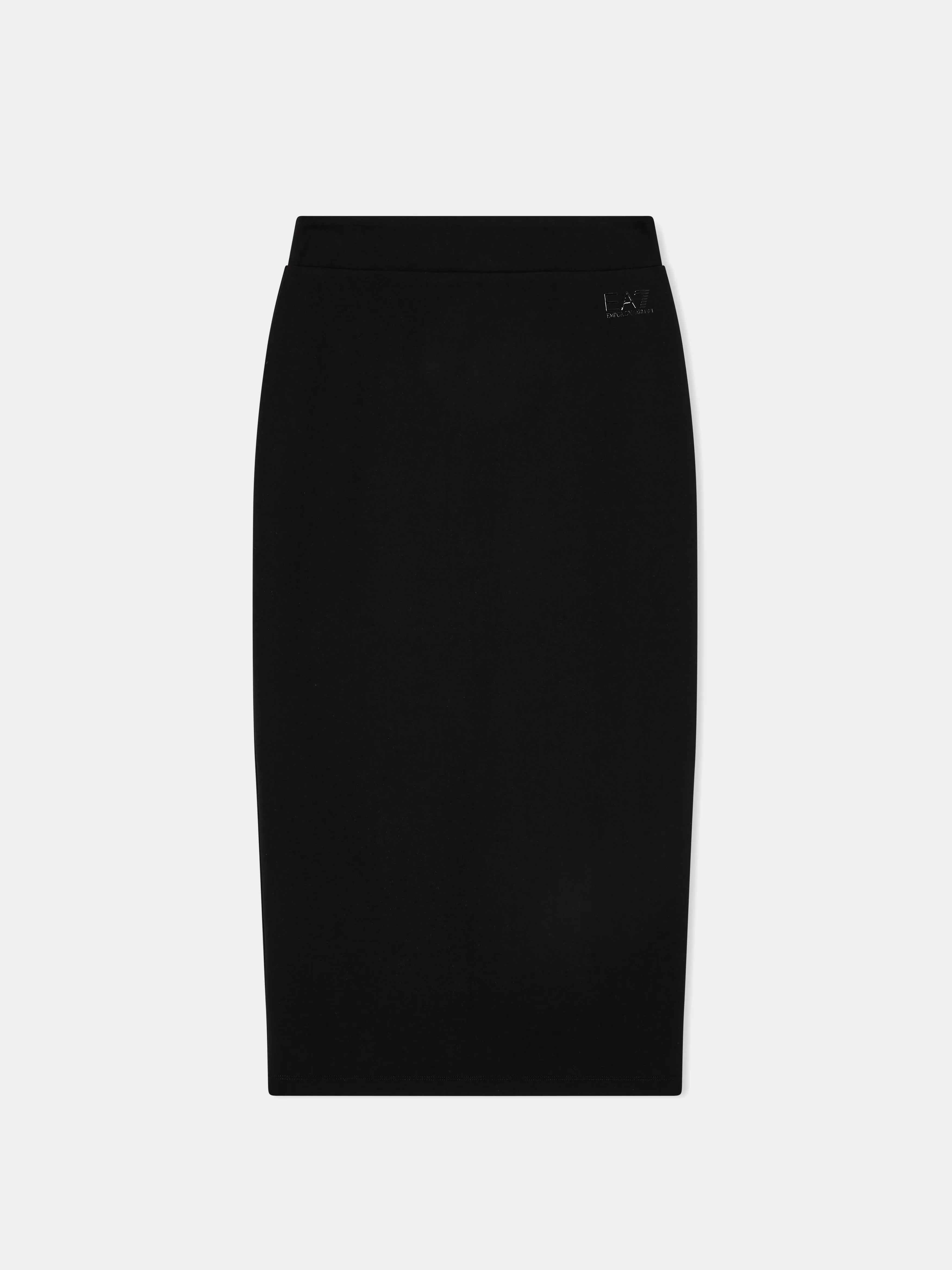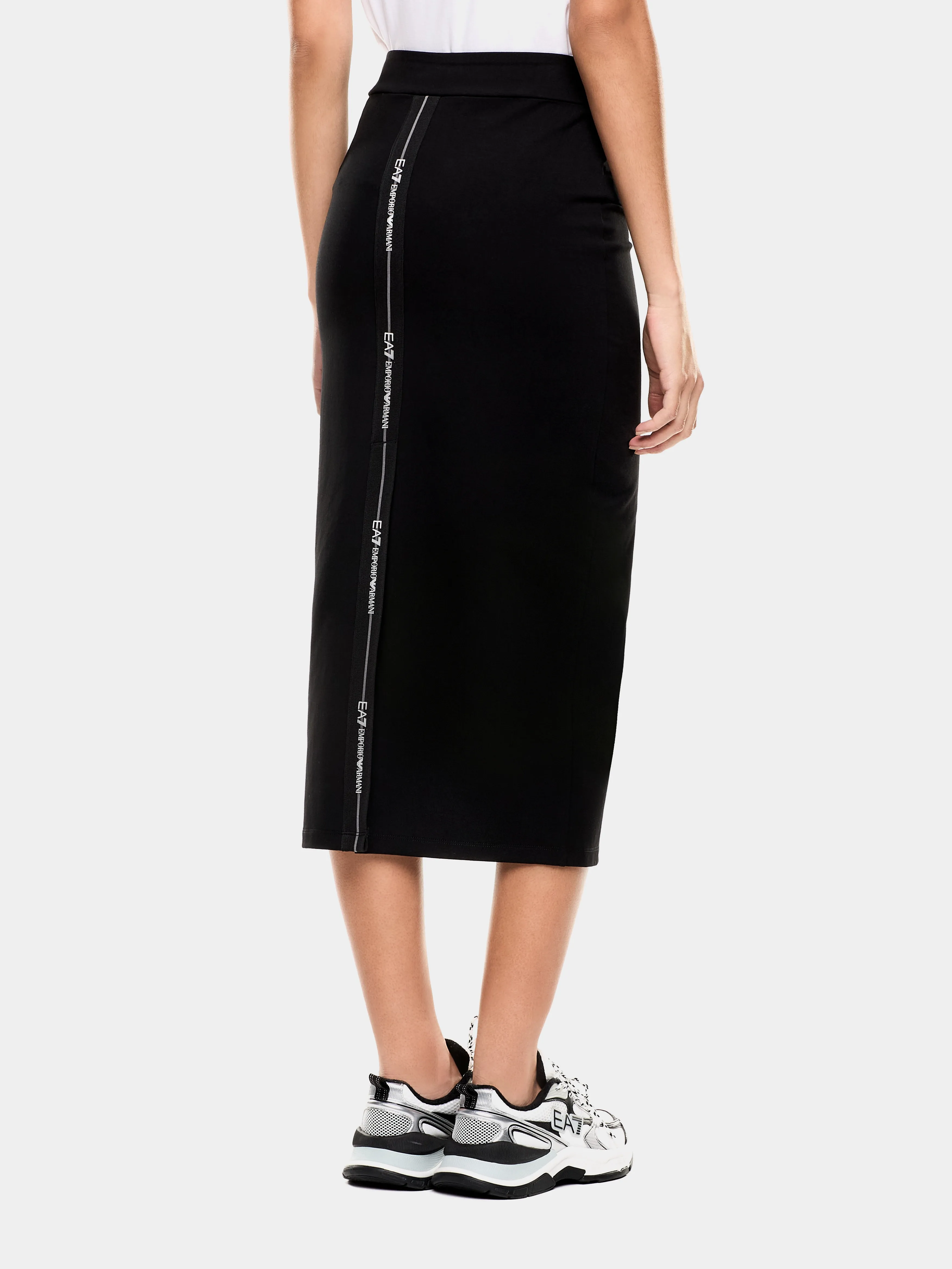 Длинная юбка из эластичного джерси обеспечивает комфорт и мягко повторяет силуэт. Модель украшена фирменной лентой с логотипом, проходящей по всей длине сзади. Универсальный вариант для повседневных образов, который легко сочетать с футболками из коллекции. Выполнена из хлопка с добавлением эластана.