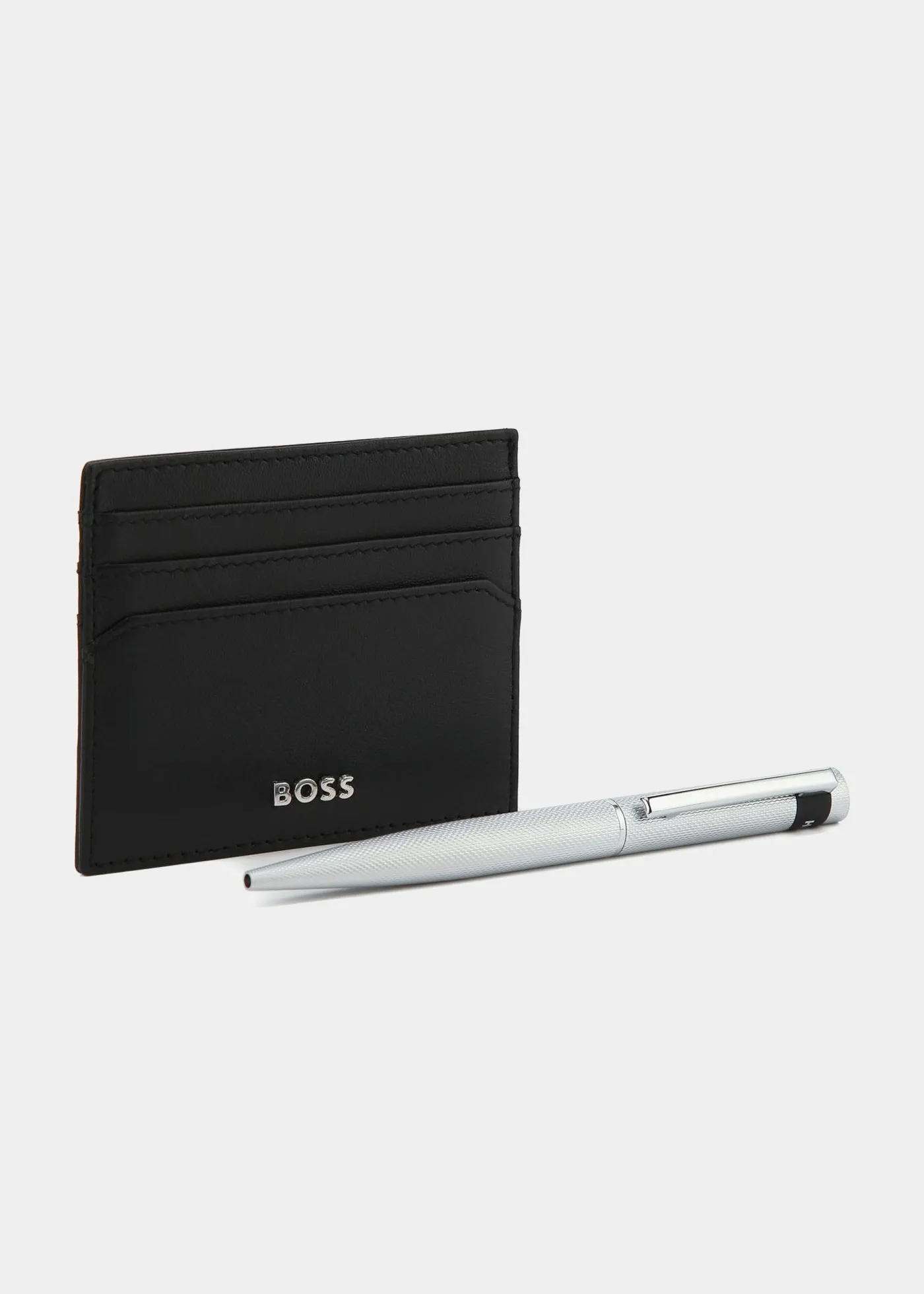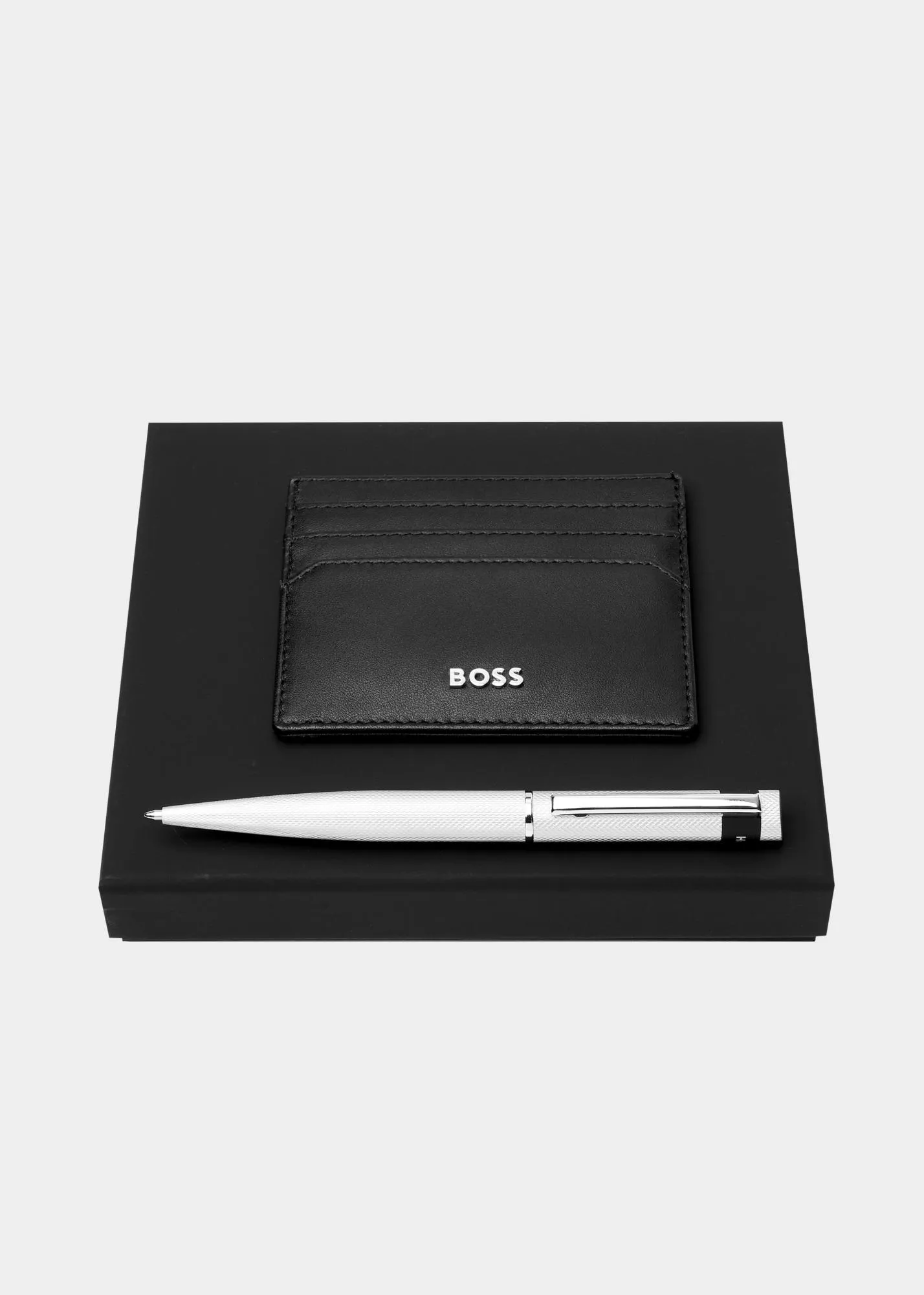 Подарочный набор HUGO BOSS - ручка и визитница из натуральной кожи черного цвета. Стильный и практичный комплект для ценителей качественных аксессуаров. Отличный выбор для подарка коллеге, партнерам или близким.