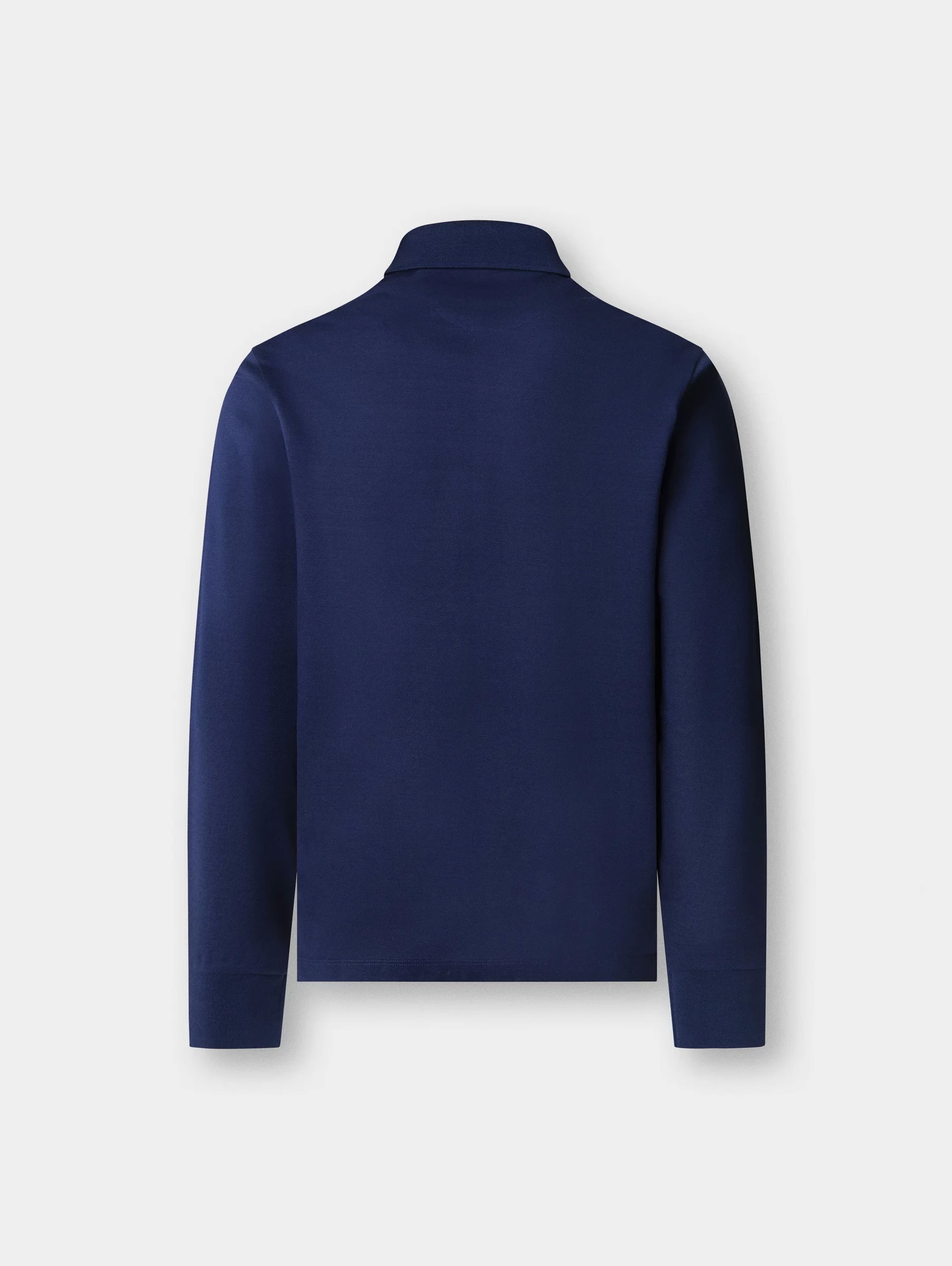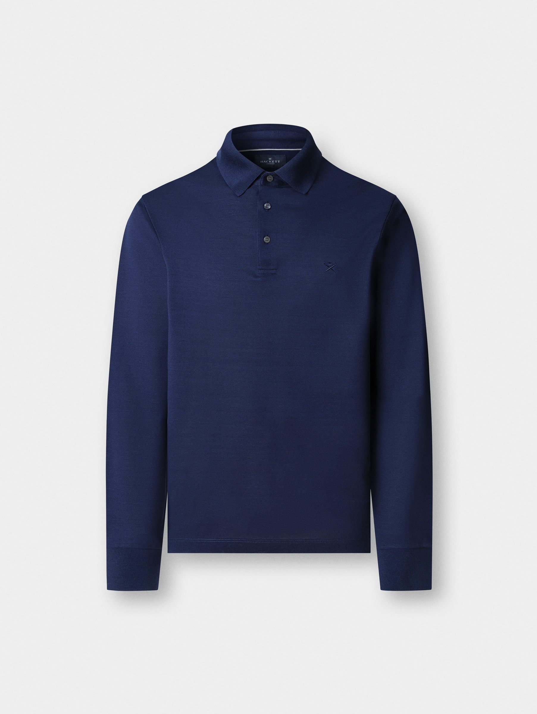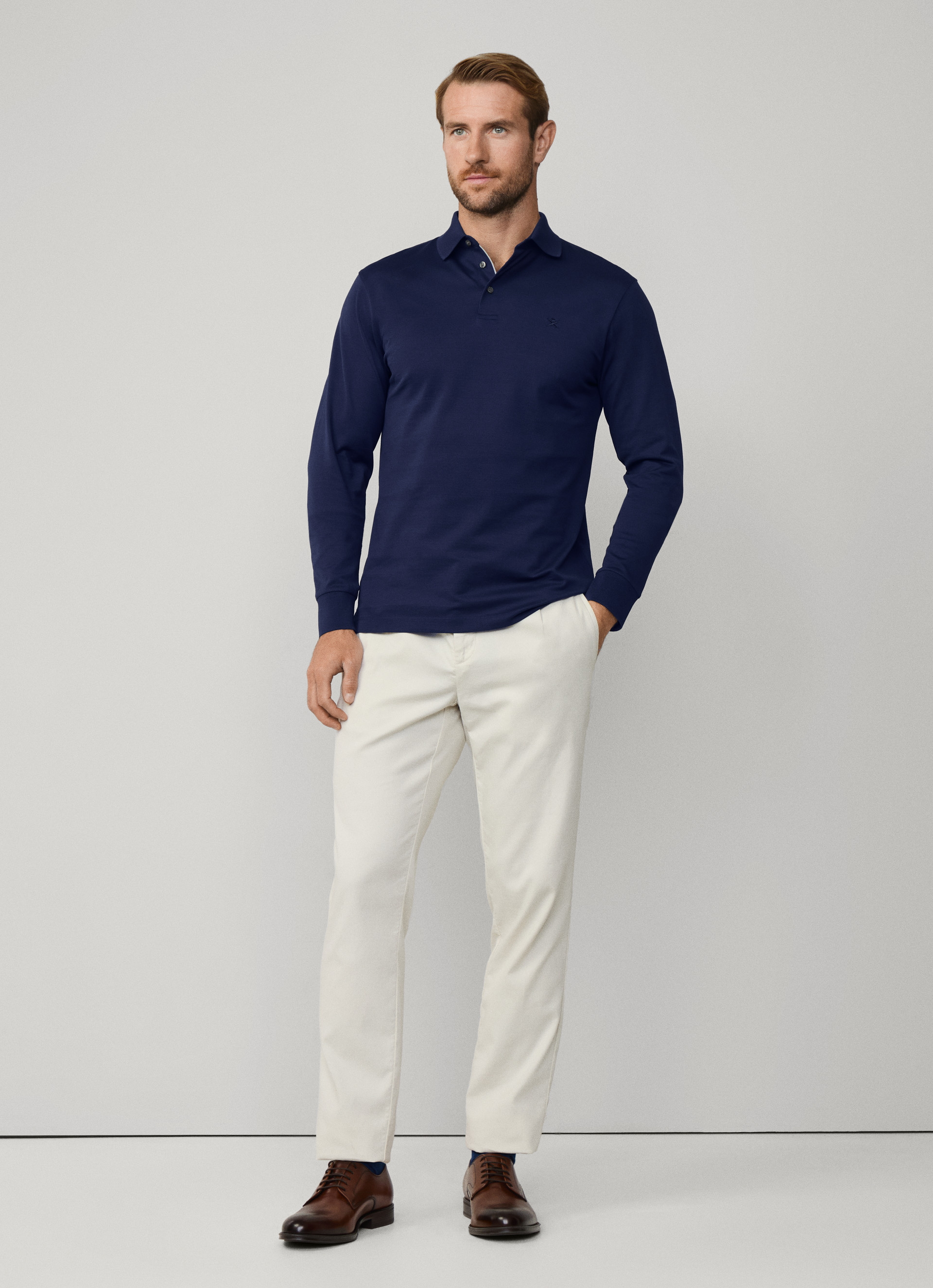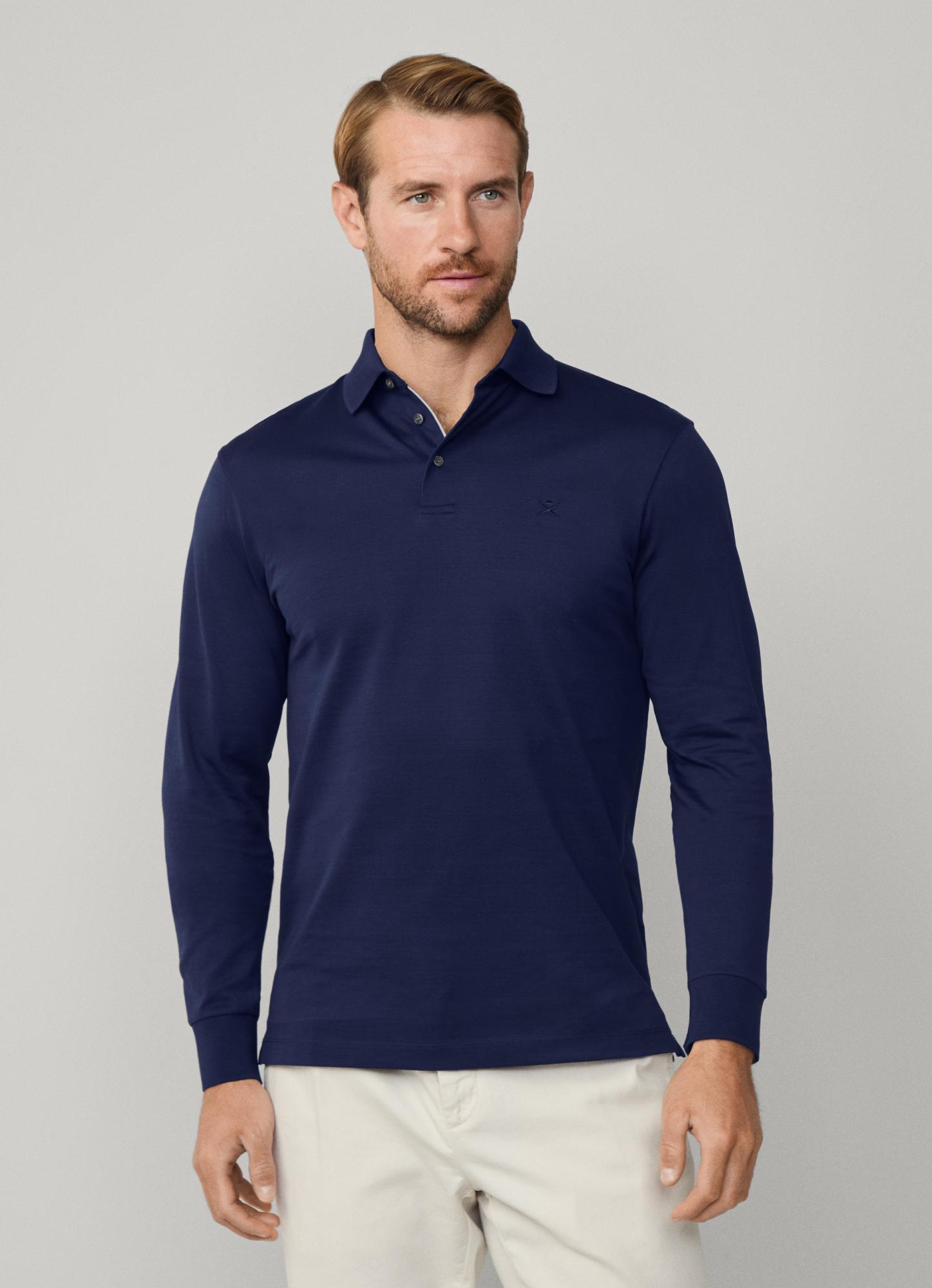 Мужское поло выполнено из 100 % хлопка, отличается классическим прямым кроем, длинными рукавами и планкой на три пуговицы.