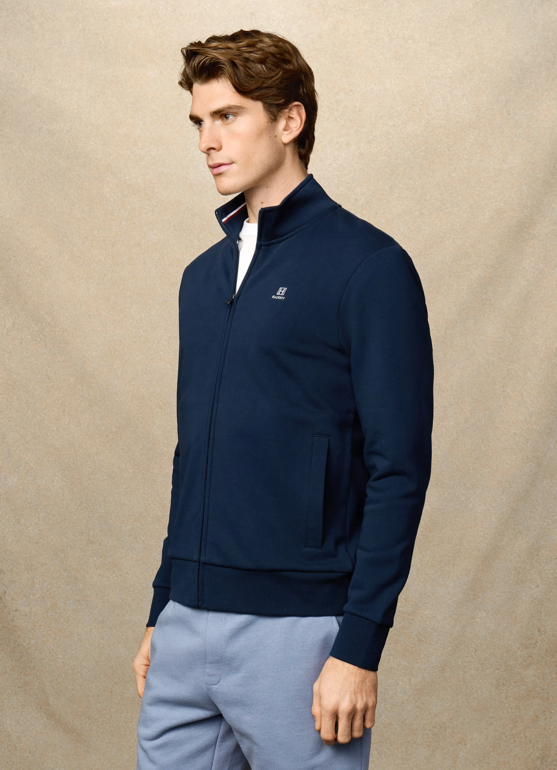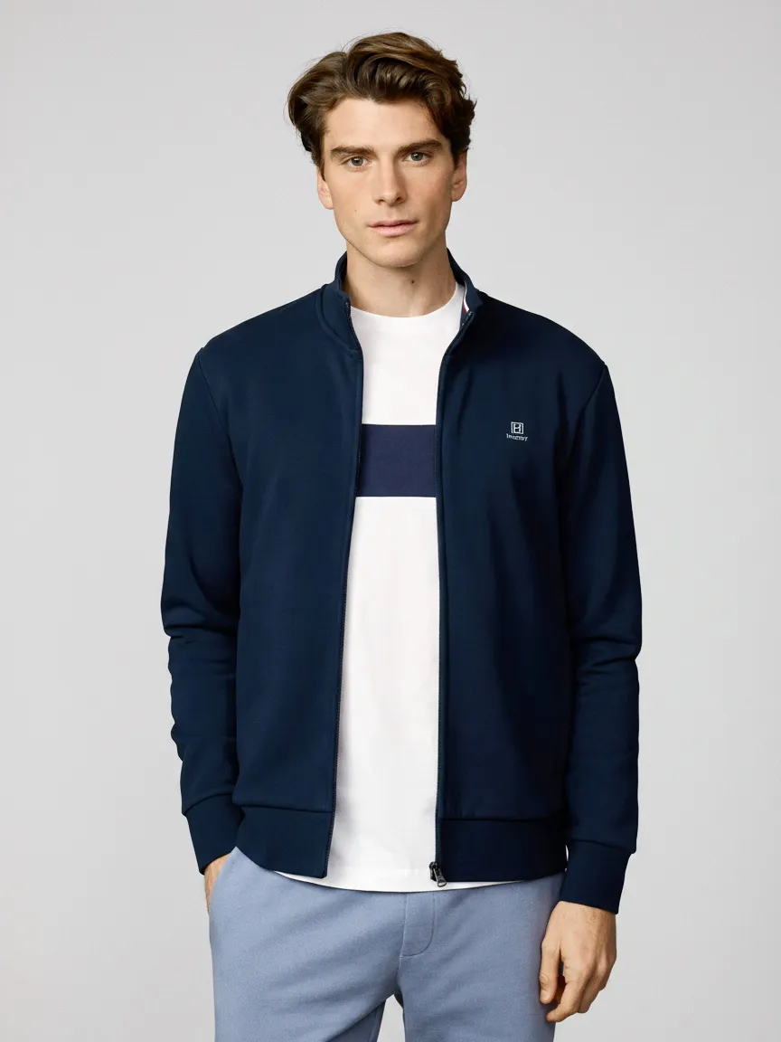 Мужской кардиган из натурального хлопка в лаконичном стиле — универсальный вариант для повседневного гардероба. Воротник-стойка и застежка на молнии обеспечивают комфорт, а фирменный логотип на груди подчеркивает аккуратный брендовый стиль. Универсальная модель для города, работы и отдыха.