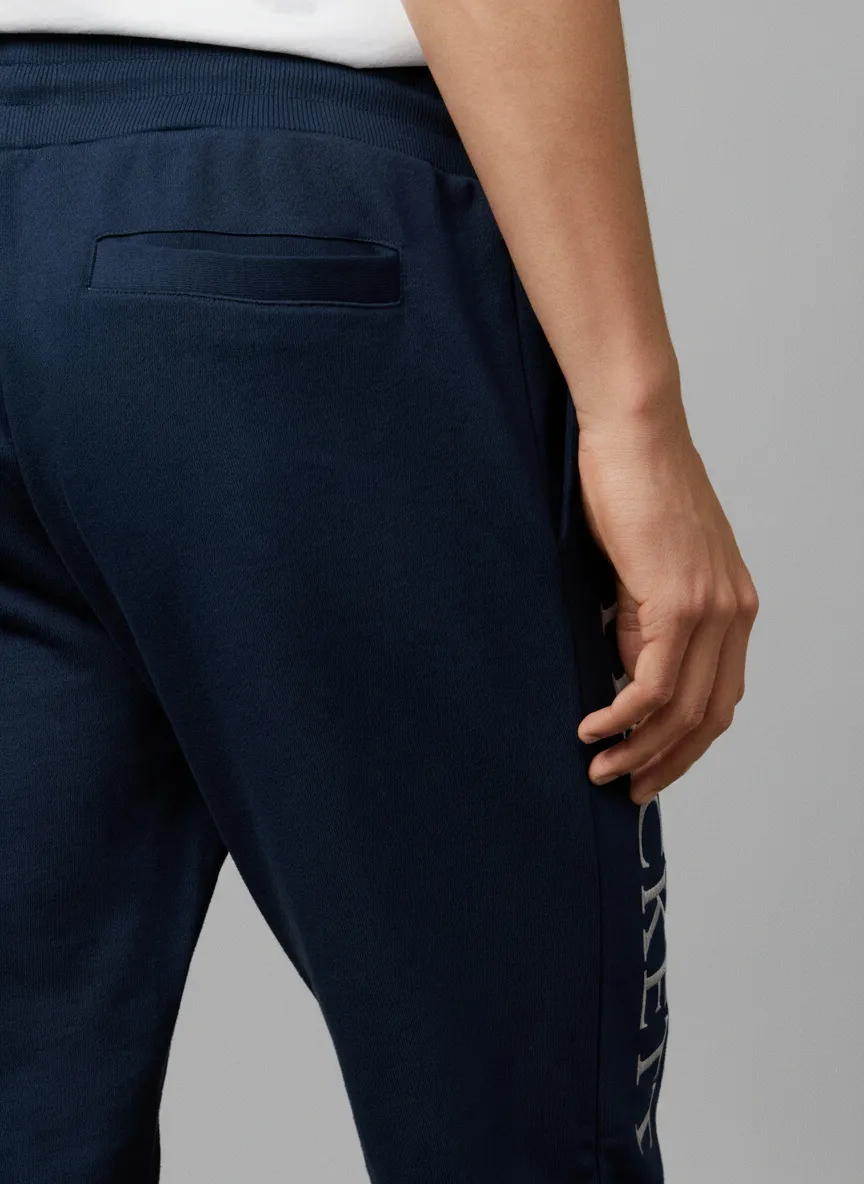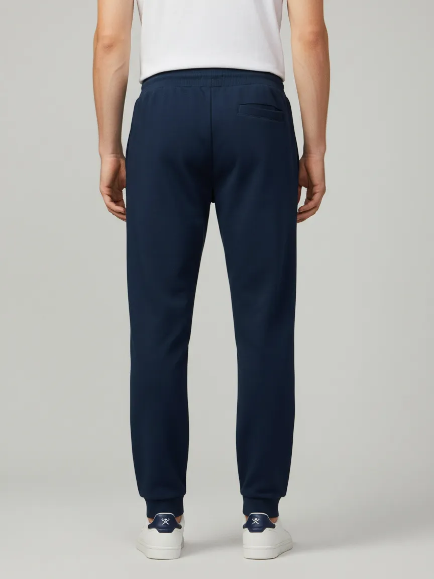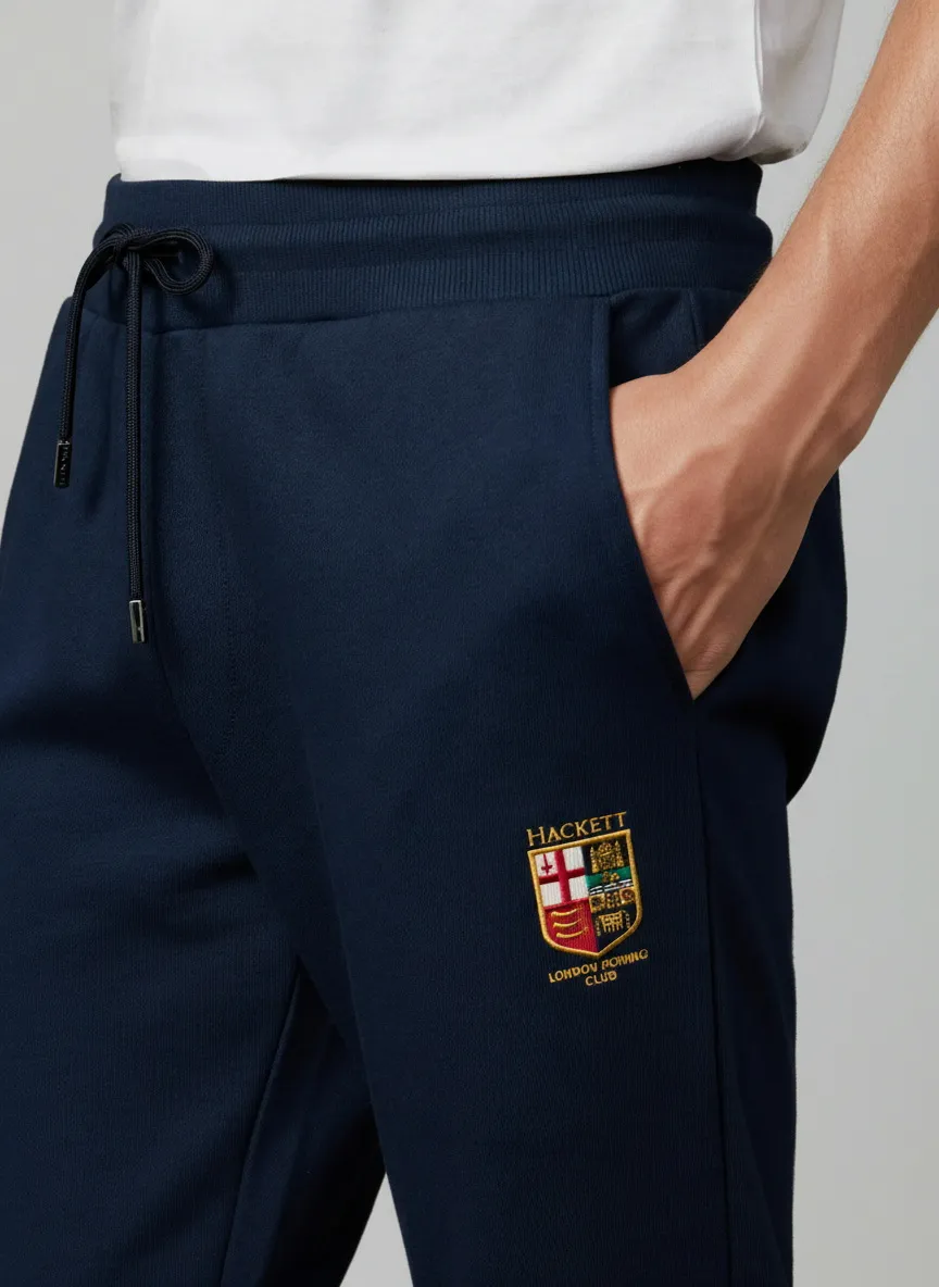 Мужские спортивные брюки зауженного кроя с эластичными манжетами обеспечивают комфорт и свободу движений. Выполнены из натурального хлопка. Фирменные логотип и эмблема по бокам добавляют стильный акцент. Средняя посадка, пояс на резинке с регулируемым шнурком и удобные боковые карманы — идеальный вариант для спорта и повседневной носки.