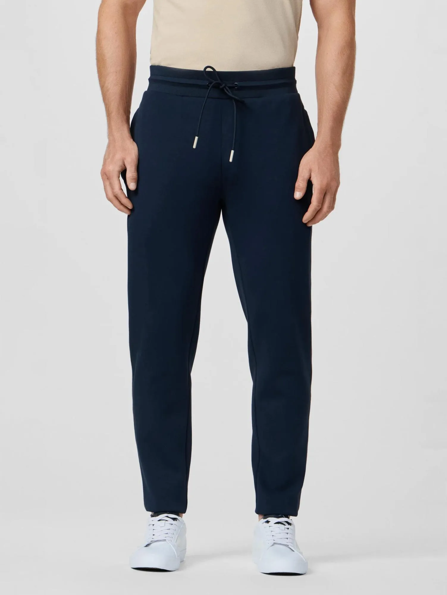 Мужские спортивные брюки зауженного кроя с эластичными манжетами обеспечивают комфорт и свободу движений. Выполнены из смеси хлопка, полиэстера и эластана. Фирменные лампасы и эмблема подчёркивают стиль. Средняя посадка, пояс на резинке с регулируемым шнурком и удобные боковые карманы делают их идеальным выбором для спорта и повседневной носки.