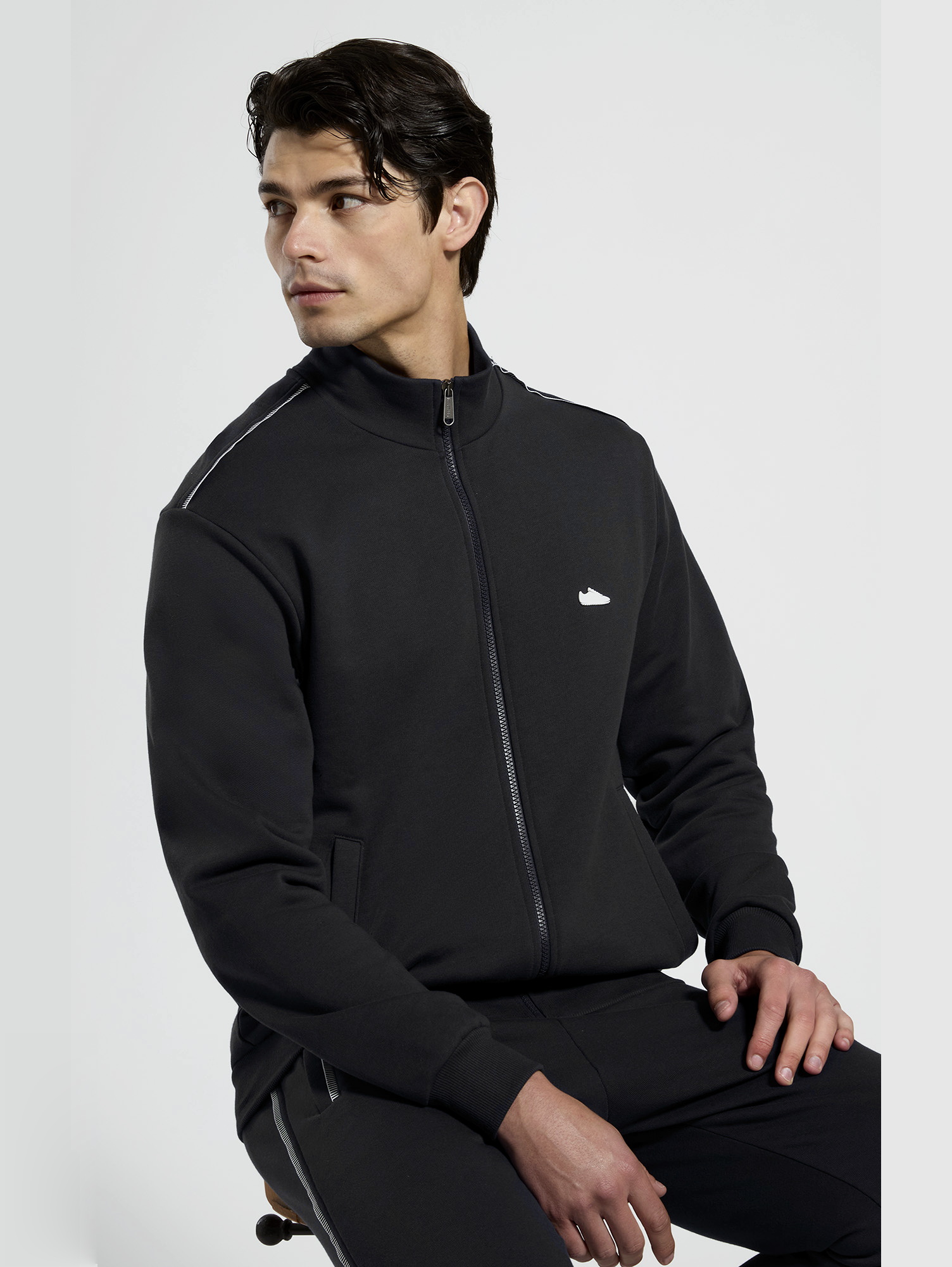 Мужская толстовка на молнии с воротником-стойкой и логотипом на рукавах и плечах. Мягкий хлопок и удобная посадка делают модель практичным выбором для повседневной носки. Можно сочетать со спортивными брюками из коллекции.