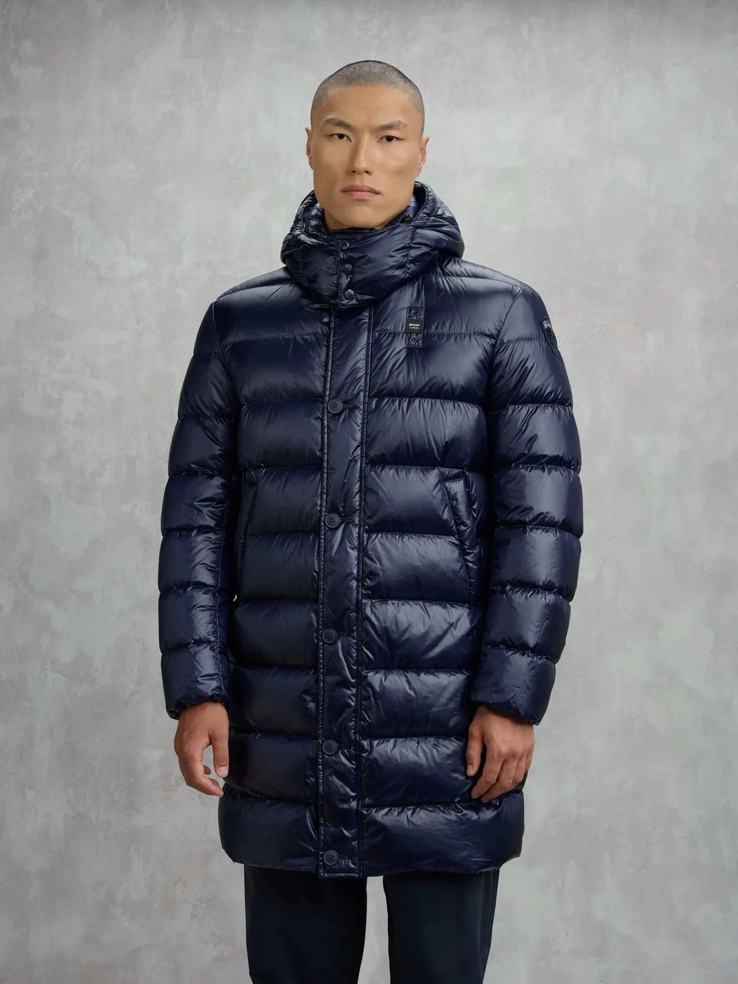 Мужской длинный зимний пуховик из водонепроницаемого глянцевого нейлона тёмно-синего цвета сочетает тепло и лёгкость благодаря натуральному пуховому наполнителю 90/10 плотностью 260 г. Стёганый дизайн дополнен съёмным капюшоном на трёх кнопках и контрастной подкладкой. Модель застёгивается на молнию и пуговицы, оснащена карманами на кнопках, внутренними карманами на липучках и двойными манжетами с внутренней резинкой.