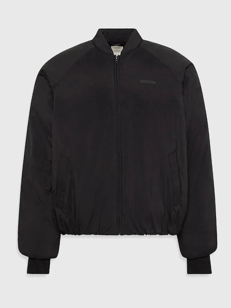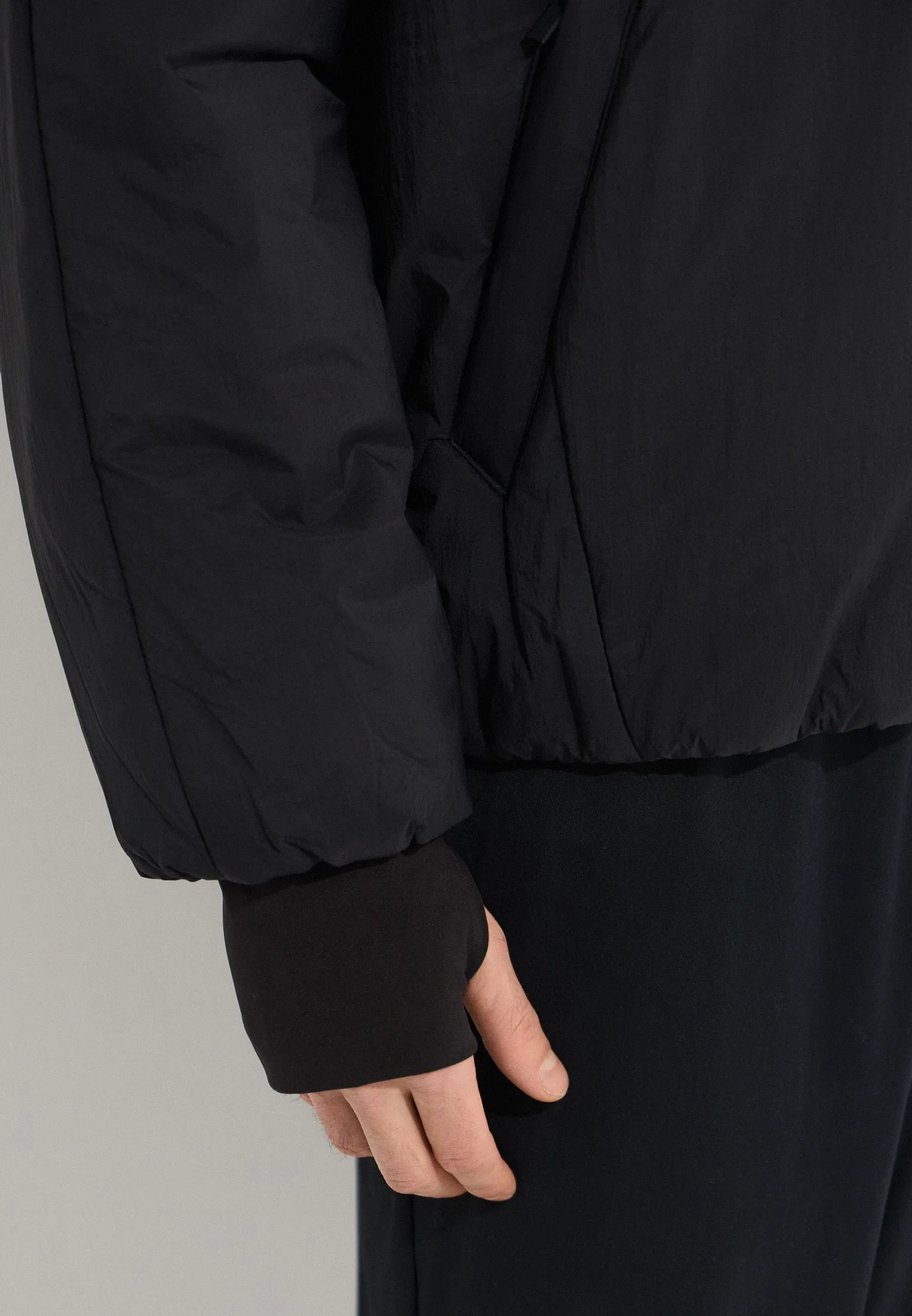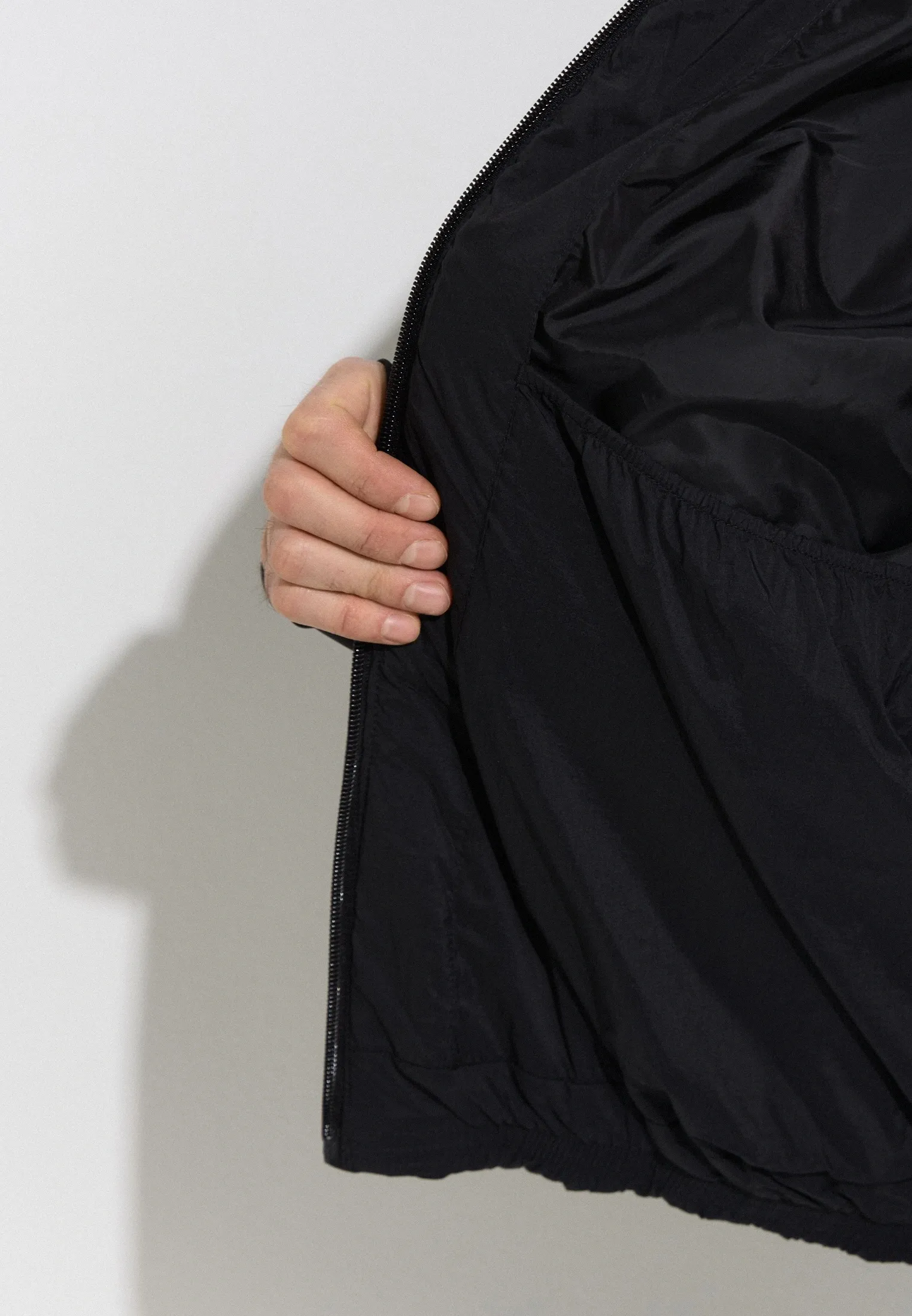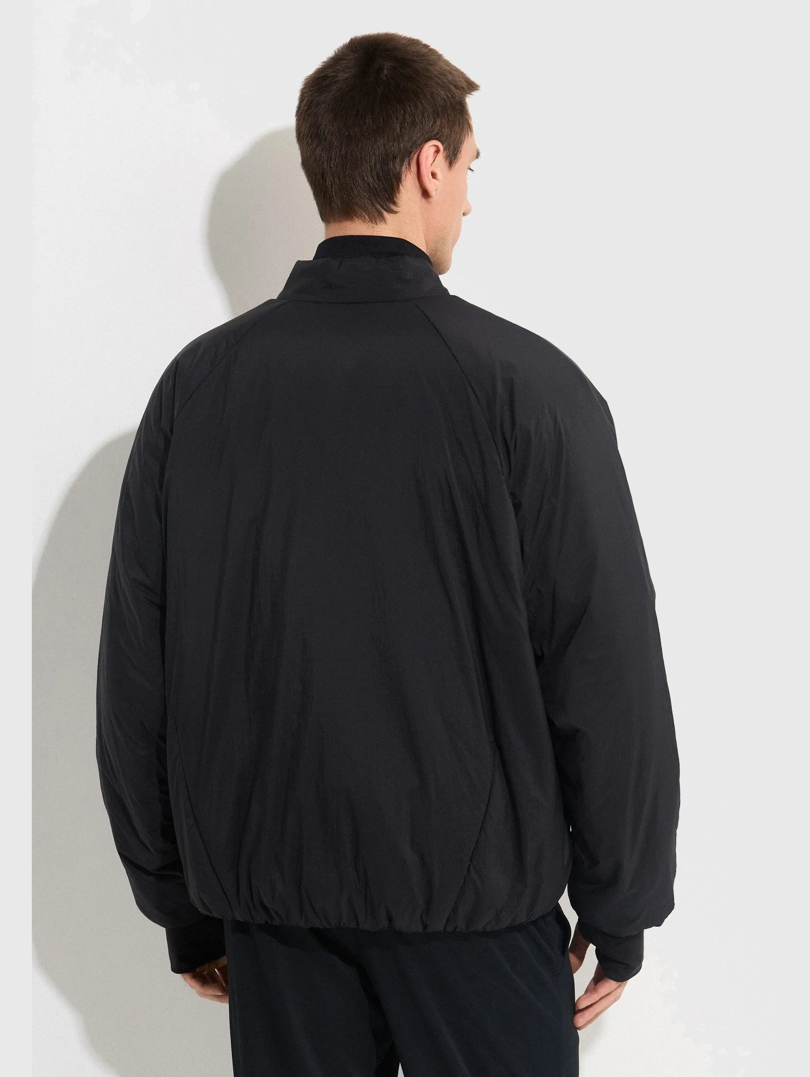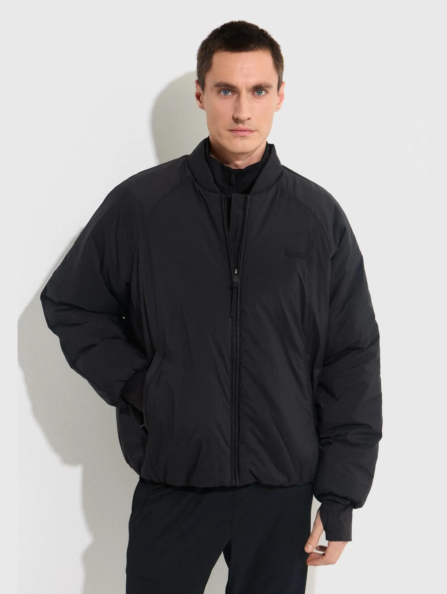 Мужской утепленный бомбер оверсайз. Модель с рукавами реглан и эластичными внутренними манжетами с отверстием для большого пальца. Застегивается на молнию, дополнена воротником-стойкой.