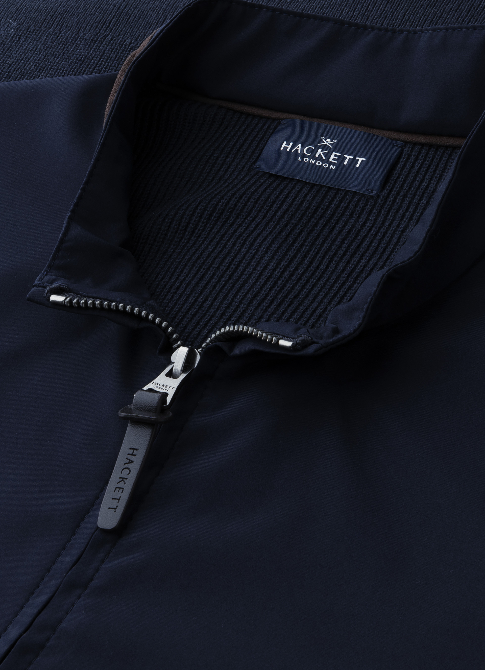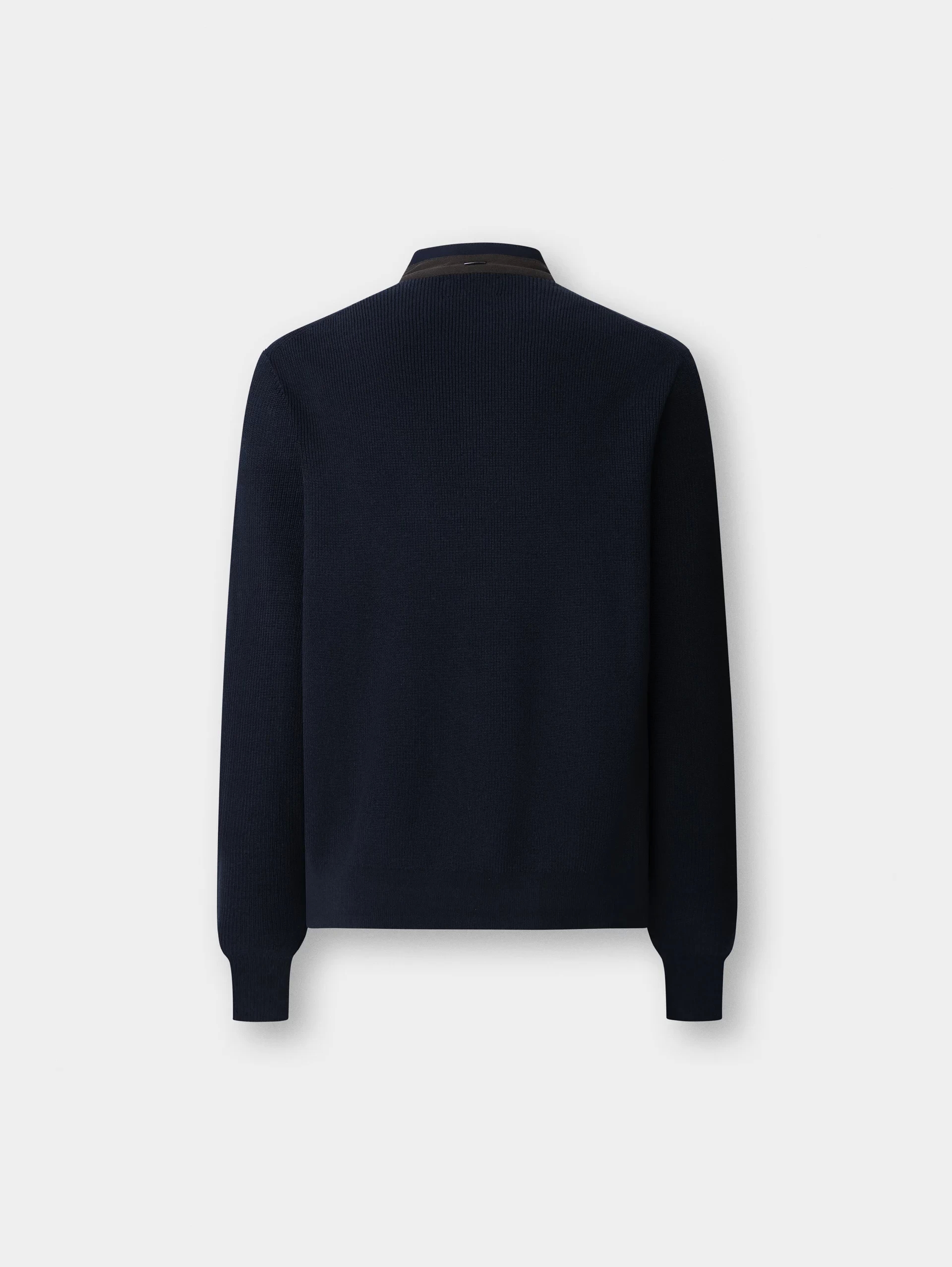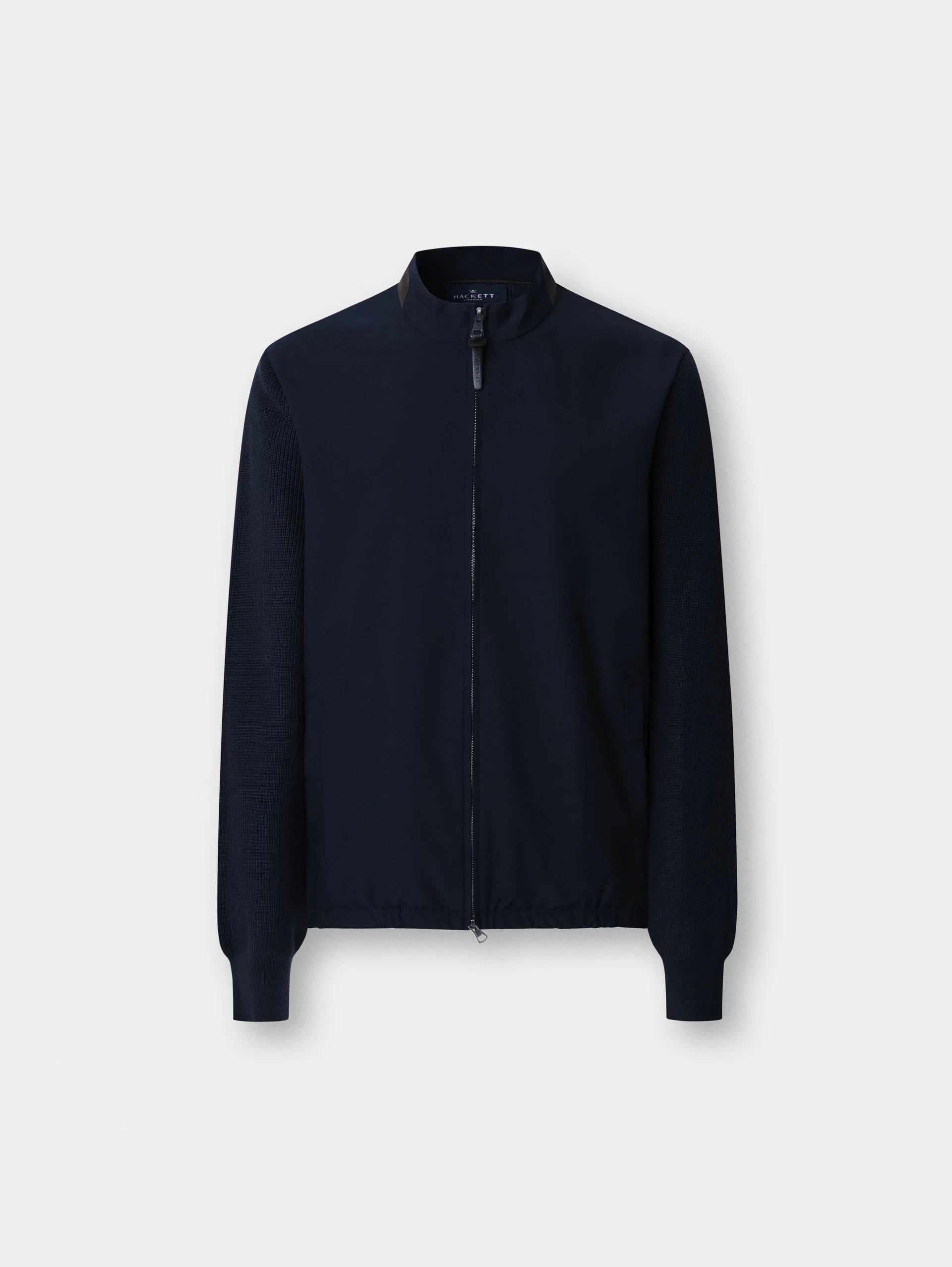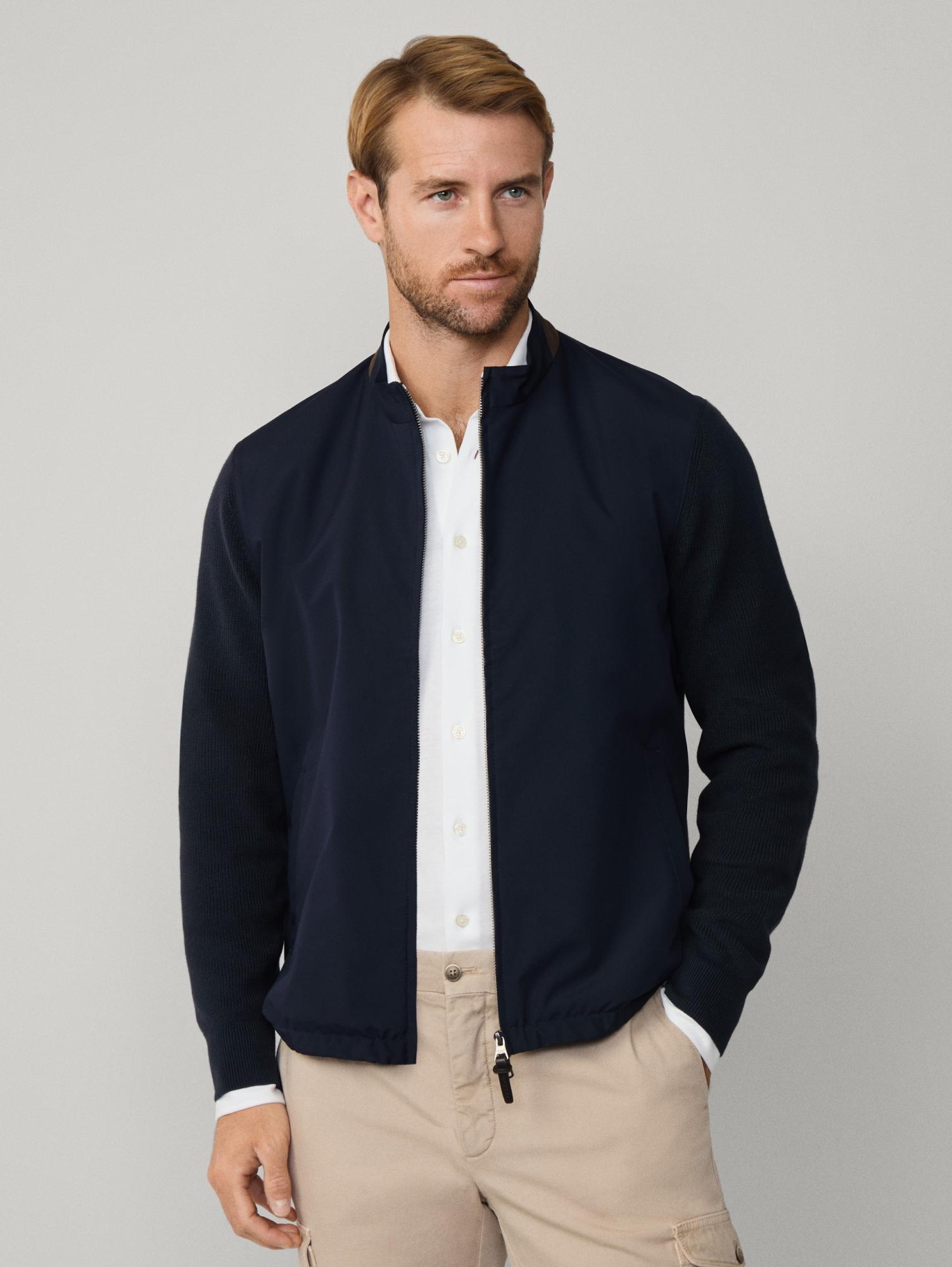 Мужская ветровка выполнена в гибридном стиле: передняя часть из лёгкого нейлона надёжно защищает от ветра, а спинка и рукава связаны из мягкого хлопкового трикотажа, обеспечивая комфорт и свободу движений. Модель оснащена двусторонней молнией с кожаным язычком, боковыми карманами и ребристыми манжетами. Универсальная вещь для повседневного образа, сочетающая практичность верхней одежды и уют кардигана.