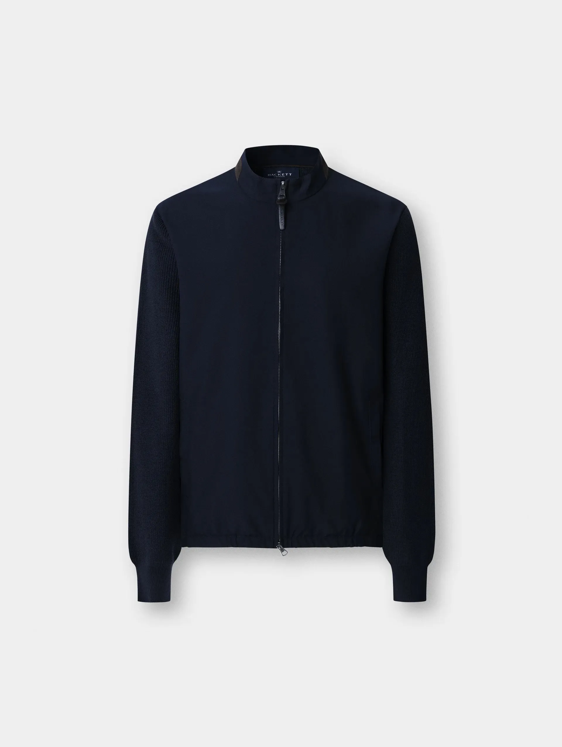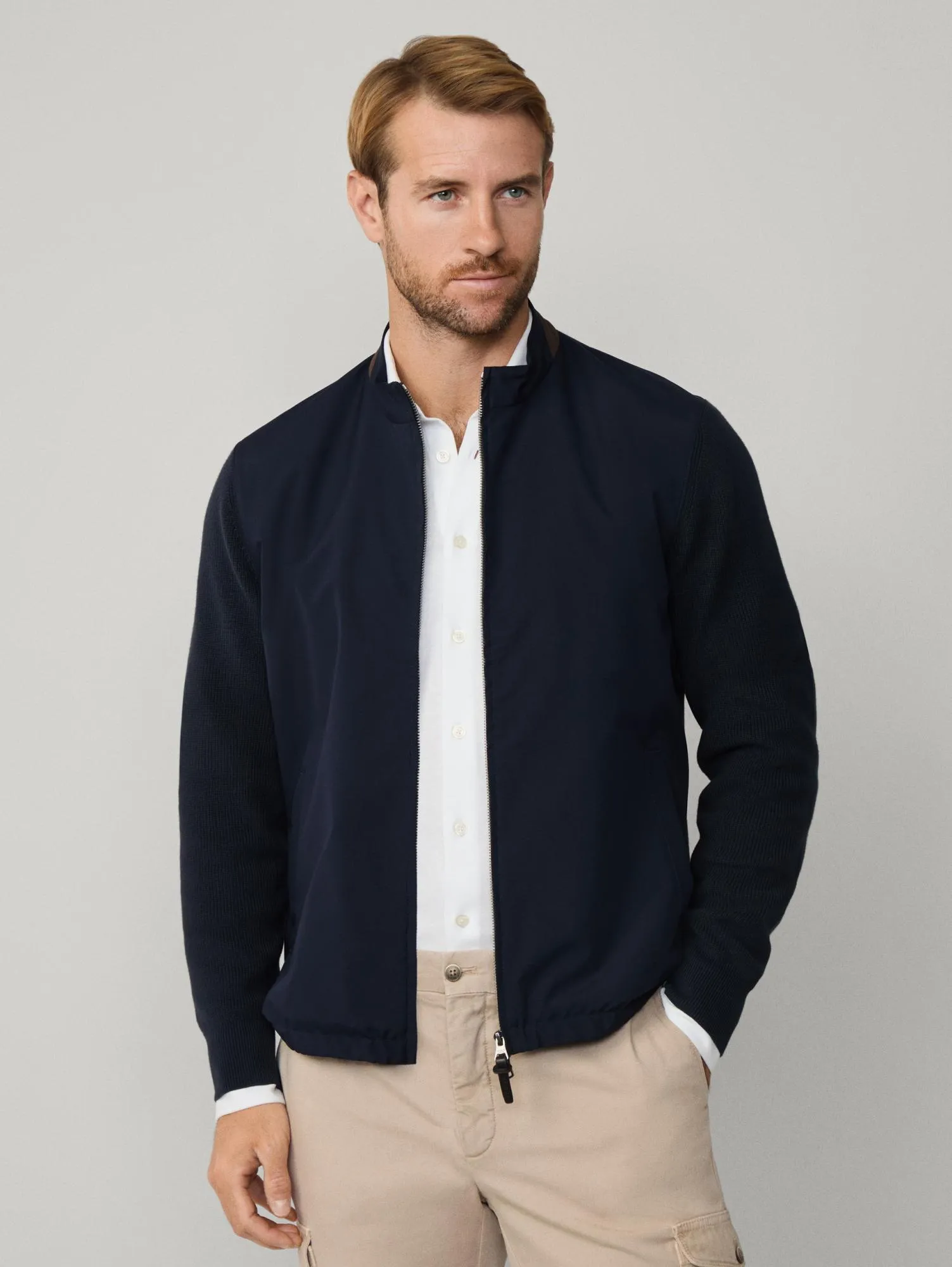 Мужская ветровка выполнена в гибридном стиле: передняя часть из лёгкого нейлона надёжно защищает от ветра, а спинка и рукава связаны из мягкого хлопкового трикотажа, обеспечивая комфорт и свободу движений. Модель оснащена двусторонней молнией с кожаным язычком, боковыми карманами и ребристыми манжетами. Универсальная вещь для повседневного образа, сочетающая практичность верхней одежды и уют кардигана.