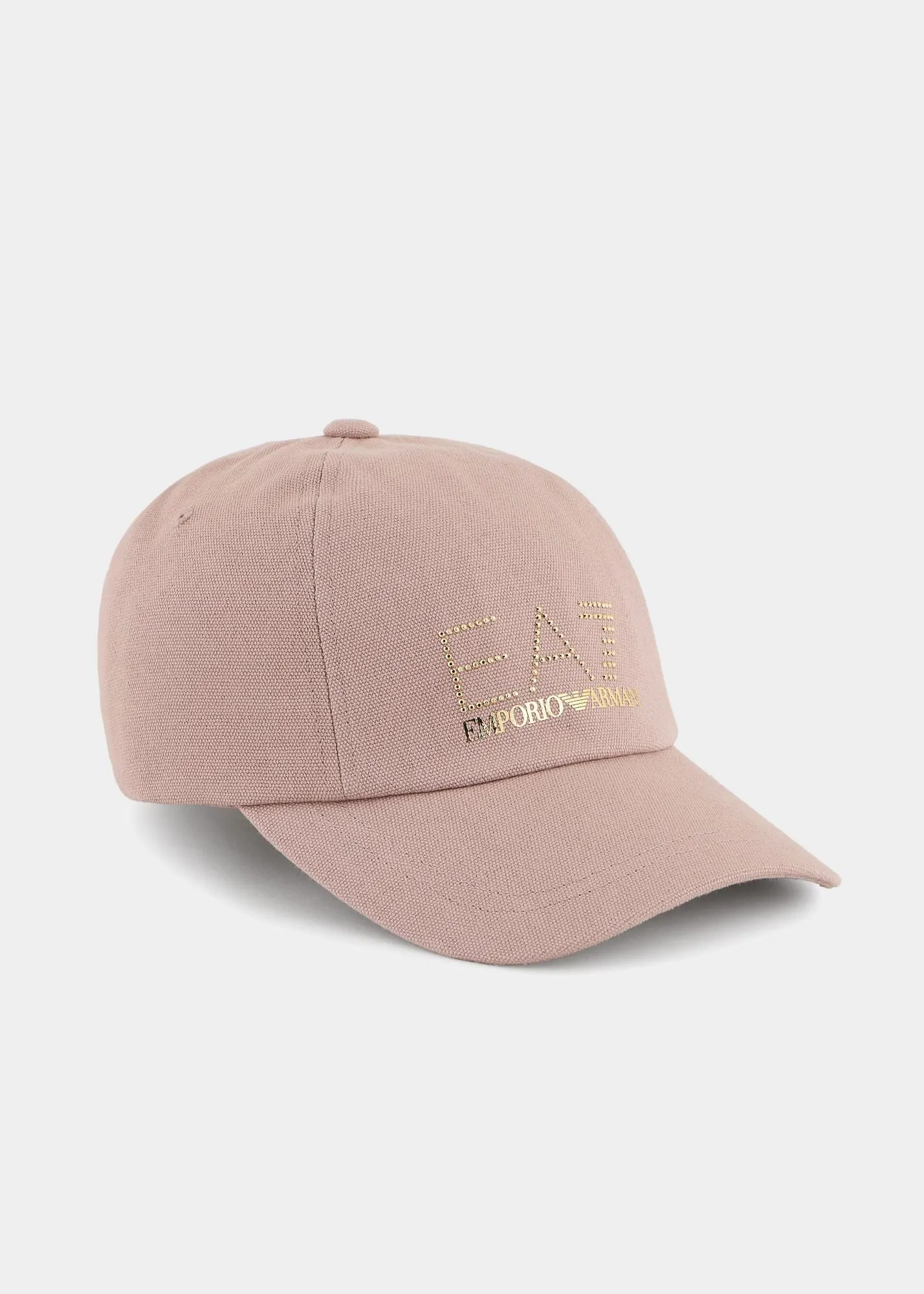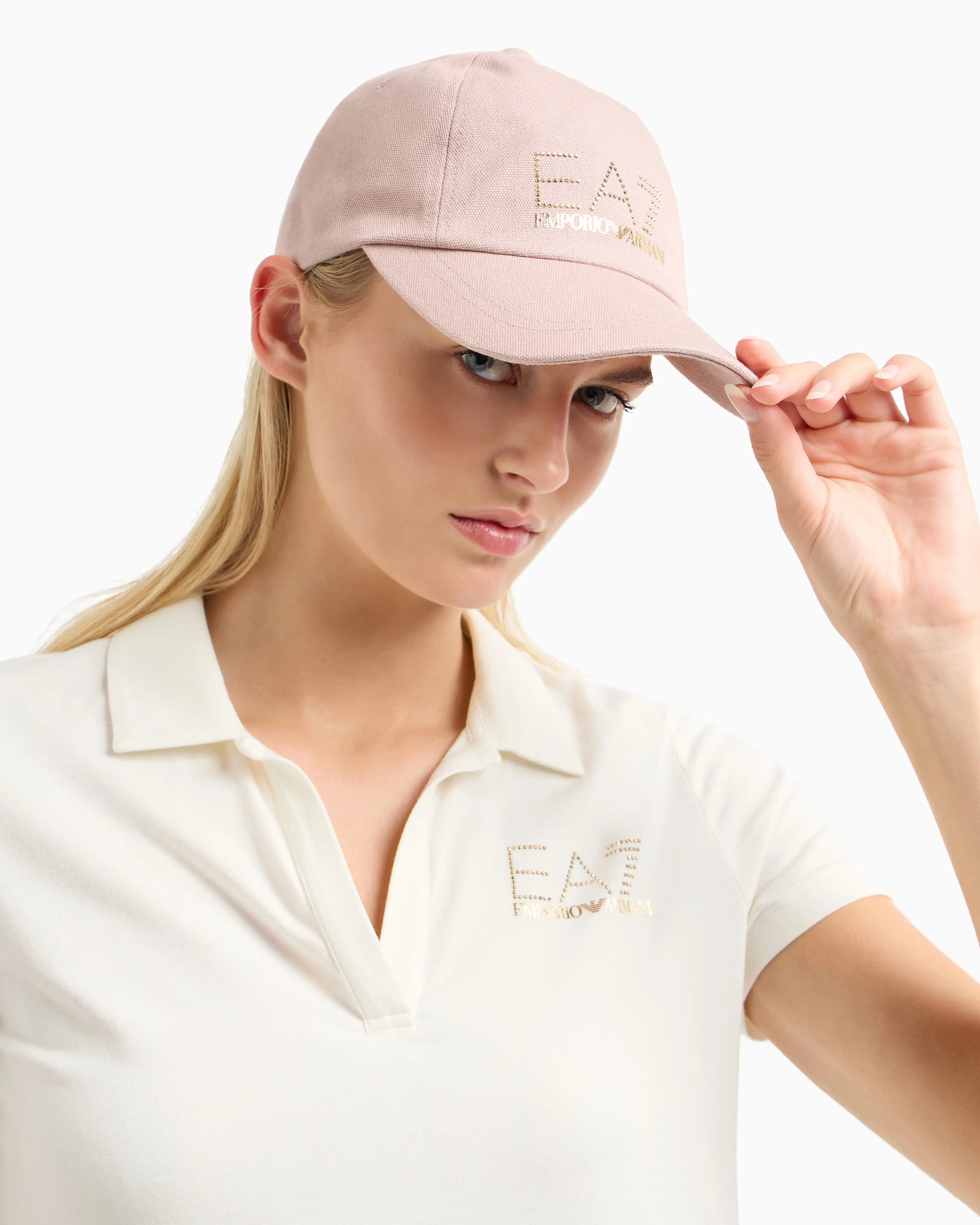 Женская кепка розового цвета с золотистым логотипом EA7, регулируемым объемом, защищает от яркого солнца. Дышащий хлопок, из которого изготовлена кепка, и вентиляционные отверстия поддерживают комфортную температуру головы.