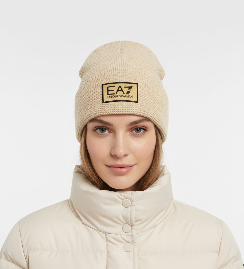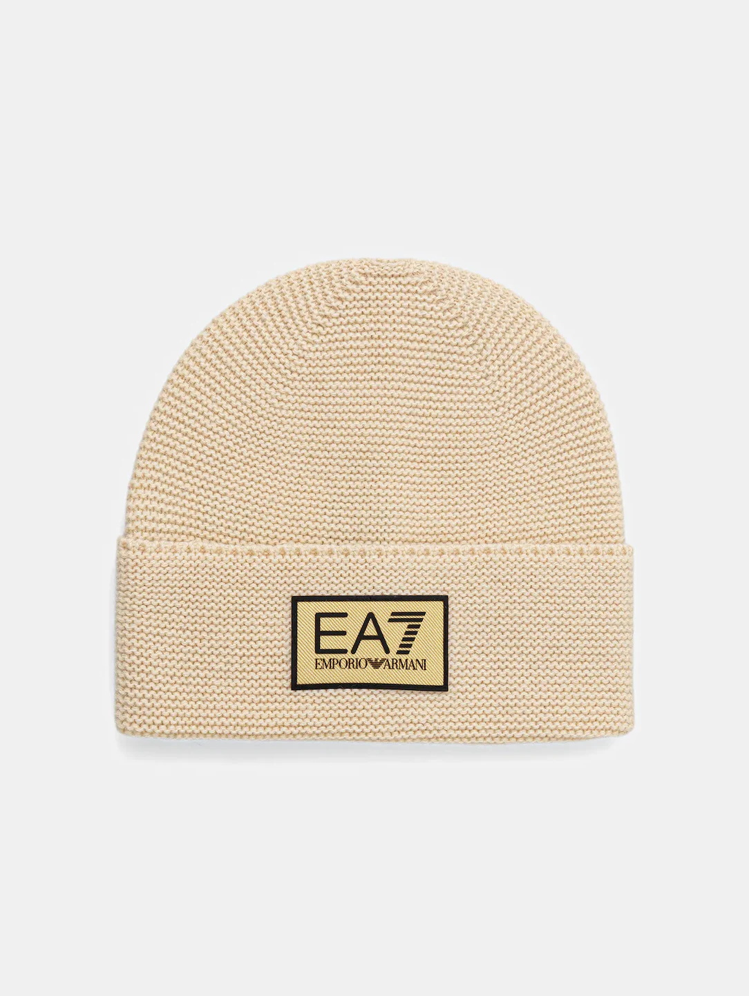 Шапка EA7 Emporio Armani бежевого цвета с фирменной нашивкой выполнена из мягкой шерсти с добавлением полиамида. Отличается приятной текстурой, комфортом и долговечностью.
