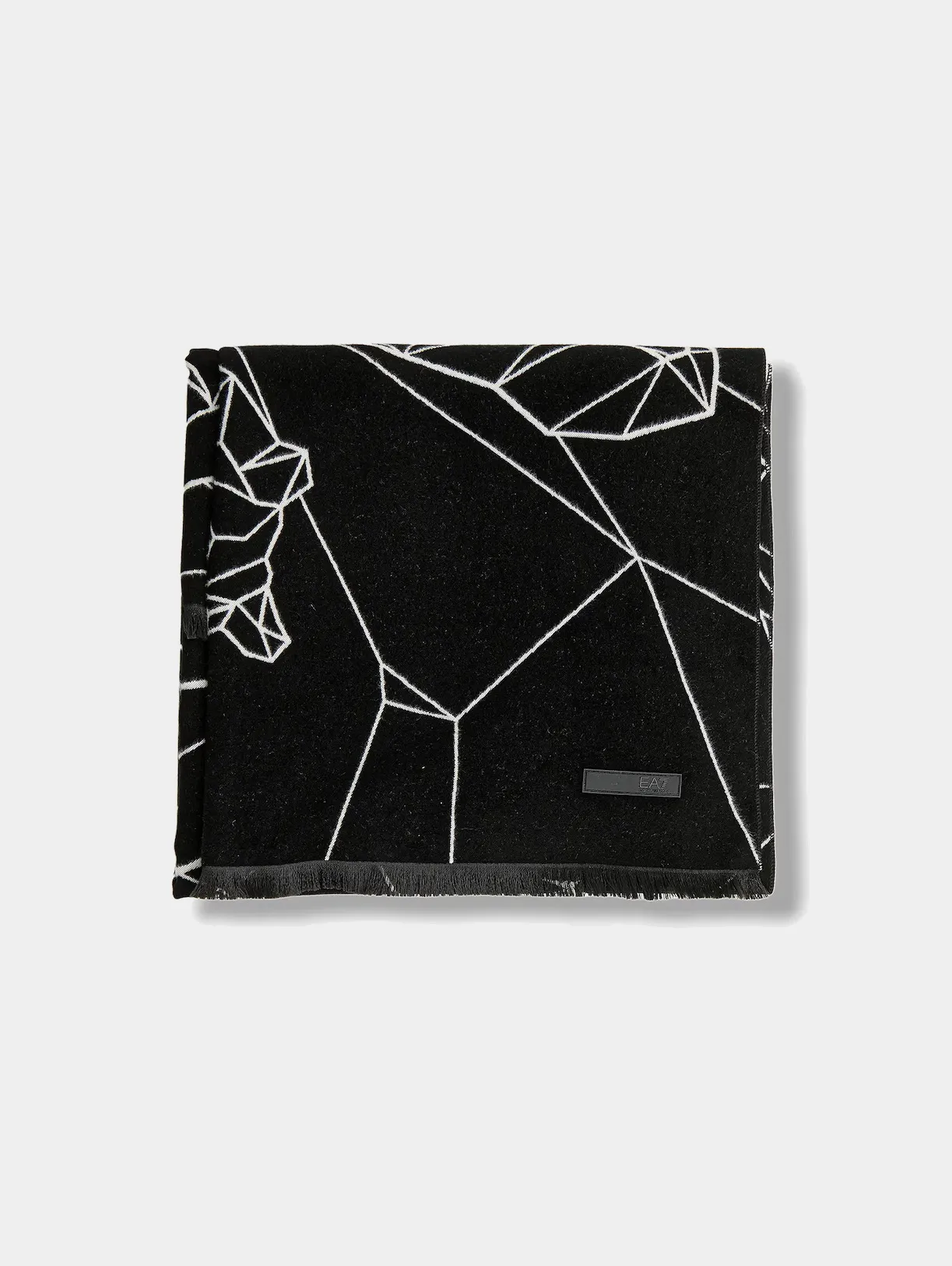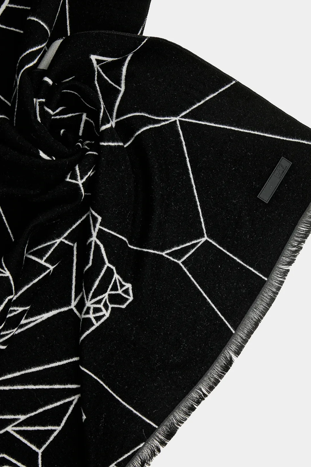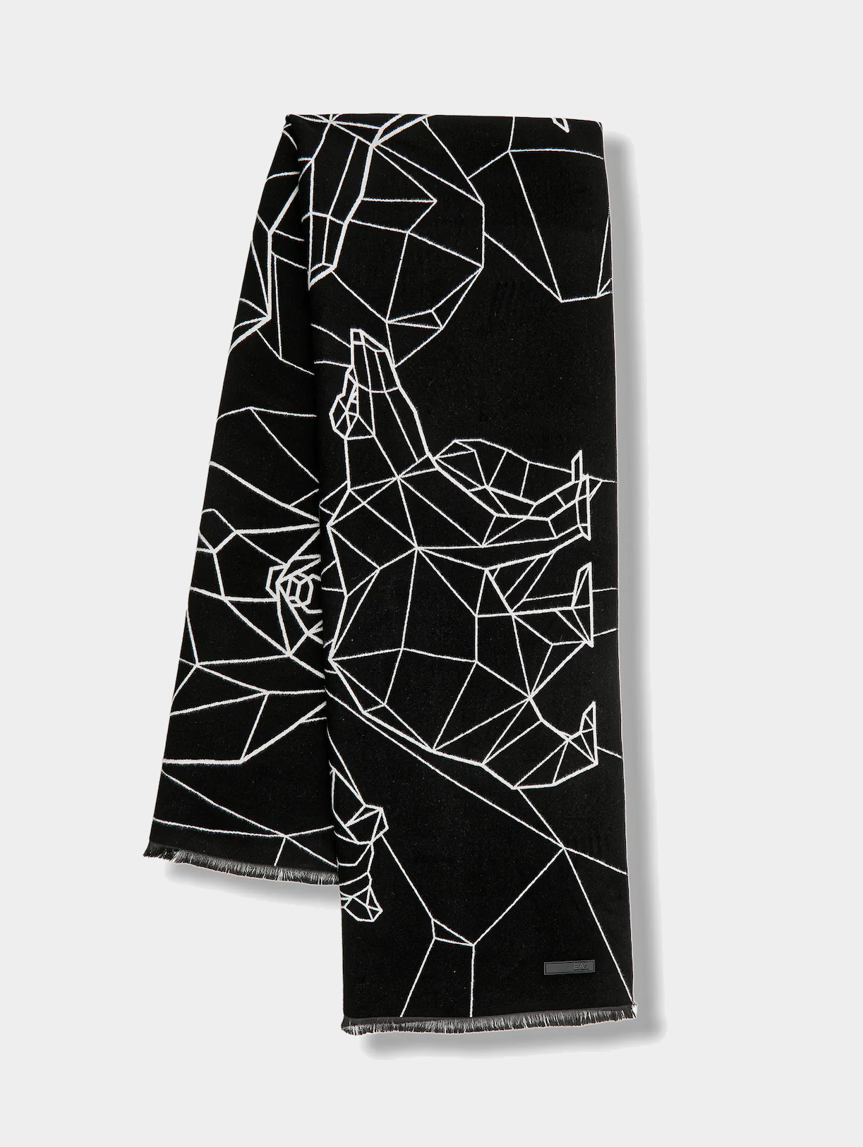 Шарф из вискозы и полиэстера декорирован фирменным графическим принтом с изображением полярного медведя. Контраст черного фона и белого рисунка подчеркивает лаконичный стиль аксессуара.