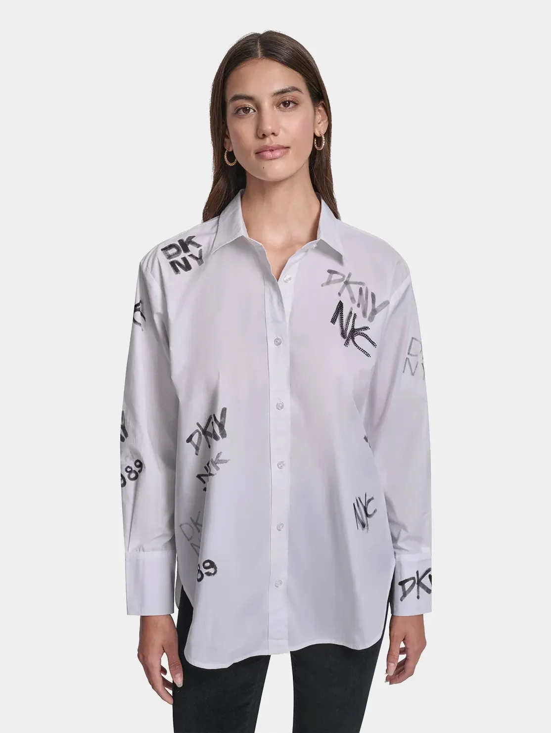 Женская рубашка DKNY свободного прямого кроя с фирменным принтом. Модель с длинными рукавами и заниженной линией плеч, дополненная асимметричным закруглённым подолом.