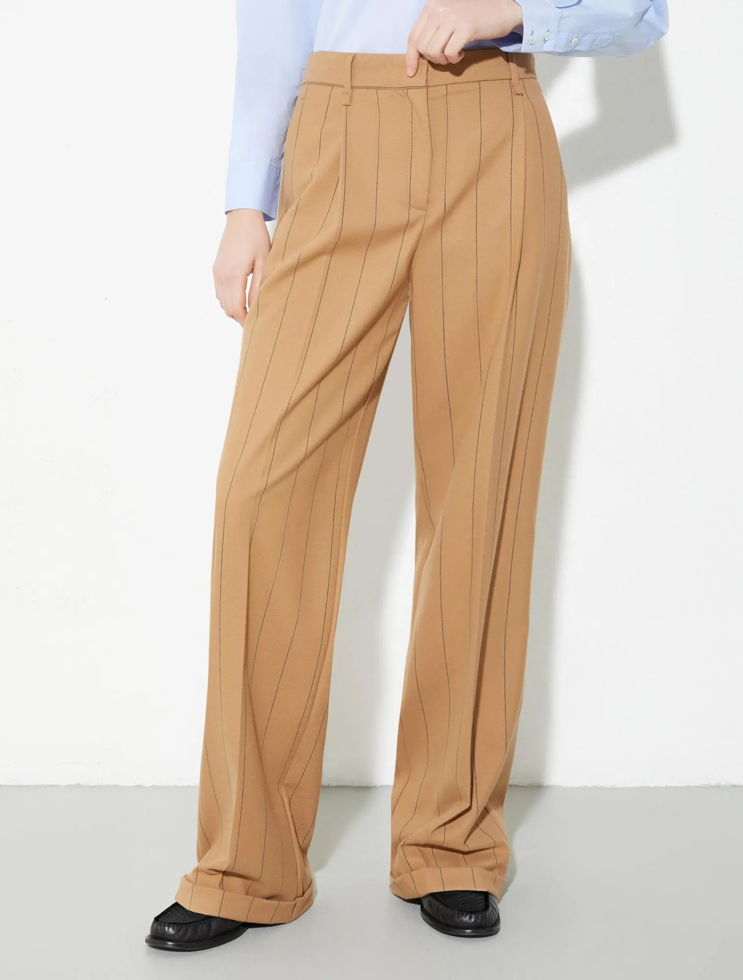 Женские брюки со стрелками SACCA от MAX&Co. из мягкой эластичной фланели — стильное решение для повседневных и деловых образов. Прямой удлинённый крой с отворотами по низу создаёт расслабленный силуэт. Модель со средней посадкой, шлёвками для ремня, косыми карманами спереди и карманами сзади.