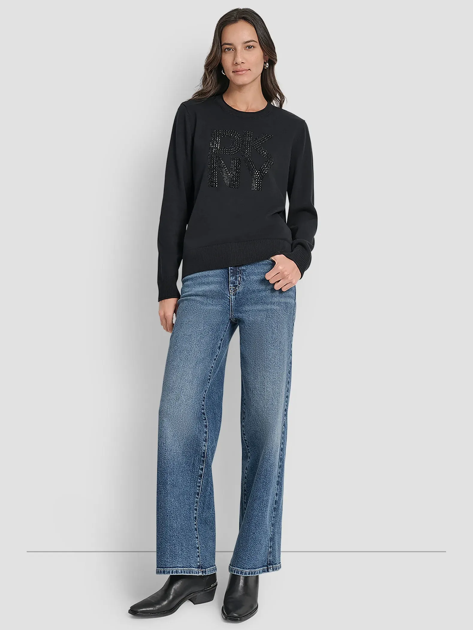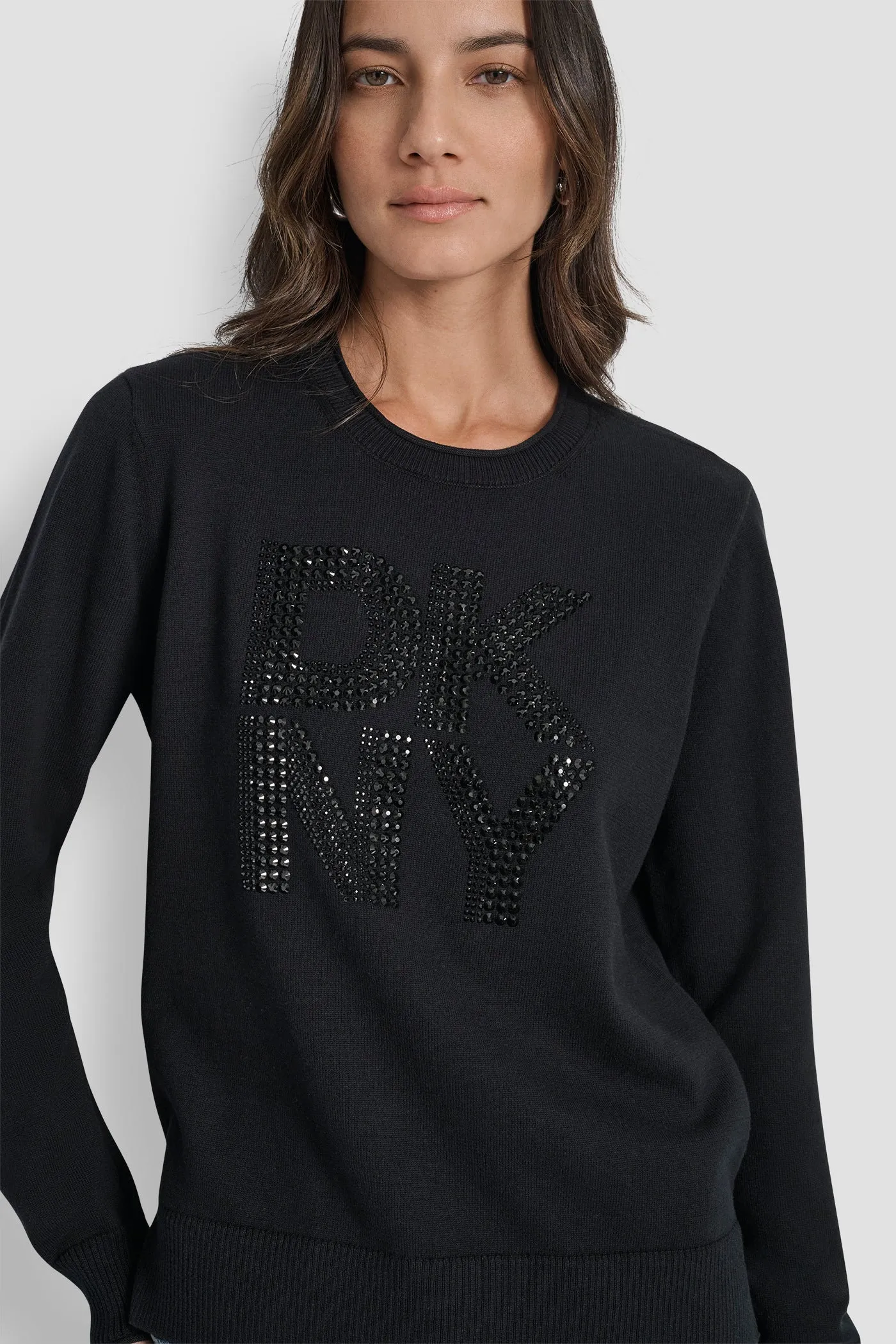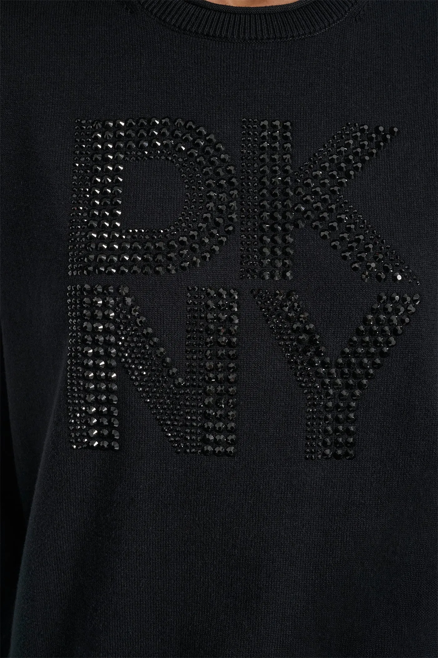 Женский трикотажный джемпер из натурального хлопка с фирменным логотипом, украшенным стразами. Идеальный выбор для современных повседневных образов.