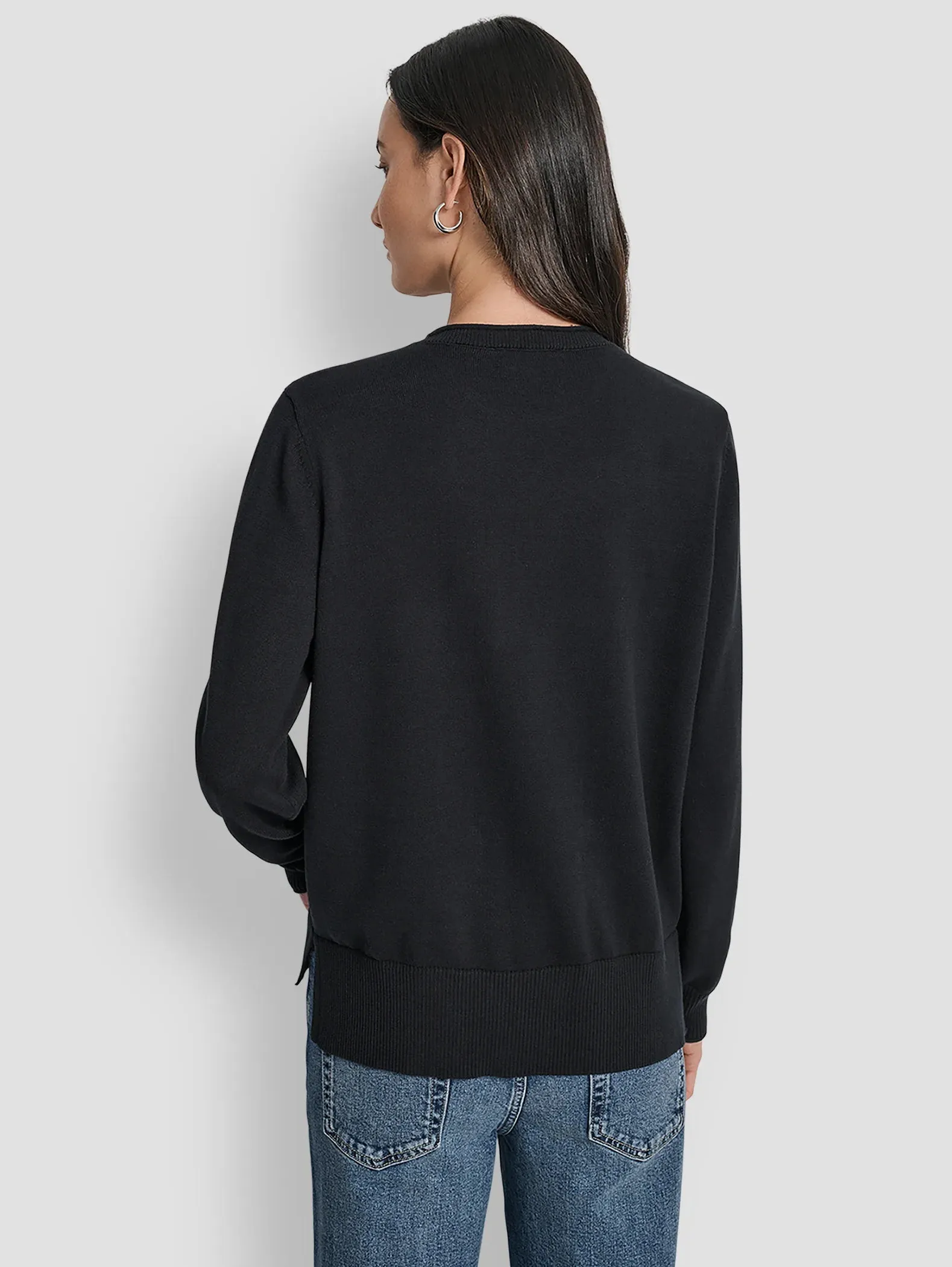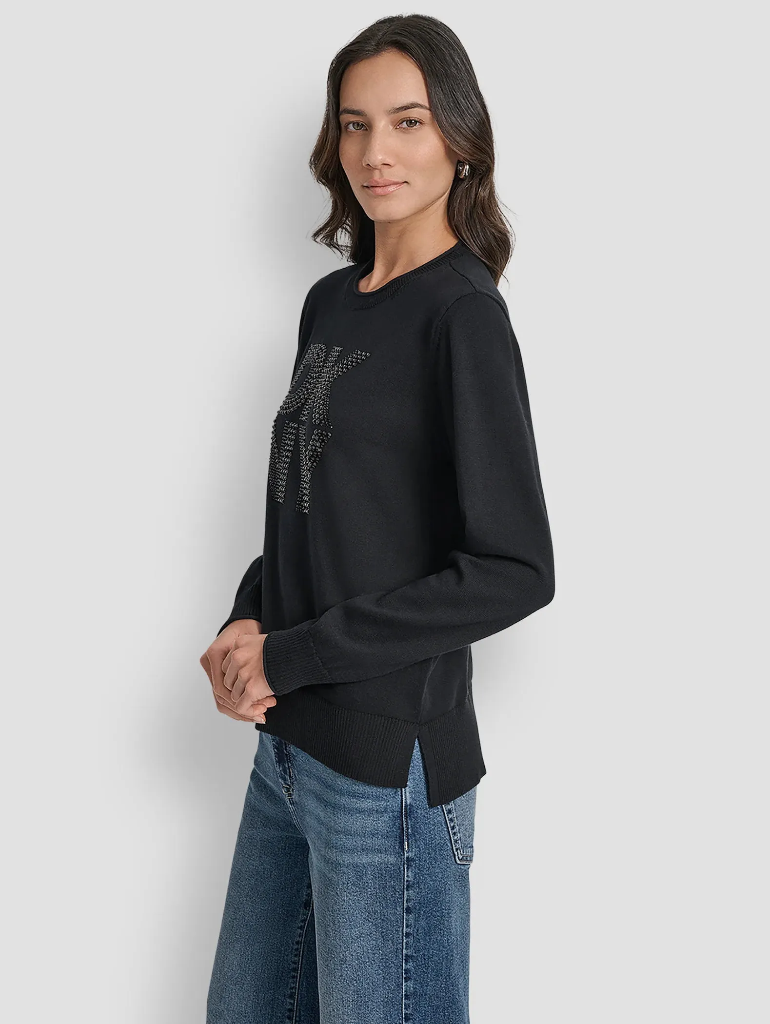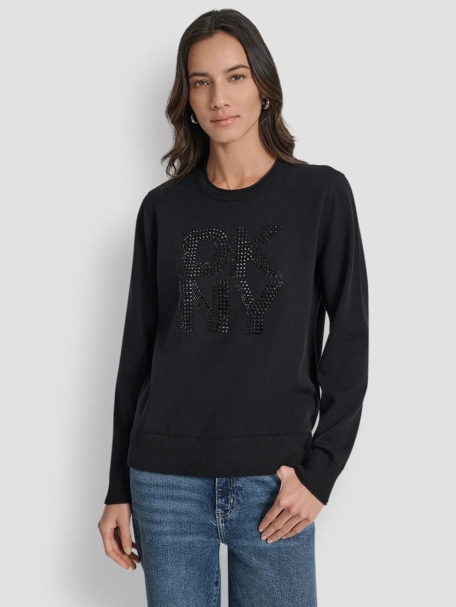 Женский трикотажный джемпер из натурального хлопка с фирменным логотипом, украшенным стразами. Идеальный выбор для современных повседневных образов.