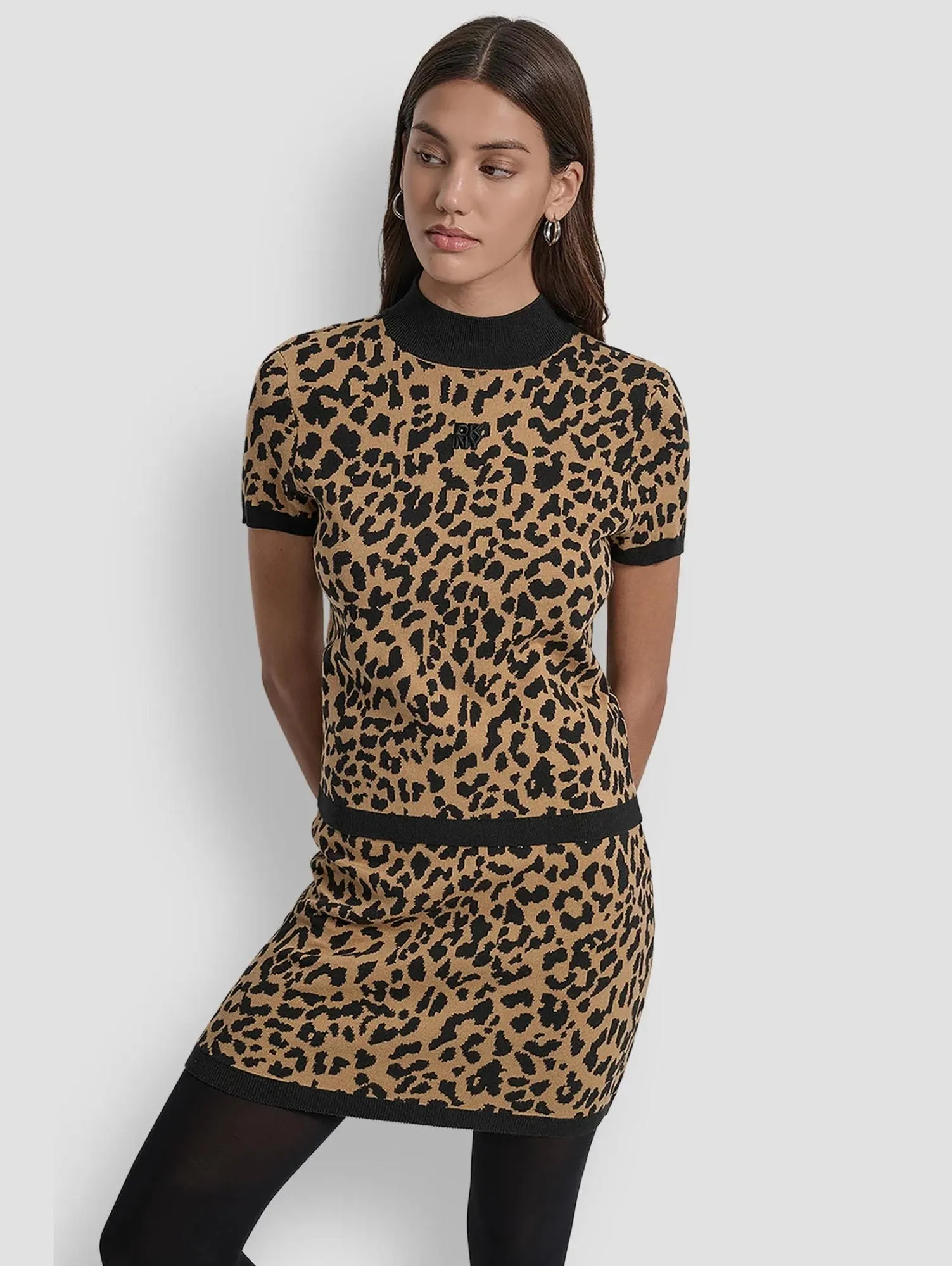 Женский топ с анималистичным принтом DKNY с короткими рукавами и воротником-стойкой — стильная база с фирменным акцентом. Лаконичный силуэт подчеркивает элегантность, а мягкая смесь хлопка, вискозы и нейлона дарит комфорт и отличную посадку.