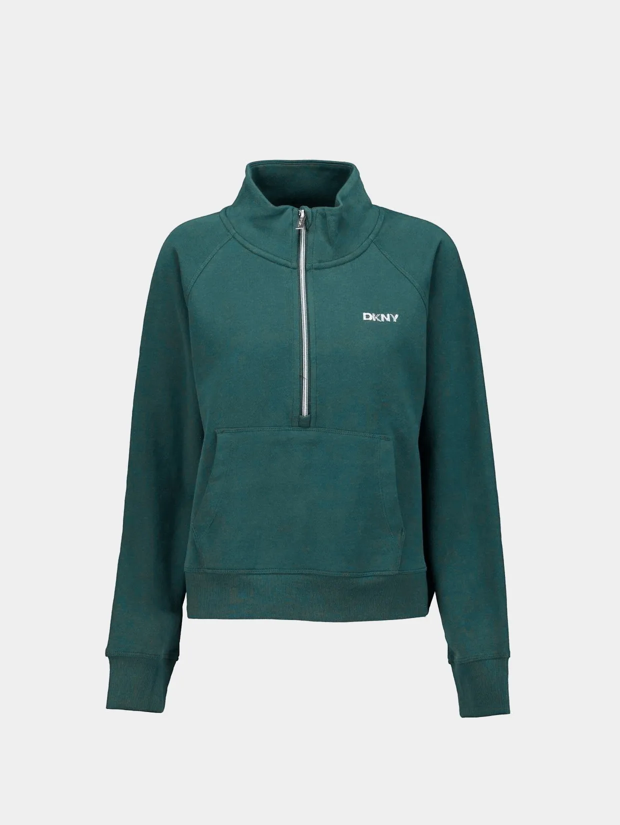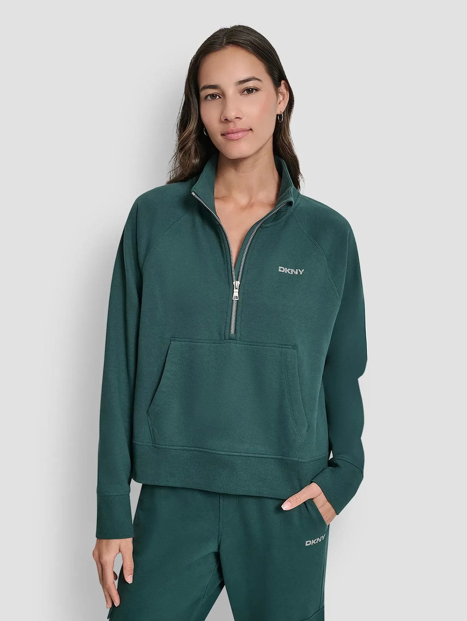 Женская толстовка на 1/2 молнии из мягкого хлопкового флиса — комфортная модель для переходного сезона в спортивном стиле. Свободный укороченный крой со спущенной линией плеч и воротником-стойкой обеспечивает лёгкое движение. Логотип из страз добавляет акцент, а карман-кенгуру делает образ ещё удобнее.