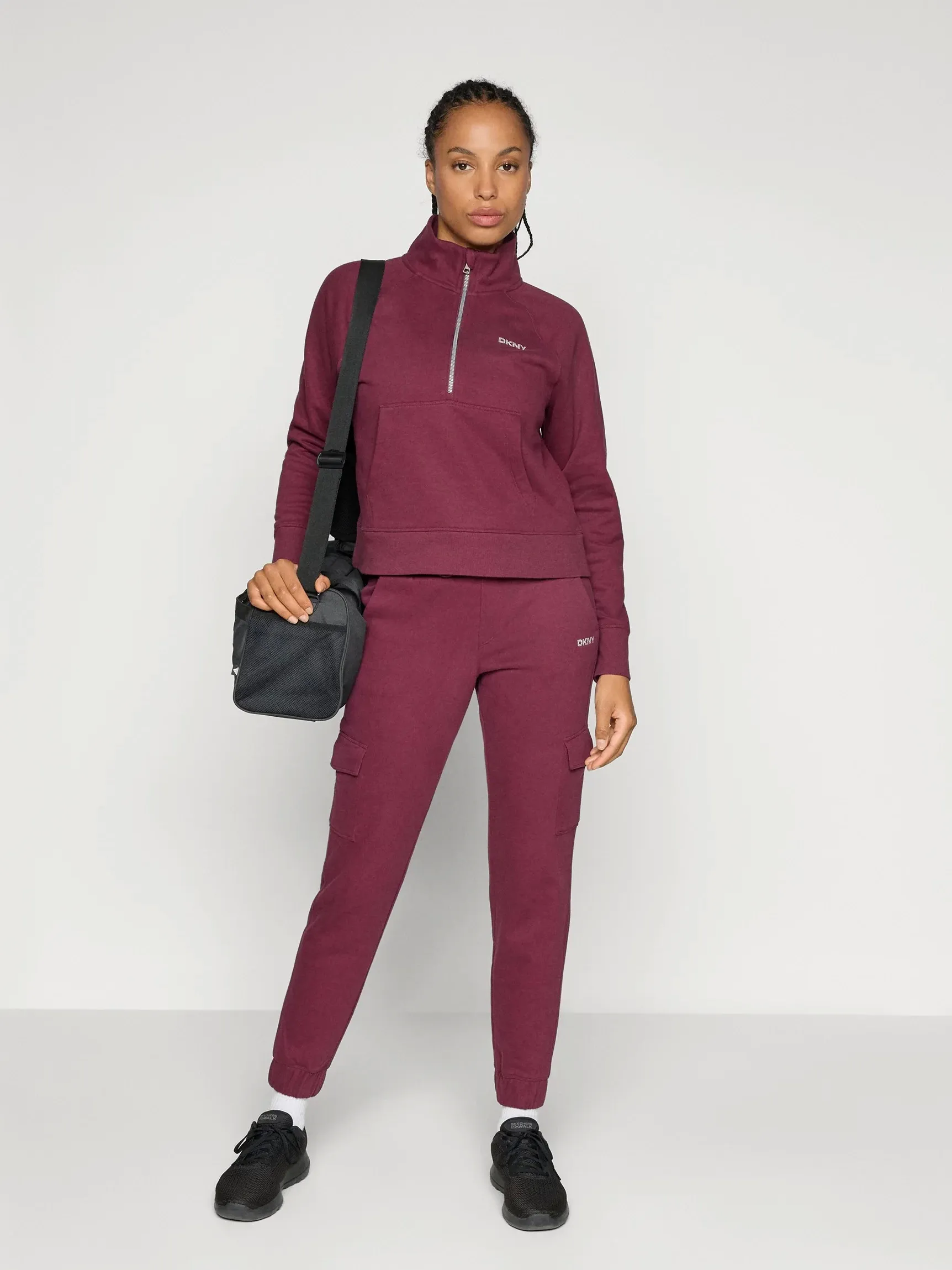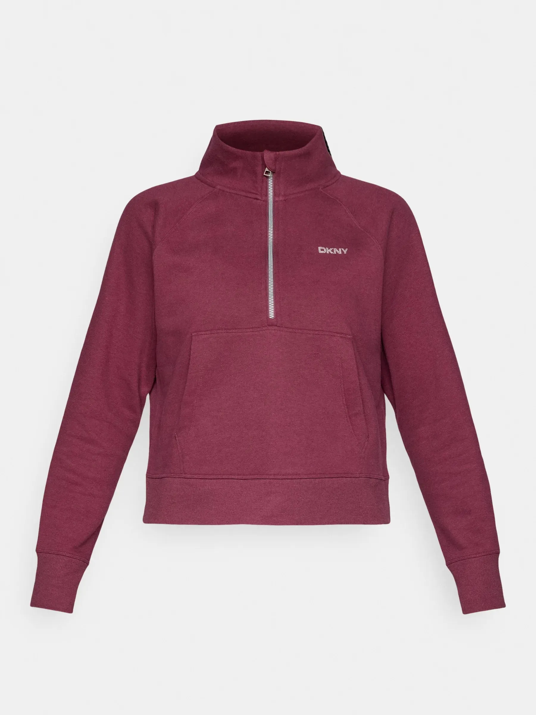 Женская толстовка на 1/2 молнии из мягкого хлопкового флиса — комфортная модель для переходного сезона в спортивном стиле. Свободный укороченный крой со спущенной линией плеч и воротником-стойкой обеспечивает лёгкое движение. Логотип из страз добавляет акцент, а карман-кенгуру делает образ ещё удобнее.