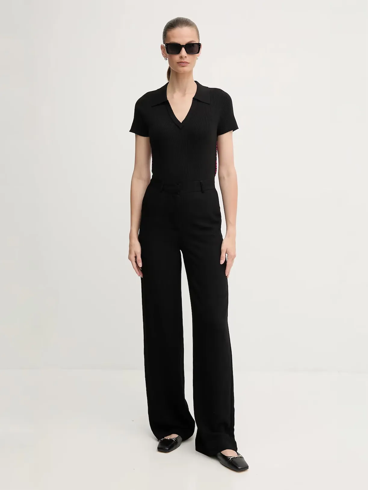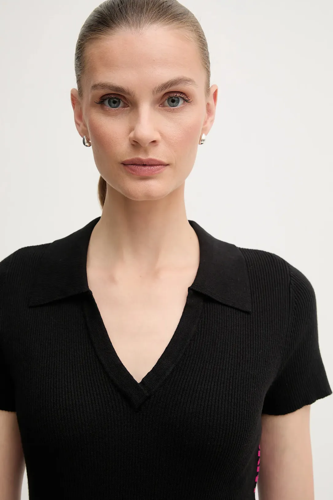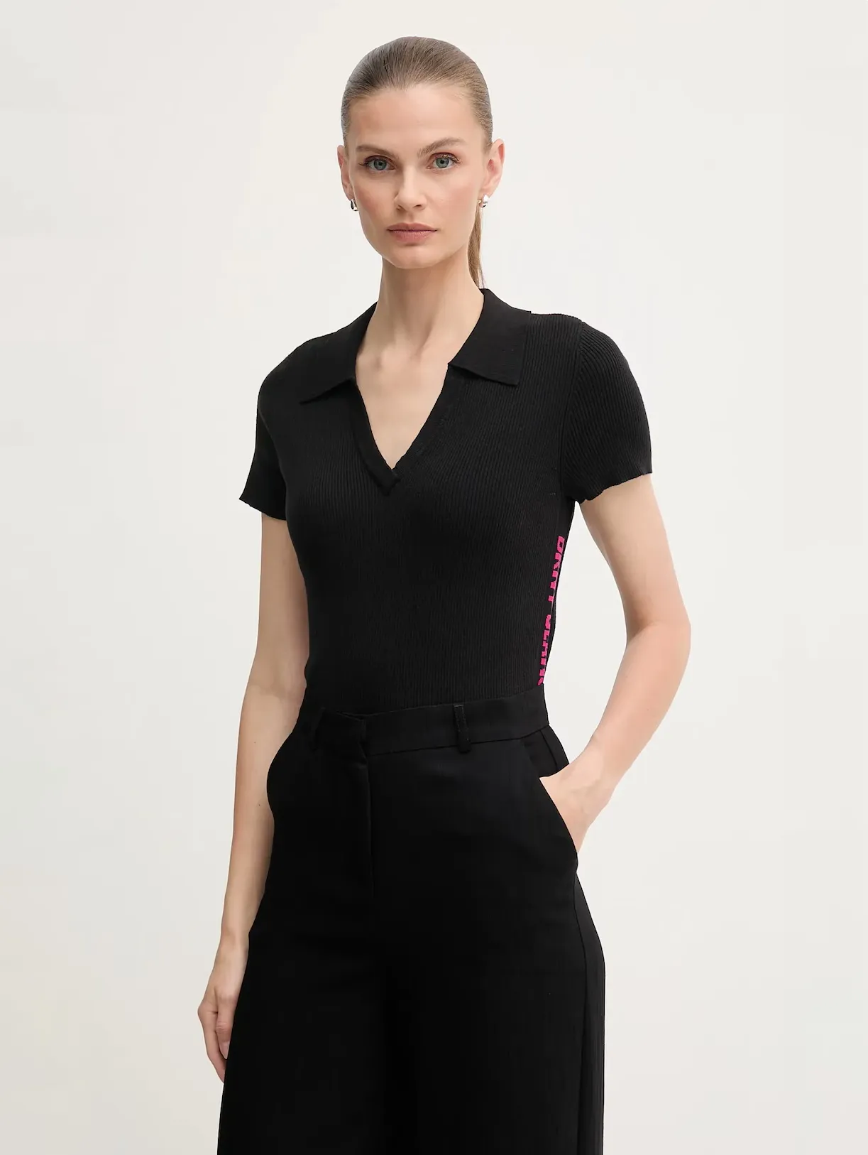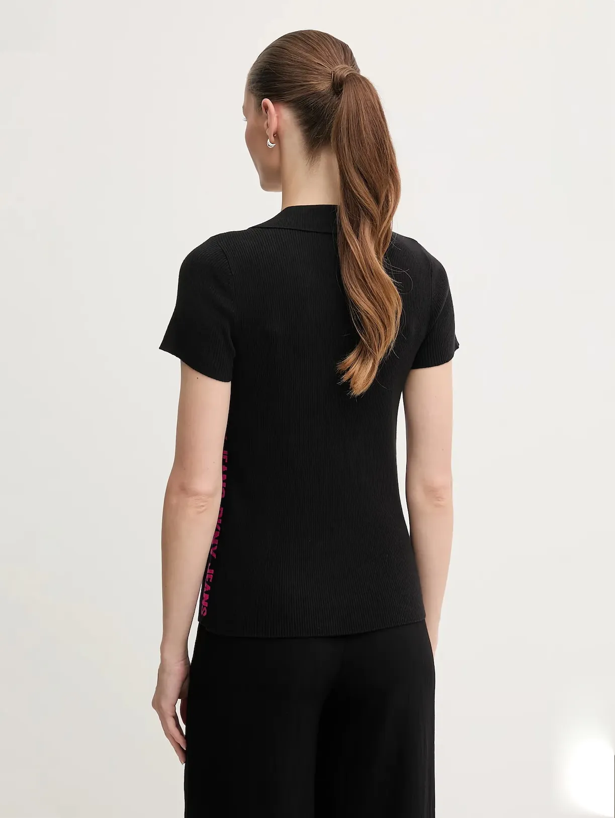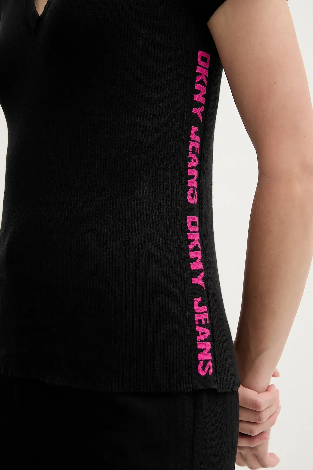 Пуловер черного цвета из коллекции DKNY выполнен из эластичного трикотажа средней плотности с высоким содержанием хлопка. Материал приятен к телу, дышащий и комфортный в повседневной носке. Модель с приталенным силуэтом подчёркивает фигуру. V-образный вырез и мягкий воротник придают образу женственность и актуальность. Короткие рукава и трикотаж в рубчик делают пуловер универсальным элементом гардероба — он прекрасно сочетается как с джинсами, так и с юбками.
