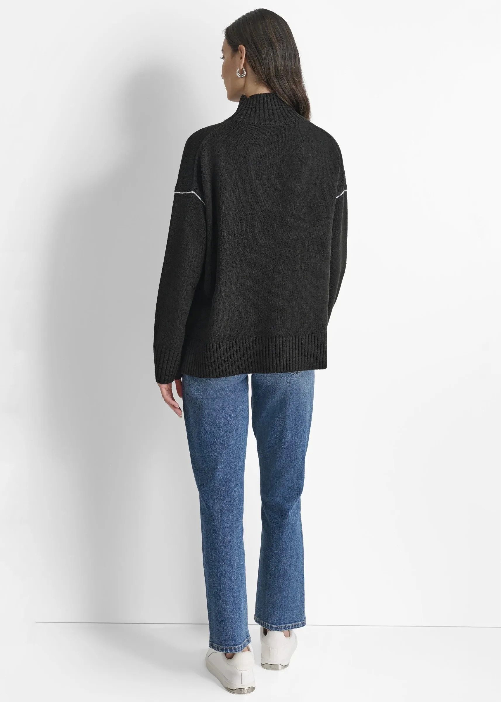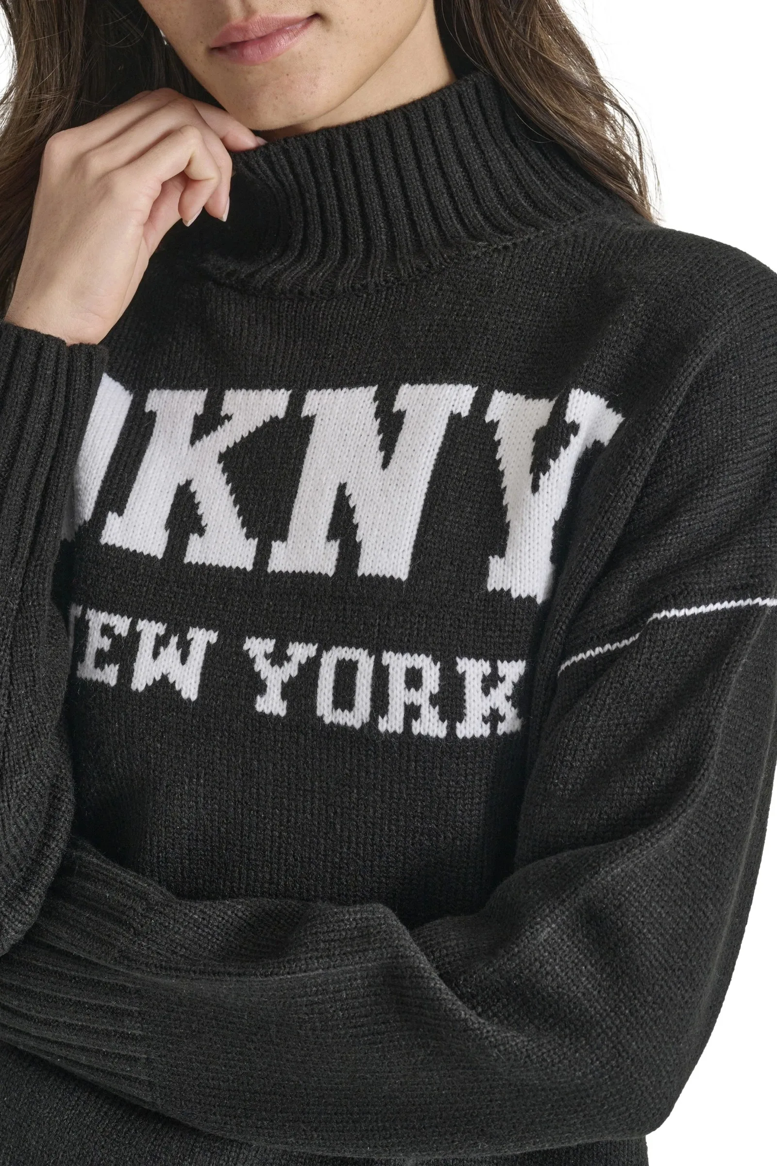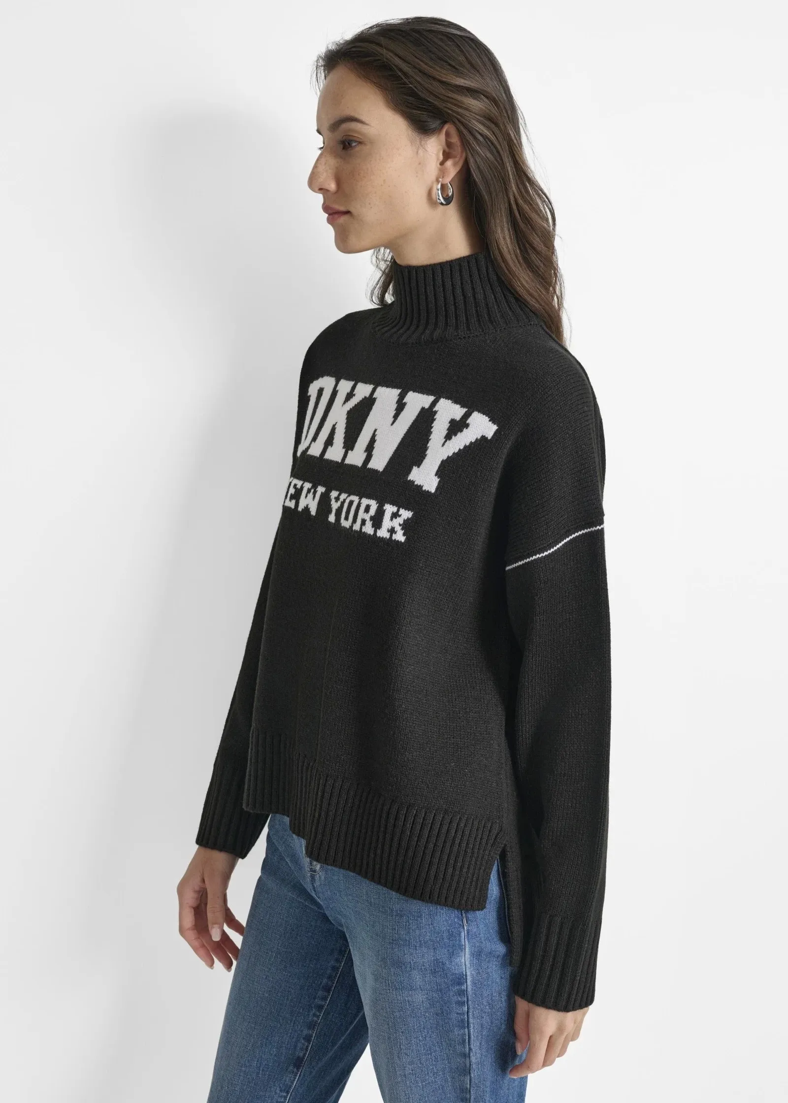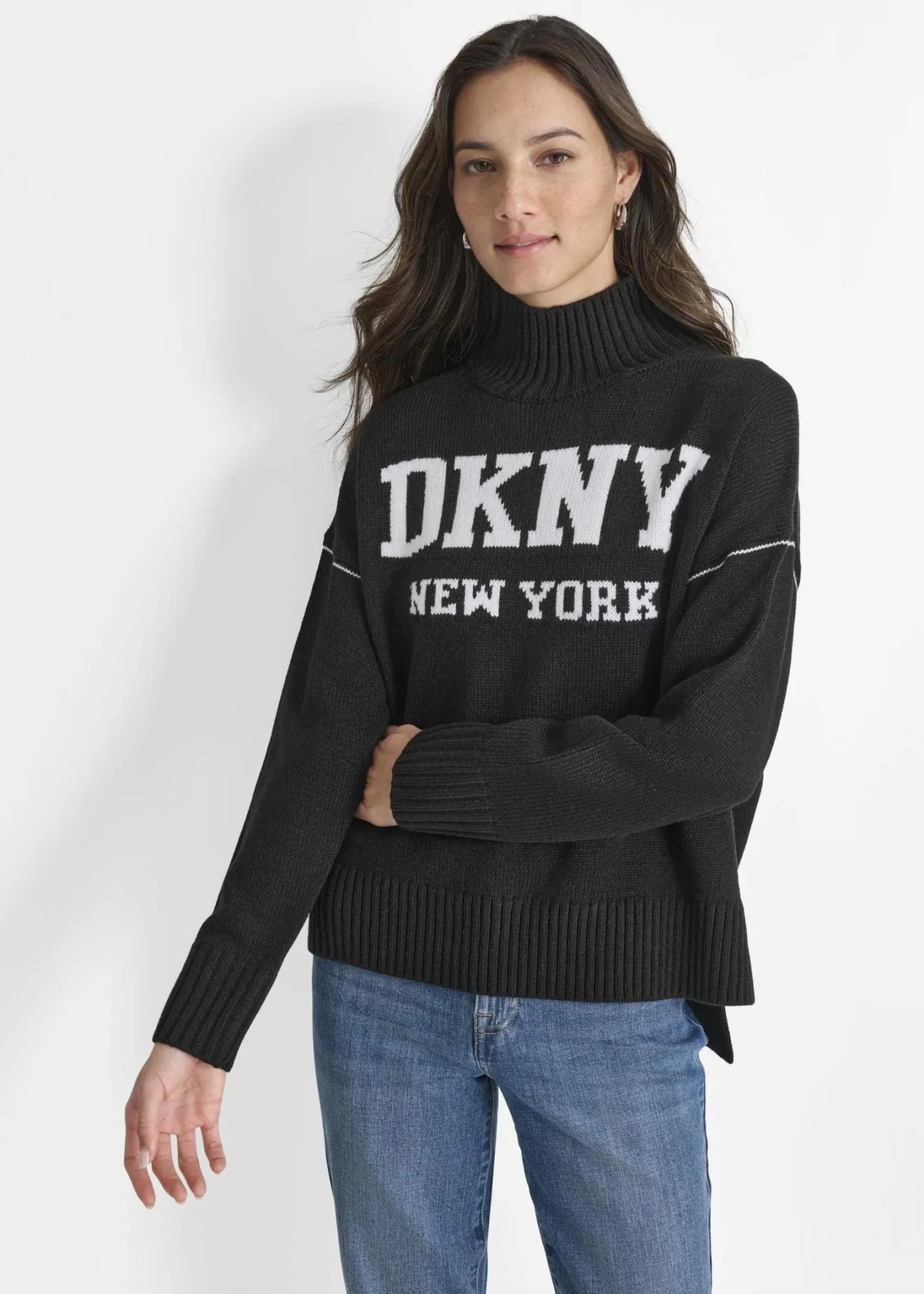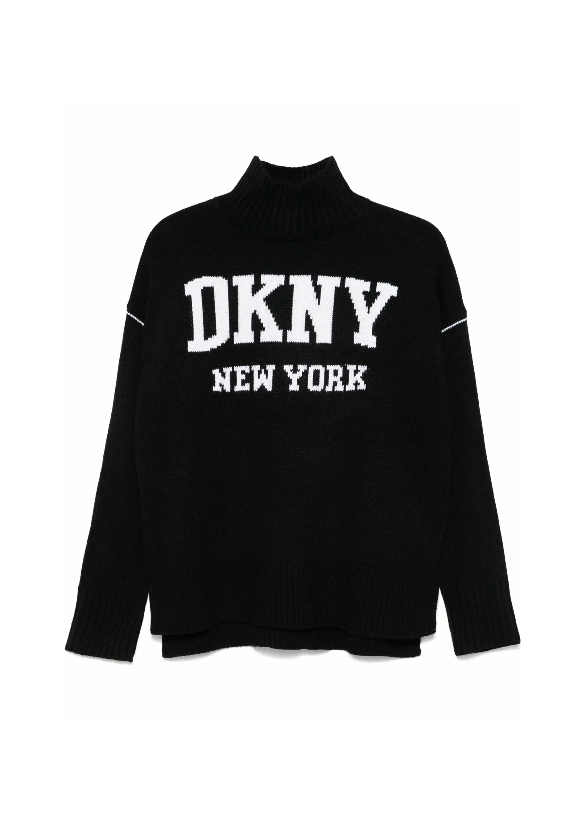 Женский черный свитер свободного кроя с контрастным логотипом DKNY спереди — идеальный выбор для комфортных и стильных повседневных образов. Простая, но модная модель, которая легко впишется в ваш гардероб.