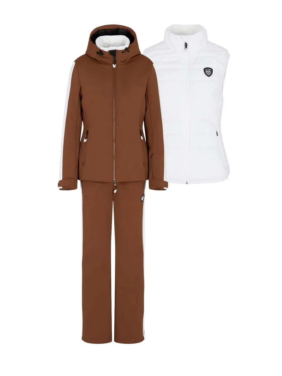 Комплект включает лыжную куртку с капюшоном, жилет на молнии и брюки с внутренними гетрами и молниями внизу брючин. Куртка дополнена инновационной подкладкой STRATUM7 RECYCLED из микрофибры, которая поддерживает оптимальный температурный баланс, формируя эффективный тепловой барьер и отводя влагу от тела во время активности.
