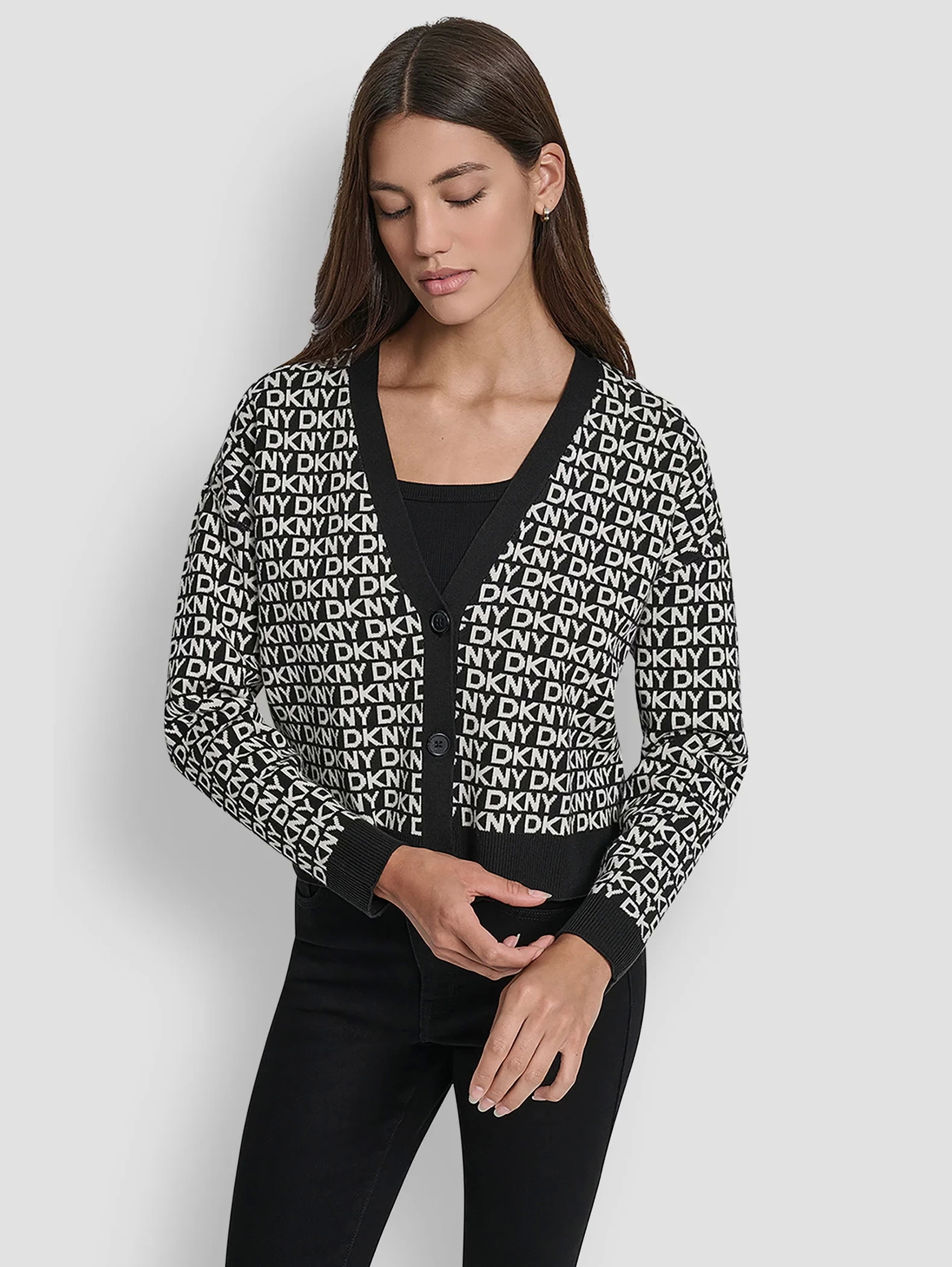 Женский укороченный кардиган DKNY с логотипом сочетает классику и современные акценты. Лаконичный V-образный вырез и пуговицы, мягкий хлопковый трикотаж и фирменный узор — всё, что нужно для стильного и комфортного осеннего образа.
